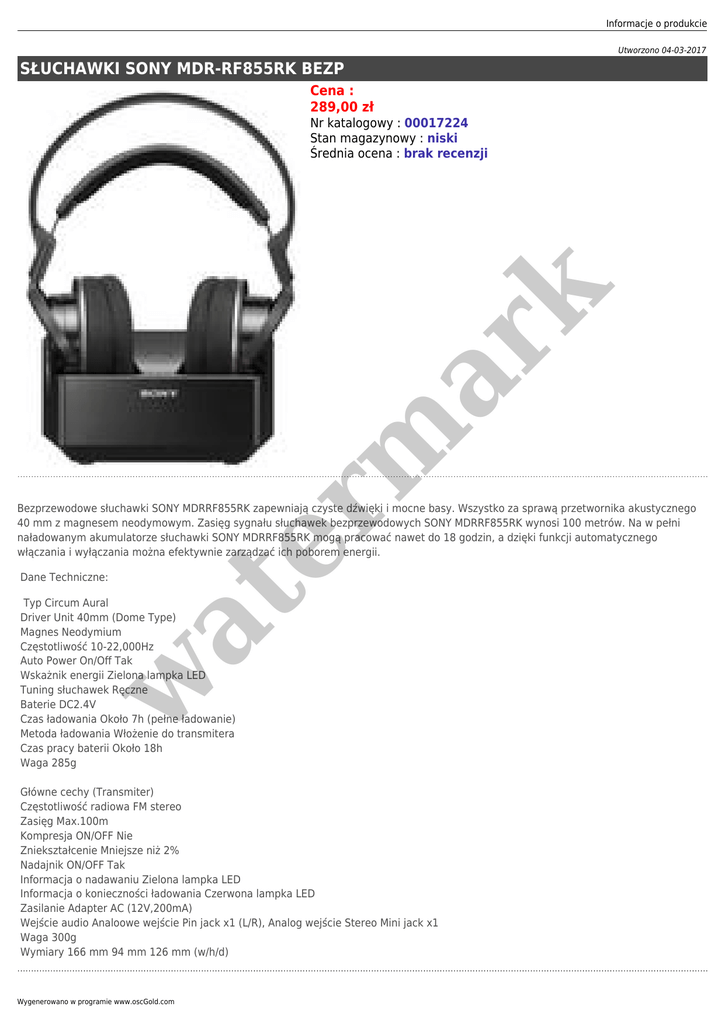 Informacje o produkcie Utworzono 04-03-2017 SŁUCHAWKI SONY MDR-RF855RK BEZP Cena : 289,00 zł er m ar k Nr katalogowy : 00017224 Stan magazynowy : niski Średnia ocena : brak recenzji Bezprzewodowe słuchawki SONY MDRRF855RK zapewniają czyste dźwięki i mocne basy. Wszystko za sprawą przetwornika akustycznego 40 mm z magnesem neodymowym. Zasięg sygnału słuchawek bezprzewodowych SONY MDRRF855RK wynosi 100 metrów. Na w pełni naładowanym akumulatorze słuchawki SONY MDRRF855RK mogą pracować nawet do 18 godzin, a dzięki funkcji automatycznego włączania i wyłączania można efektywnie zarządzać ich poborem energii. at Dane Techniczne: w Typ Circum Aural Driver Unit 40mm (Dome Type) Magnes Neodymium Częstotliwość 10-22,000Hz Auto Power On/Off Tak Wskażnik energii Zielona lampka LED Tuning słuchawek Ręczne Baterie DC2.4V Czas ładowania Około 7h (pełne ładowanie) Metoda ładowania Włożenie do transmitera Czas pracy baterii Około 18h Waga 285g Główne cechy (Transmiter) Częstotliwość radiowa FM stereo Zasięg Max.100m Kompresja ON/OFF Nie Zniekształcenie Mniejsze niż 2% Nadajnik ON/OFF Tak Informacja o nadawaniu Zielona lampka LED Informacja o konieczności ładowania Czerwona lampka LED Zasilanie Adapter AC (12V,200mA) Wejście audio Analoowe wejście Pin jack x1 (L/R), Analog wejście Stereo Mini jack x1 Waga 300g Wymiary 166 mm 94 mm 126 mm (w/h/d) Wygenerowano w programie www.oscGold.com