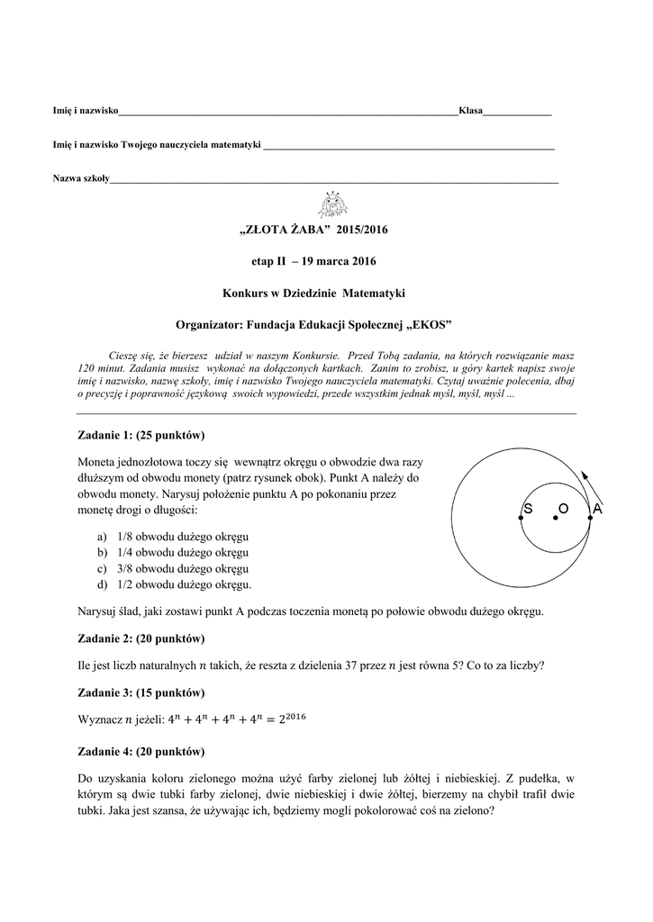 Imię i nazwisko_____________________________________________________________________Klasa______________ Imię i nazwisko Twojego nauczyciela matematyki ___________________________________________________________ Nazwa szkoły___________________________________________________________________________________________ „ZŁOTA ŻABA” 2015/2016 etap II – 19 marca 2016 Konkurs w Dziedzinie Matematyki Organizator: Fundacja Edukacji Społecznej „EKOS” Cieszę się, że bierzesz udział w naszym Konkursie. Przed Tobą zadania, na których rozwiązanie masz 120 minut. Zadania musisz wykonać na dołączonych kartkach. Zanim to zrobisz, u góry kartek napisz swoje imię i nazwisko, nazwę szkoły, imię i nazwisko Twojego nauczyciela matematyki. Czytaj uważnie polecenia, dbaj o precyzję i poprawność językową swoich wypowiedzi, przede wszystkim jednak myśl, myśl, myśl ... Zadanie 1: (25 punktów) Moneta jednozłotowa toczy się wewnątrz okręgu o obwodzie dwa razy dłuższym od obwodu monety (patrz rysunek obok). Punkt A należy do obwodu monety. Narysuj położenie punktu A po pokonaniu przez monetę drogi o długości: a) b) c) d) 1/8 obwodu dużego okręgu 1/4 obwodu dużego okręgu 3/8 obwodu dużego okręgu 1/2 obwodu dużego okręgu. Narysuj ślad, jaki zostawi punkt A podczas toczenia monetą po połowie obwodu dużego okręgu. Zadanie 2: (20 punktów) Ile jest liczb naturalnych 𝑛 takich, że reszta z dzielenia 37 przez 𝑛 jest równa 5? Co to za liczby? Zadanie 3: (15 punktów) Wyznacz 𝑛 jeżeli: 4𝑛 + 4𝑛 + 4𝑛 + 4𝑛 = 22016 Zadanie 4: (20 punktów) Do uzyskania koloru zielonego można użyć farby zielonej lub żółtej i niebieskiej. Z pudełka, w którym są dwie tubki farby zielonej, dwie niebieskiej i dwie żółtej, bierzemy na chybił trafił dwie tubki. Jaka jest szansa, że używając ich, będziemy mogli pokolorować coś na zielono? Zadanie 5: (20 punktów) W trapezie o podstawach 5 i 10 poprowadzono przez punkt przecięcia przekątnych odcinek równoległy do podstaw i łączący ramiona. Oblicz jego długość. Zadanie 6: (30 punktów) Sklejono 4 kostki do gry w kształt prostopadłościanu o jednej kostce w podstawie. Ile co najwyżej oczek może być na zewnętrznych ściankach tego prostopadłościanu? A ile najmniej? Rozwiąż analogiczne zadanie dla prostopadłościanu mającego w podstawie 4 kostki. Zadanie 7: (30 punktów) Trzy małe żabki i 3 duże żaby stoją na planszy. Należy zamienić żaby z żabkami miejscami przesuwając je na sąsiedni pusty kwadrat, lub przeskakując przez żabę (żabkę) na pusty kwadrat. Ile najmniej ruchów trzeba wykonać, by dokonać tej zamiany? Pola oznaczone bocianami są oczywiście zakazane. Kolejne ruchy opisz numerami kratek. 1 2 3 4 5 6 7 8 9 Zadanie 8: (40 punktów) (zadanie z poprzednich edycji) Do dwóch okręgów stycznych zewnętrznie poprowadzono wspólną prostą styczną. Oblicz pole figury zawartej między styczną i okręgami, wiedząc, że promień jednego z okręgów ma długość 2, a drugiego 6.