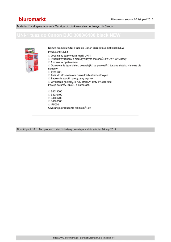 biuromarkt Utworzono: sobota, 07 listopad 2015 MateriaĹ y eksploatacyjne > Cartrige do drukarek atramentowych > Canon UNi-1 tusz do Canon BJC 3000/6100 black NEW Nazwa produktu: UNi-1 tusz do Canon BJC 3000/6100 black NEW Producent: UNI-1 Oryginalny czarny tusz marki UNi-1 Produkt wykonany z nieuĹźywanych materiaĹ ow , w 100% nowy 1 sztuka w opakowaniu Opakowanie typu blister, pozwalajÄ ce powiesiÄ tusz na stojaku - istotne dla sklepow Typ: 3BK Tusz do stosowania w drukarkach atramentowych Zapewnia szybki i precyzyjny wydruk Wystarcza na okoĹ o 420 stron A4 przy 5% zadruku Pasuje do urzÄ dzeĹ o numerach: BJC 3000 BJC 6100 BJC 6200 BJC 6500 iP5000 Gwarancja producenta 18 miesiÄ cy DostÄ pnoĹ Ä : Ten produkt zostaĹ dodany do sklepu w dniu sobota, 26 luty 2011 http://www.biuromarkt.pl | [email protected] | | Strona 1/1