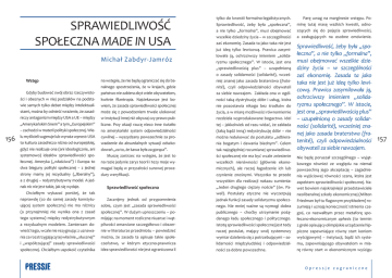 SPRAWIEDLIWOŚĆ SPOŁECZNA MADE IN USA Michał Zabdyr-Jamróz Wstęp 156 Gdyby budować swój obraz rzeczywistości i obecnych w niej podziałów na podstawie samych tylko debat między intelektualistami, można by odnieść wrażenie, że zasadniczy antagonizm między USA a UE – między „Amerykańskim Snem” a tym „Europejskim” – zachodzi w materii polityki społecznej. Wielu myślicieli sugeruje lub wyraża wprost: USA to kultura zasadniczo różna od europejskiej, gdyż nie realizuje ona (ani ideologicznie, ani systemowo) ideałów sprawiedliwości społecznej. Ameryka („właściwa”) i Europa to dwa bieguny polityki społecznej – z jednej strony mamy jej rezydualny („liberalny”), a z drugiej – redystrybutywny model. A jednak nic nie jest takie, jak się wydaje. na wstępie, że nie będę ograniczać się do banalnego spostrzeżenia, że w krajach, gdzie państwo nie zabiera zbyt wiele obywatelom, kwitnie filantropia. Najciekawsze jest bowiem, że zasada sprawiedliwości społecznej może się z powodzeniem trwale ulokować w instytucji innej niż obyczaj czy prawo publiczne. Przy okazji rzucę nieco inne światło na amerykański system odpowiedzialności cywilnej – wyszydzany powszechnie za prowadzenie do absurdalnych sytuacji odszkodowań „za to, że kawa była za gorąca”. Muszę zastrzec na wstępie, że jest to na razie jedynie zarys teorii i tezy moje wymagać będą w przyszłości surowej procedury weryfikacji. Sprawiedliwość społeczna Chciałbym wykazać poniżej, że tak naprawdę (co do samej zasady konstytuującej system społeczny) nie ma różnicy (a przynajmniej nie wynika ona z zasad tego systemu) między redystrybutywnym a rezydualnym modelem. Zamierzam dowieść tego, wcale nie rezygnując z uznawania za rozstrzygającą tej właśnie „słusznej” i „współczującej” zasady sprawiedliwości społecznej. Chciałbym uspokoić czytelnika Zacznijmy jednak od przypomnienia sobie, czym jest „zasada sprawiedliwości społecznej”. W dużym uproszczeniu – pomijając na moment rozliczne niuanse i wątpliwości omawiane szczegółowo i obszernie w literaturze przedmiotu – powiedzieć można, że zasada ta opisuje takie społeczeństwo, w którym etyczno-prawnicza idea sprawiedliwości nie jest ograniczona li tylko do kwestii formalno-legalistycznych. Sprawiedliwość, żeby była „społeczna”, a nie tylko „formalna”, musi obejmować wszelkie dziedziny życia – w szczególności zaś ekonomię. Zasada ta jako taka nie jest już ideą tylko lewicową. Prawica zasymilowała ją, ochrzciwszy imieniem „solidaryzmu społecznego”. W istocie, jest ona „sprawiedliwością plus” – uzupełnioną o zasady solidarności (solidarité), wcześniej znanej jako zasada braterstwa (fratenité), czyli odpowiedzialności obywateli za siebie nawzajem. Zakłada ona w ogólności taką dystrybucję dóbr i usług, która nie pozostawia nikogo bez środków do życia, a w miarę możliwości równomiernie rozdziela wyprodukowane bogactwo. Idei tej – jakkolwiek od razu widać, że zakłada (taką bądź inną) redystrybucję dóbr – nie można redukować do postulatu „odbierania bogatym i dawania biednym”. Celem tak najoględniej rozumianej sprawiedliwości społecznej nie ma być wcale zniesienie wszelkich nierówności (głównie ekonomicznych), ale raczej łagodzenie ich lub czynienie znośnymi. Wszystko to przede wszystkim dla realizacji nakazu sumienia: „Jeden drugiego ciężary noście” (św. Paweł). Postulaty etyczne nie wyczerpują jednak funkcji zasady solidaryzmu społecznego. Nie mniej ważne są wymogi dobra publicznego – choćby utrzymanie pożądanego ładu społecznego i politycznego. Istotą sprawiedliwości społecznej jest tedy raczej postulat, mający swój systemowy wymiar dzielenia się z potrzebującymi – solidarności międzyludzkiej i odpowiedzialności za dobro powszechne. Parę uwag na marginesie wstępu. Pominę tutaj masę ważkich kwestii, odnoszących się do pojęcia sprawiedliwości, a zasługujących na osobne omówienie. Sprawiedliwość, żeby była „społeczna”, a nie tylko „formalna”, musi obejmować wszelkie dziedziny życia – w szczególności zaś ekonomię. Zasada ta jako taka nie jest już ideą tylko lewicową. Prawica zasymilowała ją, ochrzciwszy imieniem „solidaryzmu społecznego”. W istocie, jest ona „sprawiedliwością plus” – uzupełnioną o zasady solidarności (solidarité), wcześniej znanej jako zasada braterstwa (fratenité), czyli odpowiedzialności obywateli za siebie nawzajem. Nie będę poruszał szczególnego – wyjątkowego również ze względu na niemal powszechną jego akceptację – zagadnienia wyjściowej równości szans, która jest aspektem sprawiedliwości społecznej. Nawet bowiem najskrajniejsi przedstawiciele neoliberalnej szkoły ekonomicznej (Milton Friedman był tu flagowym przykładem) rozumieją i uznają konieczność istnienia czegoś, co nazwałbym przez metaforę społeczno-ekonomicznym aphesis (to termin z greki opisujący olimpijskie urządzenie hippiczne zapewniające równy start koniom wyścigowym) – instytucji, bądź ich systemu, zapewniającego obywatelom w miarę równy start w ekonomicznym wyścigu Opressje zagraniczne 157 158 na wolnym rynku. Pragnę wtrącić jedynie pewną uwagę, którą również należałoby rozwinąć, ale przy innej okazji. Omawiana idea sprawiedliwości społecznej zawiera w sobie termin sprawiedliwość – iustitia – i tym samym zdaje się odsyłać do pojęcia uprawnienia (ius). Mając jednak na względzie powyższą uwagę o całościowym, nie po całym społeczeństwie, przy obciążeniu wprost proporcjonalnym do majętności. Beneficjentami wsparcia miałyby być raczej osoby, które znalazły się w sytuacjach wyjątkowych, ocenianych jako niezawinione (popadły w biedę, zapadły poważnie na zdrowiu itd.). Wcale nie ma znaczenia to, czy osoba pokrzywdzona jest z powod