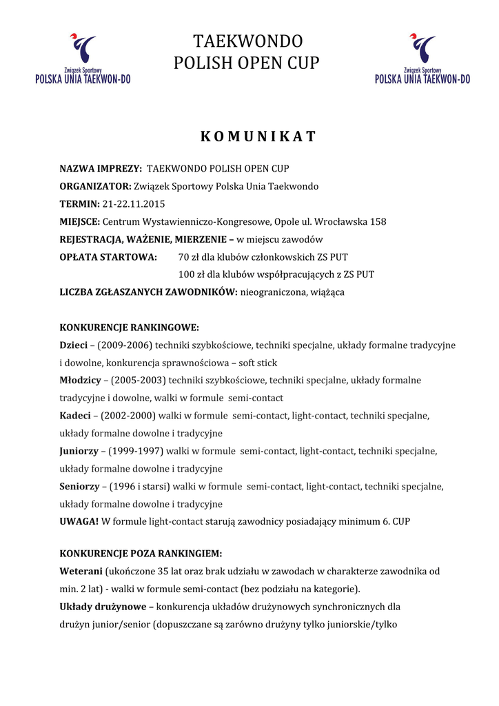 TAEKWONDO POLISH OPEN CUP KOMUNIKAT NAZWA IMPREZY: TAEKWONDO POLISH OPEN CUP ORGANIZATOR: Związek Sportowy Polska Unia Taekwondo TERMIN: 21-22.11.2015 MIEJSCE: Centrum Wystawienniczo-Kongresowe, Opole ul. Wrocławska 158 REJESTRACJA, WAŻENIE, MIERZENIE – w miejscu zawodów OPŁATA STARTOWA: 70 zł dla klubów członkowskich ZS PUT 100 zł dla klubów współpracujących z ZS PUT LICZBA ZGŁASZANYCH ZAWODNIKÓW: nieograniczona, wiążąca KONKURENCJE RANKINGOWE: Dzieci – (2009-2006) techniki szybkościowe, techniki specjalne, układy formalne tradycyjne i dowolne, konkurencja sprawnościowa – soft stick Młodzicy – (2005-2003) techniki szybkościowe, techniki specjalne, układy formalne tradycyjne i dowolne, walki w formule semi-contact Kadeci – (2002-2000) walki w formule semi-contact, light-contact, techniki specjalne, układy formalne dowolne i tradycyjne Juniorzy – (1999-1997) walki w formule semi-contact, light-contact, techniki specjalne, układy formalne dowolne i tradycyjne Seniorzy – (1996 i starsi) walki w formule semi-contact, light-contact, techniki specjalne, układy formalne dowolne i tradycyjne UWAGA! W formule light-contact starują zawodnicy posiadający minimum 6. CUP KONKURENCJE POZA RANKINGIEM: Weterani (ukończone 35 lat oraz brak udziału w zawodach w charakterze zawodnika od min. 2 lat) - walki w formule semi-contact (bez podziału na kategorie). Układy drużynowe – konkurencja układów drużynowych synchronicznych dla drużyn junior/senior (dopuszczane są zarówno drużyny tylko juniorskie/tylko TAEKWONDO POLISH OPEN CUP seniorskie jak i drużyny mieszane, juniorsko-seniorskie). Konkurencja rozegrana będzie bez podziału na stopnie. Soft stick – dla młodzików, którzy nie biorą udziału w walkach. Podział na grupy uzależniony od zgłoszeń. SĘDZIOWIE: 1 sędzia na rozpoczętą ósemkę zawodników REGULAMIN ZAWODÓW Podział na kategorie, obsada sędziowska, ubiory sędziów i zawodników, sprzęt ochronny: zgodnie z Regulaminem ZS PUT: http://www.put.org.pl/wp-content/uploads/2011/01/regulamin-4.11.1.pdf. NAGRODY: medale tłoczone oraz dyplomy. UBEZPIECZENIE: ubezpieczenie NNW dla zawodników – zapewniają kluby we własnym zakresie. Organizator nie ponosi odpowiedzialności za ewentualne wypadki na zawodach. OPIEKA MEDYCZNA ZAWODÓW: zapewnia organizator WYŻYWIENIE i NOCLEGI: we własnym zakresie. Organizator zarezerwował noclegi w: Hotel Festival/Hotel De Silva –Opole, ul. Oleska 86- sędziowie, ekipy zagraniczne Dom Sportowca – Novum, Opole ul. Kowalska 4– pokoje 2,3,4,5,6,7 osobowe – 75 miejsc Szkolne Schronisko Młodzieżowe „Niezapominajka” – pokoje 2,3,4 osobowe – 55 miejsc Rezerwacja noclegów – telefonicznie 888 88 77 40. WAŻENIE I REJESTRACJA: Piątek 20.11.2015r. 18:00-21:00 waga i rejestracja drużyn (dzieci, młodzik, kadet, junior, senior) Sobota 21.11.2015r. 7:30-8:45 - kategoria dzieci (rejestrują trenerzy) TAEKWONDO POLISH OPEN CUP 7:30- 11:00 - kategoria młodzik (obowiązkowa rejestracja) 14:00-16:00 i 19:00-20:00 - kategoria kadet, junior, senior Niedziela 22.11.2015r. 7:30-9.00 Waga i rejestracja drużyn – kadet, junior i senior Uwaga – godziny rejestracji będą ściśle przestrzegane. Warunkiem startu w zawodach jest wcześniejsza rejestracja. Zawodnik rejestruje się tylko raz. Osoba, która nie przejdzie pozytywnie rejestracji, nie zostanie dopuszczona do turnieju! PLAN ZAWODÓW: Sobota 21.11.2015r. 09:00-13:00 Wszystkie konkurencje dzieci 13:30-14:00 Oficjalne rozpoczęcie zawodów 14:00-19:00 wszystkie konkurencje młodzików Niedziela 23.11.2014r. 09:30-11:30 Rozpoczęcie konkurencji kadetów, juniorów i seniorów (układy formalne indywidualne i drużynowe) 10:00-20:00 Konkurencja techniki specjalne kadetów, juniorów i seniorów 11:30-20:00 Konkurencje walk kadetów, juniorów i seniorów 20:00-Planowane zakończenie zawodów ZGŁOSZENIA ZAWODNIKÓW: Za pomocą programu rejestrującego dostępnego pod adresem http://www.put.org.pl/zapisy/ . Zgłoszenia sędziów i zawodników i drużyn do konkurencji dodatkowych na adres: [email protected]. Termin nadsyłania zgłoszeń: do dnia 18.11.2015. KONTAKT Z ORGANIZATOREM: 888 88 77 40, 505-074-423. DOSTĘP DO PROGRAMU REJESTRACYJNEGO (LOGIN, HASŁO): Marta Brylińska, tel. 535-174-423 e-mail: [email protected] TAEKWONDO POLISH OPEN CUP Warunki uczestnictwa: - zgłoszenie w terminie; - opłacenie startowego; - opłacenie licencji PUT na rok 2015 – 30 PLN; - ważne badania lekarskie od lekarza sportowego w książeczce sportowca [Badania ważne są 6 miesięcy]- dotyczy: młodzików, kadetów, juniorów, seniorów- do 23. roku życia; - oświadczenie o stanie zdrowia dla osób powyżej 23 roku życia; - oświadczenie rodziców/prawnych opiekunów dla dzieci (roczniki 2009- 2006); - zezwolenie rodziców na udział w zawodach dla osób niepełnoletnich; - posiadanie polisy NNW dla zawodników na dzień zawodów oraz dojazd. Zapraszamy do odwiedzenia strony wydarzenia w serwisie Facebook: https://www.facebook.com/events/1043646495645575/