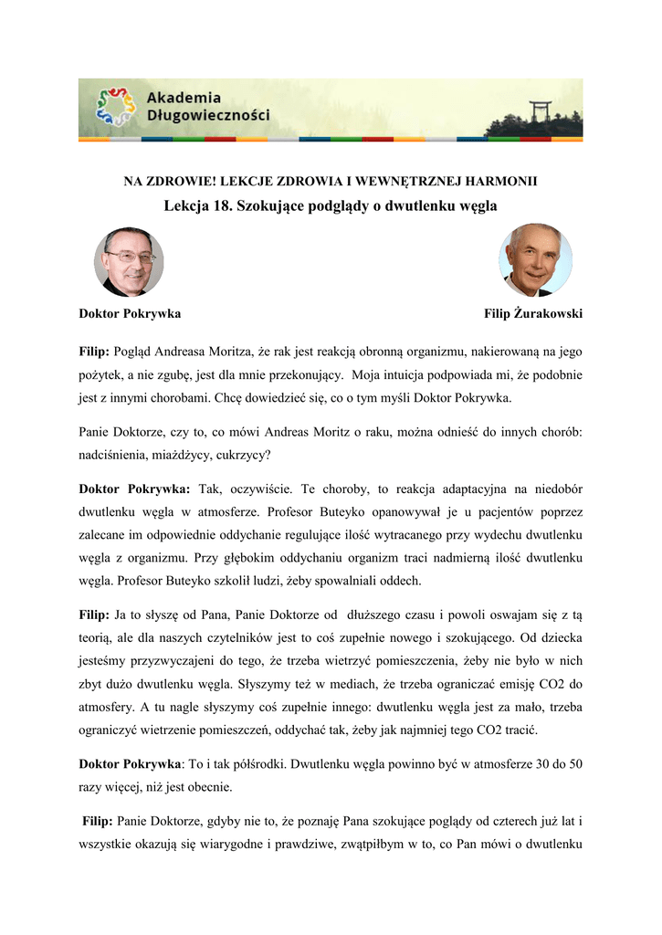 NA ZDROWIE! LEKCJE ZDROWIA I WEWNĘTRZNEJ HARMONII Lekcja 18. Szokujące podglądy o dwutlenku węgla Doktor Pokrywka Filip Żurakowski Filip: Pogląd Andreasa Moritza, że rak jest reakcją obronną organizmu, nakierowaną na jego pożytek, a nie zgubę, jest dla mnie przekonujący. Moja intuicja podpowiada mi, że podobnie jest z innymi chorobami. Chcę dowiedzieć się, co o tym myśli Doktor Pokrywka. Panie Doktorze, czy to, co mówi Andreas Moritz o raku, można odnieść do innych chorób: nadciśnienia, miażdżycy, cukrzycy? Doktor Pokrywka: Tak, oczywiście. Te choroby, to reakcja adaptacyjna na niedobór dwutlenku węgla w atmosferze. Profesor Buteyko opanowywał je u pacjentów poprzez zalecane im odpowiednie oddychanie regulujące ilość wytracanego przy wydechu dwutlenku węgla z organizmu. Przy głębokim oddychaniu organizm traci nadmierną ilość dwutlenku węgla. Profesor Buteyko szkolił ludzi, żeby spowalniali oddech. Filip: Ja to słyszę od Pana, Panie Doktorze od dłuższego czasu i powoli oswajam się z tą teorią, ale dla naszych czytelników jest to coś zupełnie nowego i szokującego. Od dziecka jesteśmy przyzwyczajeni do tego, że trzeba wietrzyć pomieszczenia, żeby nie było w nich zbyt dużo dwutlenku węgla. Słyszymy też w mediach, że trzeba ograniczać emisję CO2 do atmosfery. A tu nagle słyszymy coś zupełnie innego: dwutlenku węgla jest za mało, trzeba ograniczyć wietrzenie pomieszczeń, oddychać tak, żeby jak najmniej tego CO2 tracić. Doktor Pokrywka: To i tak półśrodki. Dwutlenku węgla powinno być w atmosferze 30 do 50 razy więcej, niż jest obecnie. Filip: Panie Doktorze, gdyby nie to, że poznaję Pana szokujące poglądy od czterech już lat i wszystkie okazują się wiarygodne i prawdziwe, zwątpiłbym w to, co Pan mówi o dwutlenku węgla. Tak jak na początku naszej współpracy trudno było mi przyjąć do wiadomości i przekonania wiele innych rzeczy. Ale zgodnie z moją zasadą, że wiedza jest przyswajalna tylko w małych dawkach, zostawmy na razie dwutlenek węgla i profesora Buteyko. Proponuję kontynuować główny wątek dzisiejszej naszej rozmowy: rozróżnienie objawów od samej choroby i to, że choroba to mechanizm adaptacyjny mądrego organizmu. Od lat rozumiem to w przypadku przeziębienia. Już ponad 20 lat temu toczyłem z żoną boje o to, aby nie zbijać gorączki u naszych dzieci w czasie infekcji, bo gorączka to najskuteczniejsza broń organizmu przeciwko chorobie. Lekarze od skutków zwalczają objawy, a tego robić nie należy, bo objawy (gorączka, katar, kaszel) są pożyteczne, są elementami strategii obronnej organizmu. Organizmowi trzeba pomóc (bańki, moczenie stóp w gorącej wodzie, wypoczynek, wygrzanie się w łóżku, witaminy, suplementy), a nie przeszkadzać lekami zwalczającymi objawy. We współczesnych koloniach niewolników, czyli korporacjach jest inaczej - antybiotyk i z chorobą do roboty, nie ma leżenia, niewolnik musi zasuwać, a nie to won, za brama czeka pięciu następnych na twoje miejsce. Znam to z relacji najbliższych, na szczęście jestem wolnym człowiekiem i nie pracuję w korporacji. Doktor Pokrywka: Tak, zwalczając objaw utrudnia się uzyskiwanie przez organizm rezultatu, który organizm chce za pomocą tego objawu osiągnąć. Na przykładzie gorączki stosunkowo łatwo można to zrozumieć i wiele osób interesujących się medycyną naturalną już to zrozumiało. Trochę trudniej jest pojąć to w przypadku raka, nadciśnienia, cukrzycy i innych przewlekłych chorób. Sałatka - Przepis Justyny, fanki Doktora Pokrywki Składniki: 6 łyżek pokrojonych ananasów, 5 łyżek oliwek przekrojonych na pół, garść suszonej żurawiny, jedno opakowanie sera mozarella, pół opakowania sera feta, pół opakowania sałaty rukola, pół opakowania sałaty lodowej, porcja pasty słonecznikowej zrobiona z garści słonecznika albo garść słonecznika prażonego na patelni, garść orzeszków arachidowych, olej pieprz i sól do smaku. Pasta słonecznikowa: zmielić garść ziaren słonecznika, dodać dobry olej i czosnek. Dobry smak gwarantuje olej z pestek winogron. Jak ja to robię Kroję ser feta i mozarella w kostkę. Wszystkie pozostałe składniki rozdrabniam (kroję), mieszam wszystko w dużym emaliowanym garnku, dodaję pieprz i sól do smaku, zalewam olejem i jeszcze raz mieszam. Przekładam do ceramicznej salaterki. Komentarz Doktora Pokrywki Zawartość dużej ilości sałaty gwarantuje dostarczenie organizmowi porcji magnezu, który jak piszemy w książce „Na zdrowie” - jest zawarty we wszystkich zielonych częściach roślin. Zastosowanie serów mozarella i feta powoduje, że sałatka jest odpowiednia dla osoby z dowolną grupą krwi. Pani Justyno, to dobrze, że stosuje pani naczynia emaliowane i ceramiczne, przy kontakcie z warzywami są one najlepsze. Gdyby jeszcze kupiła pani sobie nóż ceramiczny, byłoby super. Przepis akceptuję, czytelnikom przypominam o długim gryzieniu, życzę smacznego. Coś dla ducha - pójdę własną drogą i nikt mnie nie powstrzyma Filip: Różne reakcje na mój tekst, zamieszczony w poprzedniej lekcji, m.in.: 1) ... Hej Filipie! Nikt Cię nie powstrzyma przed samym sobą ... nawet Pan Bóg, jeżeli Ty sam Mu na to nie pozwolisz mówiąc: "Niech się dzieje wola Twoja, nie moja" :) Masz wolną wolę, możesz iść gdzie chcesz. 2)… Popieram! Masz rację - ja też to mam. Za mało odwagi, żeby być sobą. Kto mi zabrania? Ja sama. Tak! Największym zaskoczeniem był mail pierwszy. Odebrałem to jako lekką przyganę i ostrzeżenie - masz nie tyle iść własną drogą, co dać się prowadzić Bogu. Inne miałem intencje pisząc ten tekst. Wbrew - ale nie wbrew woli Boga, lecz wbrew presji otoczenia, które chce uczynić cię posłusznym członkiem stada. A to stado czasem potulnie idzie na zatracenie. Warto postawić sobie pytanie, kto tym stadem manipuluje, jakie są jego interesy i intencje. Aby iść dobrą 