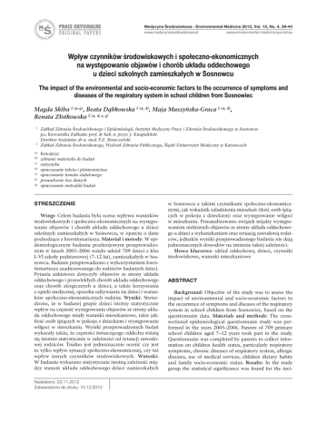 Medycyna Środowiskowa - Environmental Medicine 2012, Vol. 15, No. 4, 39-44 www.environmental-medicine-journal.eu www.medycynasrodowiskowa.pl Wpływ czynników środowiskowych i społeczno-ekonomicznych na występowanie objawów i chorób układu oddechowego u dzieci szkolnych zamieszkałych w Sosnowcu The impact of the environmental and socio-economic factors to the occurrence of symptoms and diseases of the respiratory system in school children from Sosnowiec Magda Skiba 1 (a–g), Beata Dąbkowska 1 (a, d), Maja Muszyńska-Graca 1 (a, d), Renata Złotkowska 2 (a, d, e, g) 1 2 (a) (b) (c) (d) (e) (f) (g) Zakład Zdrowia Środowiskowego i Epidemiologii, Instytut Medycyny Pracy i Zdrowia Środowiskowego w Sosnowcu p.o. Kierownika Zakładu: prof. dr hab. n. przyr. J. Kwapuliński Dyrektor Instytutu: dr n. med. P.Z. Brewczyński Zakład Zdrowia Środowiskowego, Wydział Zdrowia Publicznego, Śląski Uniwersytet Medyczny w Katowicach koncepcja zebranie materiału do badań statystyka opracowanie tekstu i piśmiennictwa opracowanie tematu statutowego prowadzenie baz danych opracowanie metodyki badań STRESZCZENIE Wstęp: Celem badania była ocena wpływu warunków środowiskowych i społeczno-ekonomicznych na występowanie objawów i chorób układu oddechowego u dzieci szkolnych zamieszkałych w Sosnowcu, w oparciu o dane pochodzące z kwestionariusza. Materiał i metody: W epidemiologicznym badaniu przekrojowym przeprowadzonym w latach 2005–2006 wzięło udział 709 dzieci z klas I–VI szkoły podstawowej (7–12 lat), zamieszkałych w Sosnowcu. Badanie przeprowadzono z wykorzystaniem kwestionariusza zaadresowanego do rodziców badanych dzieci. Pytania ankietowe dotyczyły objawów ze strony układu oddechowego i przewlekłych chorób układu oddechowego oraz chorób alergicznych u dzieci, a także korzystania z opieki medycznej, sposobu odżywiania się dzieci i warunków społeczno-ekonomicznych rodziny. Wyniki: Stwierdzono, że w badanej grupie dzieci istotny statystycznie wpływ na częstość występowania objawów ze strony układu oddechowego miały warunki mieszkaniowe, takie jak: ilość osób śpiących w pokoju z dzieckiem i występowanie wilgoci w mieszkaniu. Wyniki przeprowadzonych badań wykazały także, że częstości świszczącego oddechu różnią się istotnie statystycznie w zależności od sytuacji zawodowej rodziców. Trudno jest jednoznacznie ocenić czy jest to tylko wpływ sytuacji społeczno-ekonomicznej, czy też wpływ innych czynników środowiskowych. Wnioski: W badaniu wykazano statystycznie istotną zależność między stanem układu oddechowego dzieci zamieszkałych Nadesłano: 23.11.2012 Zatwierdzono do druku: 10.12.2012 w Sosnowcu a takimi czynnikami społeczno-ekonomicznymi, jak wskaźnik zaludnienia mieszkań (ilość osób śpiących w pokoju z dzieckiem) oraz występowanie wilgoci w mieszkaniu. Przeanalizowano związek między występowaniem niektórych objawów ze strony układu oddechowego u dzieci a wykształceniem oraz sytuacją zawodową rodziców, jednakże wyniki przeprowadzonego badania nie dają jednoznacznych dowodów na istnienie takiej zależności. Słowa kluczowe: układ oddechowy, dzieci, czynniki środowiskowe, warunki mieszkaniowe ABSTRACT Background: Objective of the study was to assess the impact of environmental and socio-economic factors to the occurrence of symptoms and diseases of the respiratory system in school children from Sosnowiec, based on the questionnaire data. Materials and methods: The crosssectional epidemiological questionnaire study was performed in the years 2005–2006. Parents of 709 primary school children aged 7–12 years took part in the study. Questionnaire was completed by parents to collect information on children health status, particularly respiratory symptoms, chronic diseases of respiratory system, allergic diseases, use of medical services, children dietary habits and family socio-economic status. Results: In the study group the statistical significance was found for the inci- 40 Medycyna Środowiskowa - Environmental Medicine 2012, Vol. 15, No. 4 Magda Skiba i wsp.: Wpływ czynników środowiskowych i społeczno-ekonomicznych na występowanie objawów i chorób układu oddechowego u dzieci… dence of respiratory symptoms in children and housing conditions, i.e.: the number of people sleeping together with a child in the same room and dampness in the dwelling. Results of the study showed, that incidence of whizzing differed statistically significantly in the groups of different professional status of the parents. It is difficult to estimate if this is only the influence of socio-economic conditions or any other environmental factors as well. Conclusions: Results of the study demonstrated statistical significance between the status of respiratory system in children and housing occupancy rate (the number of people sleeping together with a child in the same room) and dampness in the dwelling. Relation between respiratory symptoms in children, parents education and professional status was analyzed, but findings of the conducted studies do not give explicit evidence of such a relation. Key words: respiratory system, children, environmental factors, housing conditions WSTĘP du oddechowego (świszczący oddech w ciągu ostatnich 12 miesięcy, napady duszności w ciągu ostatnich 12 miesięcy) i chorób układu oddechowego (zapalenie oskrzeli) oraz chorób alergicznych (astma, pyłkowica). Ponadto pytania dotyczyły korzystania z opieki medycznej, sposobu odżywiania się i warunków społeczno-ekonomicznych, tj. sytuacji zawodowej rodziców, wykształcenia rodziców oraz warunków mieszkaniowych rodziny. Analizowano częstość występowania badanych objawów ze strony układu oddechowego oraz zależność od sytuacji zawodowej i wykształcenia rodziców i warunków mieszkaniowych takich jak: liczba osób zamieszkujących razem z dzieckiem w mieszkaniu, liczba osób śpiących wspólnie w pokoju z d