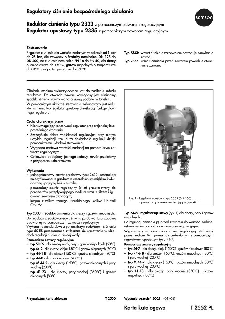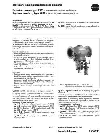 Regulatory ciœnienia bezpoœredniego dzia³ania Reduktor ciœnienia typu 2333 z pomocniczym zaworem regulacyjnym Regulator upustowy typu 2335 z pomocniczym zaworem regulacyjnym Zastosowanie Regulator ciœnienia dla wartoœci zadanych w zakresie od 1 bar do 28 bar, dla zaworów o œrednicy nominalnej DN 125 do DN 400, na ciœnienie nominalne PN 16 do PN 40, dla cieczy o temperaturze do 150°C, gazów niepalnych o temperaturze do 80°C i pary o temperaturze do 350°C. Typ 2333: wzrost ciœnienia za zaworem powoduje zamykanie zaworu. Typ 2335: wzrost ciœnienia przed zaworem powoduje otwieranie zaworu. Ciœnienie medium wykorzystywane jest do zasilania uk³adu regulatora. Do otwarcia zaworu wymagany jest minimalny spadek ciœnienia równy wartoœci Dpmin podanej w tabeli 1. W pomocniczym uk³adzie sterowania zabudowany jest reduktor ciœnienia lub regulator upustowy okreœlaj¹cy funkcjê g³ównego regulatora. Cechy charakterystyczne • Nie wymagaj¹cy konserwacji regulator proporcjonalny bezpoœredniego dzia³ania. • Szczególnie dobre w³aœciwoœci regulacyjne przy ma³ym uchybie regulacji, tzn. du¿a dok³adnoœæ regulacji dziêki pomocniczemu uk³adowi sterowania. • Wygodna nastawa wartoœci zadanej na pomocniczym zaworze regulacyjnym. • Ca³kowicie odci¹¿ony jednogniazdowy zawór przelotowy z przy³¹czem ko³nierzowym. Wykonania – jednogniazdowy zawór przelotowy typu 2422 (konstrukcja zmodyfikowana) z grzybem z uszczelnieniem miêkkim i wbudowan¹ sprê¿yn¹ bez si³ownika, – pomocniczy zawór regulacyjny (pilot) przystosowany do parametrów przep³ywaj¹cego medium wraz z filtrem i iglicowym zaworem d³awi¹cym, – korpus z ¿eliwa szarego, sferoidalnego, staliwa lub stali CrNiMo. Rys. 1 · Regulator upustowy typu 2335 (DN 150) z pomocniczym zaworem steruj¹cym typu 44-7 Typ 2333 · reduktor ciœnienia dla cieczy i gazów niepalnych. Do regulacji zredukowanego ciœnienia p2 do wartoœci zadanej ustawionej na pomocniczym zaworze regulacyjnym. Wykonanie standardowe z pomocniczym reduktorem ciœnienia typu 50 ES przeznaczone zw³aszcza do stosowania w uk³adach regulacji ciœnienia zimnej wody. Pomocnicze zawory regulacyjne – typ 50 ES · dla zimnej wody, oleju i gazów niepalnych (50°C) – typ 44-2 · dla cieczy, oleju (150°C) i gazów niepalnych (80°C) – typ 44-1 B · dla cieczy (150°C) i gazów niepalnych (80°C) – typ 44-0 · dla pary wodnej (200°C) – typ M 44-2 · dla cieczy (150°C), gazów niepalnych i pary wodnej (200°C) – typ 41-23 · dla cieczy, pary wodnej (350°C) i gazów niepalnych (80°C) Typ 2335 · regulator upustowy (rys. 1) dla cieczy, pary i gazów niepalnych. Do regulacji ciœnienia p1 przed zaworem do wartoœci zadanej ustawionej na pomocniczym zaworze regulacyjnym. Wyposa¿ony w pomocniczy zawór regulacyjny sterowany przez medium. W wykonaniu standardowym z pomocniczym regulatorem upustowym typu 44-7. Pomocnicze zawory regulacyjne – typ 44-7 · dla cieczy, oleju (150°C) i gazów niepalnych (80°C) – typ 44-6 B · dla cieczy (150°C), gazów niepalnych (80°C) i pary wodnej (200°C) – typ M 44-7 · dla cieczy (150°C), gazów niepalnych (80°C) i pary wodnej (200°C) – typ 41-73 · dla cieczy, pary wodnej (350°C) i gazów niepalnych (80°C) Przynale¿na karta zbiorcza Wydanie wrzesieñ 2005 (01/04) T 2500 Karta katalogowa T 2552 PL Wykonania specjalne – zawór typu 2422 w wykonaniu zgodnym z normami ANSI – zawór typu 2422 w wykonaniu zgodnym z normami JIS – wykonanie z rozdzielaczem strumienia do redukcji poziomu szumów (z wyj¹tkiem cieczy) – korpus ze stali CrNiMo – zmniejszona wymagana ró¿nica ciœnieñ – wiêksze œrednice nominalne – wykonanie odporne na dzia³anie olejów – dla gazów palnych na ¿yczenie – wykonanie z uszczelnieniem metal na metal (dla temperatur > 220°C) – wykonanie bez domieszki metali kolorowych – z dodatkowym 2/2-drogowym zaworem elektromagnetycznym do zdalnej realizacji funkcji bezpieczeñstwa lub z elektrycznym ogranicznikiem ciœnienia bezpieczeñstwa Sposób dzia³ania (rys. 2 do 4) Medium przep³ywa przez ca³kowicie odci¹¿ony zawór przelotowy (1) w kierunku wskazywanym przez strza³kê. Po³o¿enie grzyba zaworu decyduje przy tym o natê¿eniu przep³ywu przez przeœwit miêdzy grzybem (3) a gniazdem zaworu (2). Skok grzyba regulatora pomocniczego (5) wp³ywa na pracê zaworu (1). Je¿eli regulator pomocniczy jest zamkniêty, zawór pozostaje ca³kowicie odci¹¿ony. Ciœnienie ps powstaj¹ce miêdzy regulatorem pomocniczym a sta³ym d³awikiem (8) lub zaworem iglicowym (6) na zewn¹trz mieszka odci¹¿aj¹cego (4) (dla DN 300 i DN 400 nad membran¹ odci¹¿aj¹c¹) i ciœnienie p1 równowa¿¹ siê (ps = p1). Sprê¿yna nastawcza znajduj¹ca siê pod grzybem zamyka zawór. Otwarcie zaworu pomocniczego powoduje wzrost ró¿nicy ciœnieñ na sta³ym d³awiku (8) lub zaworze d³awi¹cym (6). Si³a dzia³aj¹ca na grzyb równowa¿y si³ê napiêcia sprê¿yny pomocniczej i otwiera zawór. W celu zagwarantowania prawid³owej pracy na regulatorze g³ównym musi wytworzyæ siê minimalna ró¿nica ciœnieñ Dpmin. podana w tabeli 1. 1 2 3 7 Monta¿ – w ruroci¹gu poziomym – kierunek przep³ywu musi byæ zgodny ze wskazaniem strza³ki na korpusie zaworu – dla zaworów o œrednicy do DN 250 mieszek powinien zwieszaæ siê ku do³owi, – membrana odci¹¿aj¹ca w zaworach o œrednicach DN 300 i DN 400 powinna byæ skierowana do góry – przed regulatorem zamontowaæ filtr, np. typu 2N / typu NI firmy SAMSON – w przypadku zastosowania do gor¹cych mediów nie izolowaæ pomocniczego zaworu regulacyjnego 2 4 pS 5 6 8 Rys. 2 · Sposób dzia³ania reduktora ciœnienia typu 2333 (DN 125 do DN 150) pS 8 6 5 7 p1 p2 1 2 3 4 Rys. 3 · Sposób dzia³ania reduktora ciœnienia typu 2333 (DN 300 i DN 400) W wypadku reduktora ciœnienia typu 2333 wzrost ciœnienia p2 powoduje zamykanie pomocniczego zaworu regulacyjnego (5). Wzrost ciœnienia steruj¹cego ps powoduje z