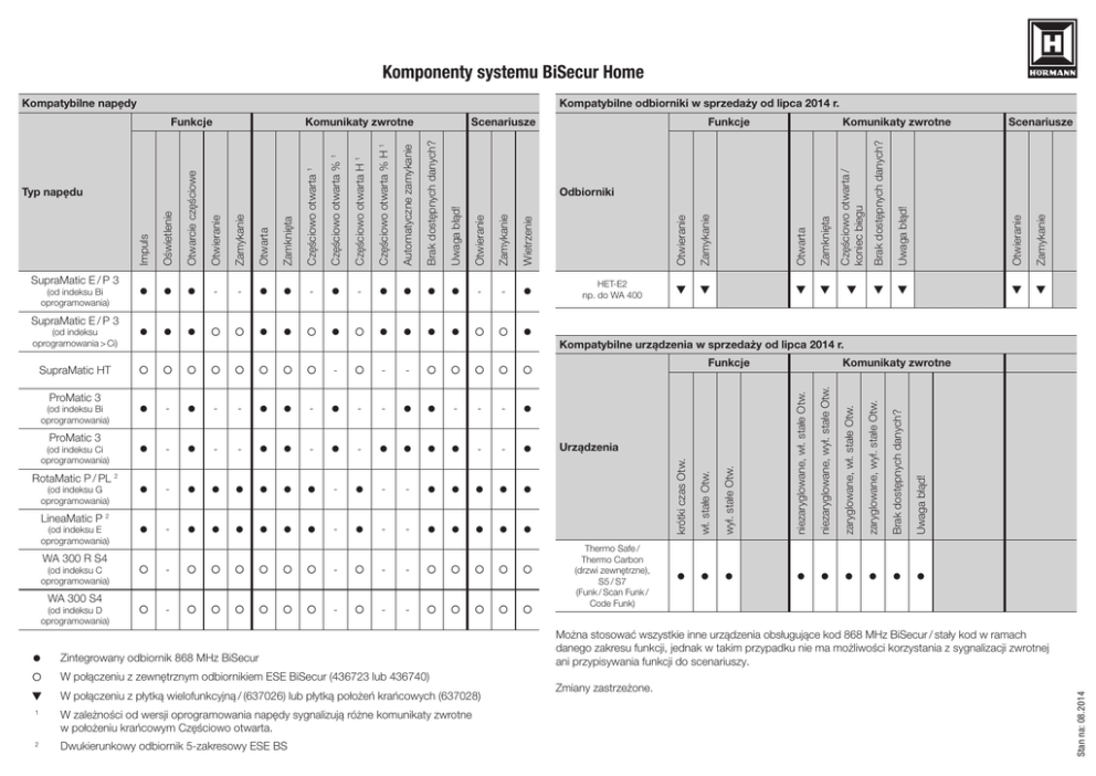 Komponenty systemu BiSecur Home Kompatybilne odbiorniki w sprzedaży od lipca 2014 r. Automatyczne zamykanie Brak dostępnych danych? Uwaga błąd! Otwieranie Zamykanie Wietrzenie l - l l l l - - l (od indeksu oprogramowania > Ci) l l l ¡ ¡ l l ¡ l ¡ l l l l ¡ ¡ l SupraMatic HT ¡ ¡ ¡ ¡ ¡ ¡ ¡ ¡ - ¡ - - ¡ ¡ ¡ ¡ ¡ l - l - - l l - l - - l l - - - l l - l - - l l - l - l l l l - - l l - l l l l l l - l - - l l l l l l - l l l l l l - l - - l l l l l WA 300 S4 (od indeksu D oprogramowania) q q ¡ - ¡ ¡ ¡ ¡ ¡ ¡ - ¡ - - ¡ ¡ ¡ ¡ ¡ ¡ - ¡ ¡ ¡ ¡ ¡ ¡ - ¡ - - ¡ ¡ ¡ ¡ ¡ l Zintegrowany odbiornik 868 MHz BiSecur ¡ W połączeniu z zewnętrznym odbiornikiem ESE BiSecur (436723 lub 436740) q W połączeniu z płytką wielofunkcyjną / (637026) lub płytką położeń krańcowych (637028) 1 W zależności od wersji oprogramowania napędy sygnalizują różne komunikaty zwrotne w położeniu krańcowym Częściowo otwarta. 2 Dwukierunkowy odbiornik 5-zakresowy ESE BS Kompatybilne urządzenia w sprzedaży od lipca 2014 r. Funkcje l l l l l l l l l Urządzenia Thermo Safe / Thermo Carbon (drzwi zewnętrzne), S5 / S7 (Funk / Scan Funk / Code Funk) Komunikaty zwrotne Uwaga błąd! (od indeksu C oprogramowania) q Brak dostępnych danych? WA 300 R S4 q zaryglowane, wył. stałe Otw. (od indeksu E oprogramowania) q zaryglowane, wł. stałe Otw. LineaMatic P 2 q niezaryglowane, wył. stałe Otw. (od indeksu G oprogramowania) q niezaryglowane, wł. stałe Otw. RotaMatic P / PL 2 q wył. stałe Otw. ProMatic 3 (od indeksu Ci oprogramowania) HET-E2 np. do WA 400 wł. stałe Otw. ProMatic 3 (od indeksu Bi oprogramowania) q Odbiorniki krótki czas Otw. SupraMatic E / P 3 Zamykanie Częściowo otwarta % H 1 - Otwieranie Częściowo otwarta H 1 l Uwaga błąd! Częściowo otwarta % 1 l Brak dostępnych danych? Częściowo otwarta 1 - Częściowo otwarta / koniec biegu Zamknięta - Zamknięta Otwarta l (od indeksu Bi oprogramowania) Scenariusze Otwarta Zamykanie l SupraMatic E / P 3 Komunikaty zwrotne Zamykanie Otwieranie l Typ napędu Funkcje Otwieranie Otwarcie częściowe Scenariusze Oświetlenie Komunikaty zwrotne Impuls Funkcje Można stosować wszystkie inne urządzenia obsługujące kod 868 MHz BiSecur / stały kod w ramach danego zakresu funkcji, jednak w takim przypadku nie ma możliwości korzystania z sygnalizacji zwrotnej ani przypisywania funkcji do scenariuszy. Zmiany zastrzeżone. Stan na: 08.2014 Kompatybilne napędy