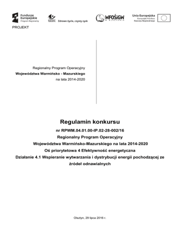 PROJEKT Regionalny Program Operacyjny Województwa Warmińsko - Mazurskiego na lata 2014-2020 Regulamin konkursu nr RPWM.04.01.00-IP.02-28-002/16 Regionalny Program Operacyjny Województwa Warmińsko-Mazurskiego na lata 2014-2020 Oś priorytetowa 4 Efektywność energetyczna Działanie 4.1 Wspieranie wytwarzania i dystrybucji energii pochodzącej ze źródeł odnawialnych Olsztyn, 29 lipca 2016 r. Spis treści: § 1 Postanowienia ogólne .................................................................................................................................3 § 2 Podstawowe informacje o konkursie ...........................................................................................................6 § 3 Przedmiot konkursu Zagadnienia ogólne w tym typy projektów podlegające dofinansowaniu ................6 §4 Przedmiot konkursu Limity i ograniczenia w realizacji projektów .................................................................7 § 5 Przedmiot konkursu Podmioty uprawnione do udziału w konkursie ...........................................................8 § 6 Finansowanie projektów w ramach konkursu .............................................................................................8 § 7 Ogłoszenie konkursu ................................................................................................................................ 10 § 8 Termin i miejsce składania wniosków o dofinansowanie projektu ........................................................... 10 § 9 Sporządzanie i forma składania wniosku o dofinansowanie projektu i załączników................................ 11 § 11 Sposób dokonywania oceny wniosków – ocena formalno-merytoryczna ............................................... 13 § 12 Rozstrzygnięcie konkursu i wybór projektów do dofinansowania .......................................................... 14 § 13 Wskaźniki monitorowania postępu rzeczowego w ramach projektu ...................................................... 15 § 14 Procedura odwoławcza .......................................................................................................................... 16 § 15 Umowa ................................................................................................................................................... 18 § 16 Kwalifikowalność wydatków ................................................................................................................... 19 § 17 Forma i sposób udzielania informacji w kwestiach dotyczących konkursu ............................................ 20 § 18 Postanowienia końcowe ......................................................................................................................... 20 Lista załączników do Regulaminu ................................................................................................................... 21 2 §1 Postanowienia ogólne 1. Regulamin konkursu nr RPWM.04.01.00-IP.02-28-002/16 Regionalny Program Operacyjny Województwa Warmińsko-Mazurskiego na lata 2014-2020 Oś priorytetowa 4 Efektywność energetyczna Działanie 4.1 Wspieranie wytwarzania i dystrybucji energii pochodzącej ze źródeł odnawialnych zwany dalej Regulaminem określa zasady ogłaszania konkursu, warunki uczestnictwa w konkursie, sporządzania wniosku, sposób i formę składania wniosku, termin dostarczenia wniosku, sposób dokonywania oceny wniosku, zakres i sposób poprawiania lub uzupełniania wniosku, sposób podejmowania decyzji o przyznaniu dofinansowania oraz procedurę odwoławczą. 2. Regulamin oraz wszystkie niezbędne dokumenty do złożenia w ramach konkursu dostępne są na stronie internetowej RPO WiM 2014-2020 (www.rpo.warmia.mazury.pl/), Portalu (www.funduszeeuropejskie.gov.pl) . 3. Przystąpienie do konkursu jest równoznaczne z akceptacją przez Wnioskodawcę postanowień niniejszego Regulaminu. 4. Konkurs przeprowadzany jest jawnie z zapewnieniem publicznego dostępu do informacji o zasadach jego przeprowadzania oraz do listy projektów wybranych do dofinansowania. 5. Do postępowania przewidzianego w zakresie ubiegania się o dofinansowanie oraz udzielenia dofinansowania nie stosuje się przepisów ustawy z dnia 14 czerwca 1960 r. – Kodeks Postępowania Administracyjnego (KPA), z wyjątkiem przepisów dotyczących wyłączenia pracowników organu, doręczeń i sposobu obliczania terminów. Dni w niniejszym dokumencie oznaczają dni kalendarzowe. 6. W sprawach nieuregulowanych w niniejszym Regulaminie zastosowanie mają: Ustawa z dnia 11 lipca 2014 r. o zasadach realizacji programów w zakresie polityki spójności finansowanych w perspektywie finansowej 2014-2020 (Dz. U. 2016, poz. 217), przepisy prawa wspólnotowego i krajowego oraz odpowiednie zasady wynikające z Regionalnego Programu Operacyjnego Województwa Warmińsko-Mazurskiego na lata 2014-2020, Szczegółowego Opisu Osi Priorytetowych Regionalnego Programu Operacyjnego Województwa Warmińsko-Mazurskiego na lata 2014-2020 oraz wytycznych i instrukcji o których mowa w ust. 8. 7. Jeżeli zapisy niniejszego Regulaminu są sprzeczne z przepisami powszechnie obowiązującymi, w szczególności z ustawą o której mowa w ust. 6. stosuje się wprost przepisy powszechnie obowiązujące. 8. Wnioskodawca ubiegając się o dofinansowanie zobowiązuje się do stosowania wytycznych, w tym między innymi: Wytycznych w zakresie trybu wyboru projektów na lata 2014-2020; Wytycznych w zakresie kwalifikowalności wydatków w ramach Europejskiego Funduszu Rozwoju Regionalnego, Europejskiego Funduszu Społecznego oraz Funduszu Spójności na lata 2014-2020; Wytycznych w sprawie kwalifikowalności wydatków w ramach Osi Priorytetowej 4 Efektywność Energetyczna: Działanie 4.1 Wspieranie wytwarzania i dystrybucji energii pochodzącej ze źródeł odnawialnych; Działanie 4.2 Efektywność energetyczna i wykorzystanie OZE w MŚP; oraz w ramach Osi Priorytetowej 5 