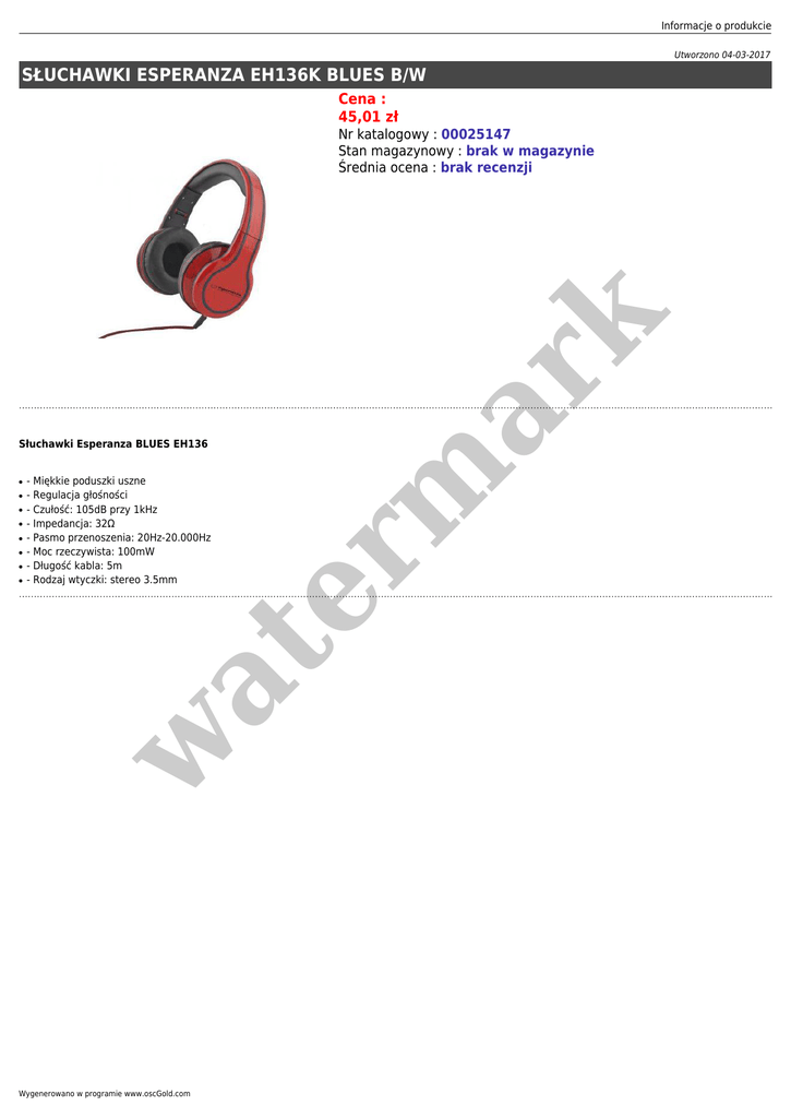 Informacje o produkcie Utworzono 04-03-2017 SŁUCHAWKI ESPERANZA EH136K BLUES B/W Cena : 45,01 zł Słuchawki Esperanza BLUES EH136 ● ● ● ● ● ● ● w at ● - Miękkie poduszki uszne - Regulacja głośności - Czułość: 105dB przy 1kHz - Impedancja: 32Ω - Pasmo przenoszenia: 20Hz-20.000Hz - Moc rzeczywista: 100mW - Długość kabla: 5m - Rodzaj wtyczki: stereo 3.5mm er m ar k Nr katalogowy : 00025147 Stan magazynowy : brak w magazynie Średnia ocena : brak recenzji Wygenerowano w programie www.oscGold.com