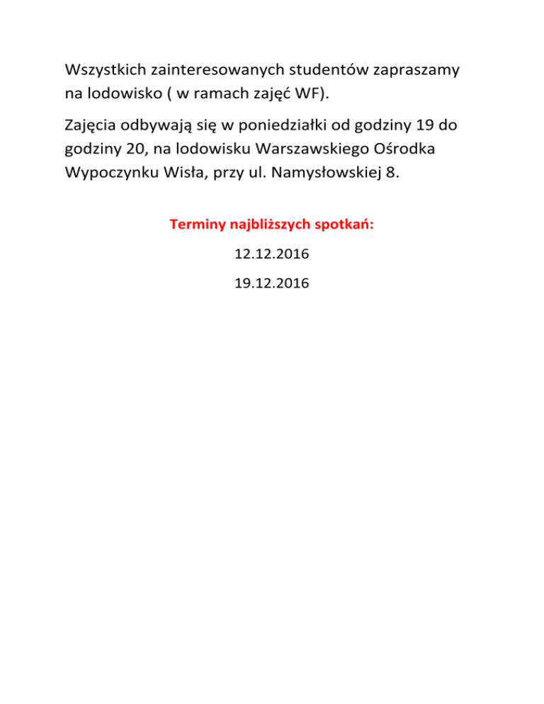 Wszystkich zainteresowanych studentów zapraszamy na lodowisko ( w ramach zajęć WF). Zajęcia odbywają się w poniedziałki od godziny 19 do godziny 20, na lodowisku Warszawskiego Ośrodka Wypoczynku Wisła, przy ul. Namysłowskiej 8. Terminy najbliższych spotkań: 12.12.2016 19.12.2016