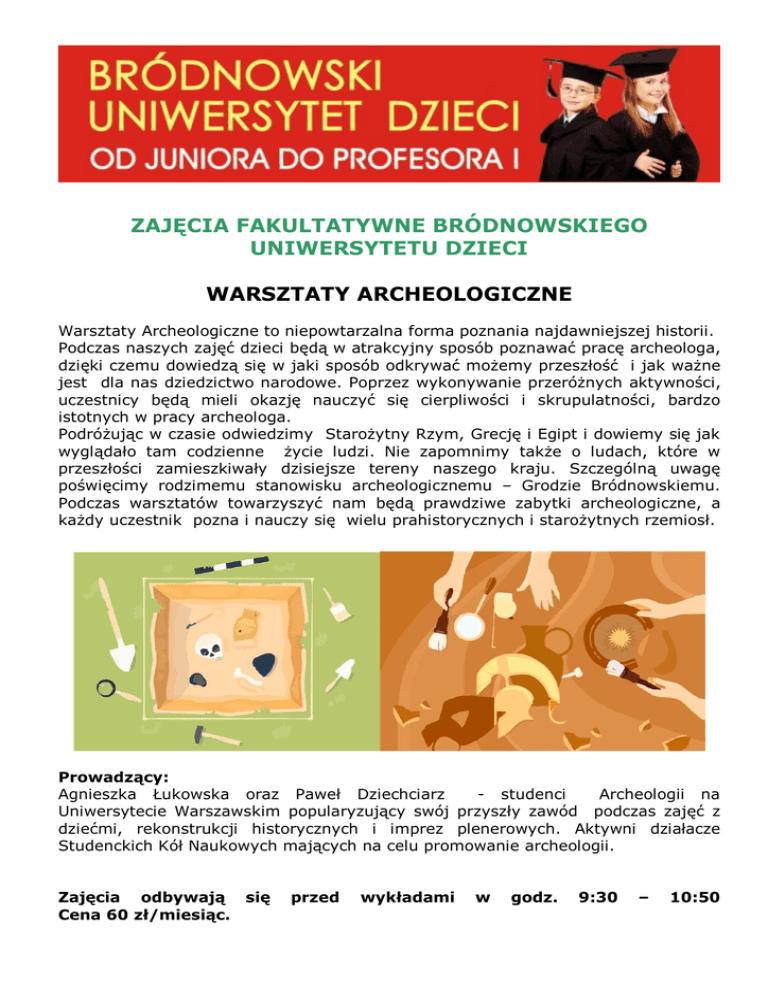 ZAJĘCIA FAKULTATYWNE BRÓDNOWSKIEGO UNIWERSYTETU DZIECI WARSZTATY ARCHEOLOGICZNE Warsztaty Archeologiczne to niepowtarzalna forma poznania najdawniejszej historii. Podczas naszych zajęć dzieci będą w atrakcyjny sposób poznawać pracę archeologa, dzięki czemu dowiedzą się w jaki sposób odkrywać możemy przeszłość i jak ważne jest dla nas dziedzictwo narodowe. Poprzez wykonywanie przeróżnych aktywności, uczestnicy będą mieli okazję nauczyć się cierpliwości i skrupulatności, bardzo istotnych w pracy archeologa. Podróżując w czasie odwiedzimy Starożytny Rzym, Grecję i Egipt i dowiemy się jak wyglądało tam codzienne życie ludzi. Nie zapomnimy także o ludach, które w przeszłości zamieszkiwały dzisiejsze tereny naszego kraju. Szczególną uwagę poświęcimy rodzimemu stanowisku archeologicznemu – Grodzie Bródnowskiemu. Podczas warsztatów towarzyszyć nam będą prawdziwe zabytki archeologiczne, a każdy uczestnik pozna i nauczy się wielu prahistorycznych i starożytnych rzemiosł. Prowadzący: Agnieszka Łukowska oraz Paweł Dziechciarz - studenci Archeologii na Uniwersytecie Warszawskim popularyzujący swój przyszły zawód podczas zajęć z dziećmi, rekonstrukcji historycznych i imprez plenerowych. Aktywni działacze Studenckich Kół Naukowych mających na celu promowanie archeologii. Zajęcia odbywają się Cena 60 zł/miesiąc. przed wykładami w godz. 9:30 – 10:50