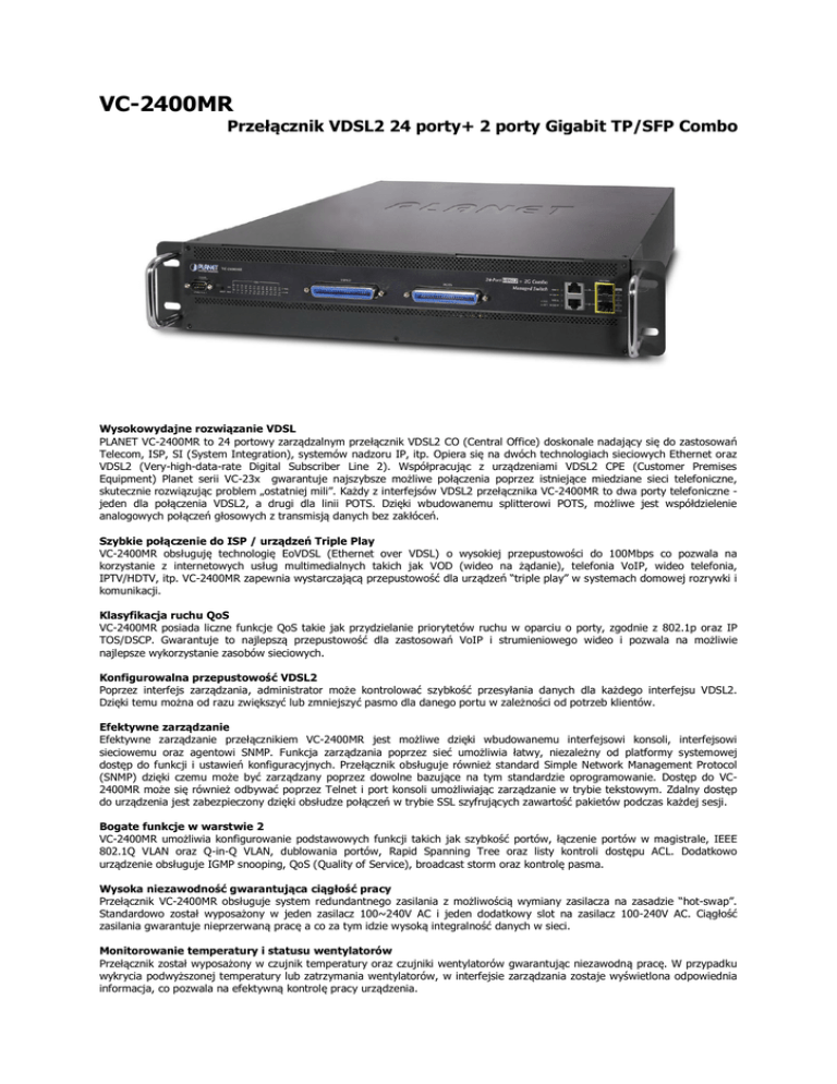 VC-2400MR Przełącznik VDSL2 24 porty+ 2 porty Gigabit TP/SFP Combo Wysokowydajne rozwiązanie VDSL PLANET VC-2400MR to 24 portowy zarządzalnym przełącznik VDSL2 CO (Central Office) doskonale nadający się do zastosowań Telecom, ISP, SI (System Integration), systemów nadzoru IP, itp. Opiera się na dwóch technologiach sieciowych Ethernet oraz VDSL2 (Very-high-data-rate Digital Subscriber Line 2). Współpracując z urządzeniami VDSL2 CPE (Customer Premises Equipment) Planet serii VC-23x gwarantuje najszybsze możliwe połączenia poprzez istniejące miedziane sieci telefoniczne, skutecznie rozwiązując problem „ostatniej mili”. Każdy z interfejsów VDSL2 przełącznika VC-2400MR to dwa porty telefoniczne jeden dla połączenia VDSL2, a drugi dla linii POTS. Dzięki wbudowanemu splitterowi POTS, możliwe jest współdzielenie analogowych połączeń głosowych z transmisją danych bez zakłóceń. Szybkie połączenie do ISP / urządzeń Triple Play VC-2400MR obsługuję technologię EoVDSL (Ethernet over VDSL) o wysokiej przepustowości do 100Mbps co pozwala na korzystanie z internetowych usług multimedialnych takich jak VOD (wideo na żądanie), telefonia VoIP, wideo telefonia, IPTV/HDTV, itp. VC-2400MR zapewnia wystarczającą przepustowość dla urządzeń “triple play” w systemach domowej rozrywki i komunikacji. Klasyfikacja ruchu QoS VC-2400MR posiada liczne funkcje QoS takie jak przydzielanie priorytetów ruchu w oparciu o porty, zgodnie z 802.1p oraz IP TOS/DSCP. Gwarantuje to najlepszą przepustowość dla zastosowań VoIP i strumieniowego wideo i pozwala na możliwie najlepsze wykorzystanie zasobów sieciowych. Konfigurowalna przepustowość VDSL2 Poprzez interfejs zarządzania, administrator może kontrolować szybkość przesyłania danych dla każdego interfejsu VDSL2. Dzięki temu można od razu zwiększyć lub zmniejszyć pasmo dla danego portu w zależności od potrzeb klientów. Efektywne zarządzanie Efektywne zarządzanie przełącznikiem VC-2400MR jest możliwe dzięki wbudowanemu interfejsowi konsoli, interfejsowi sieciowemu oraz agentowi SNMP. Funkcja zarządzania poprzez sieć umożliwia łatwy, niezależny od platformy systemowej dostęp do funkcji i ustawień konfiguracyjnych. Przełącznik obsługuje również standard Simple Network Management Protocol (SNMP) dzięki czemu może być zarządzany poprzez dowolne bazujące na tym standardzie oprogramowanie. Dostęp do VC2400MR może się również odbywać poprzez Telnet i port konsoli umożliwiając zarządzanie w trybie tekstowym. Zdalny dostęp do urządzenia jest zabezpieczony dzięki obsłudze połączeń w trybie SSL szyfrujących zawartość pakietów podczas każdej sesji. Bogate funkcje w warstwie 2 VC-2400MR umożliwia konfigurowanie podstawowych funkcji takich jak szybkość portów, łączenie portów w magistrale, IEEE 802.1Q VLAN oraz Q-in-Q VLAN, dublowania portów, Rapid Spanning Tree oraz listy kontroli dostępu ACL. Dodatkowo urządzenie obsługuje IGMP snooping, QoS (Quality of Service), broadcast storm oraz kontrolę pasma. Wysoka niezawodność gwarantująca ciągłość pracy Przełącznik VC-2400MR obsługuje system redundantnego zasilania z możliwością wymiany zasilacza na zasadzie “hot-swap”. Standardowo został wyposażony w jeden zasilacz 100~240V AC i jeden dodatkowy slot na zasilacz 100-240V AC. Ciągłość zasilania gwarantuje nieprzerwaną pracę a co za tym idzie wysoką integralność danych w sieci. Monitorowanie temperatury i statusu wentylatorów Przełącznik został wyposażony w czujnik temperatury oraz czujniki wentylatorów gwarantując niezawodną pracę. W przypadku wykrycia podwyższonej temperatury lub zatrzymania wentylatorów, w interfejsie zarządzania zostaje wyświetlona odpowiednia informacja, co pozwala na efektywną kontrolę pracy urządzenia. Podstawowe cechy Interfejs VDSL 24 porty RJ-21(Telco-50) Full-Duplex VDSL 24 porty RJ-21(Telco-50) dla linii POTS Splitter POTS dla każdego portu VDSL Łącze do urządzeń VC-231 / VC-234 / VC-230N CPE Bridge Automatyczna szybkość dla połączeń VDSL2 (w zależności od odległości i jakości kabla) Interfejs Ethernet 2 porty 10/100/1000Mbps TP RJ-45 współdzielone ze slotemi SFP Auto-MDI/MDI-X dla portów Gigabit RJ-45 Funkcje VDSL2 Standard ITU-T G.993.2 VDSL2 Kodowanie DMT (Discrete Multi-Tone) dla VDSL Przepustowość do 100/100Mbps w łączu symetrycznym Zasięgo do 1.4km po linii telefonicznej Konfigurowalna docelowa przepustowość oraz odstęp sygnału od szumu Wbudowane zabezpieczenie przed przepięciami Współdzielenie głosu i danych po kablu telefonicznym Wybór przepustowości do i od użytkownika dla każdego portu Funkcje warstwy 2 Wysokowydajna architektura Store & Forward, filtrowanie runt/CRC eliminujące błędne i niepełne pakiety Broadcast / Multicast / Unicast storm control Obsługa VLAN - IEEE 802.1Q Tag-based VLAN - Port-based VLAN - Q-in-Q tunneling (VLAN Stacking) - GVRP - Private VLAN Edge (PVE / Protected port) Łączenie portów w magistrale - IEEE 802.3ad LACP (Link Aggregation Control Protocol) - Cisco ether-channel (Static Trunk) Protokół Spanning Tree - STP, IEEE 802.1D (Classic Spanning Tree Protocol) - MSTP, IEEE 802.1s (Multiple Spanning Tree Protocol, Spanning Tree by VLAN) Dublowanie portów (mirroring) umożliwiające monitorowanie ruchu na obserwowanych portach Funkcje Quality of Service 4 kolejki priorytetów dla każdego portu Klasyfikacja ruchu: - IEEE 802.1p CoS - IP TOS / DSCP to 802.1p priority mapping - w oparciu o porty Strict priority oraz Weighted Round Robin (WRR) CoS QoS dla połączeń głosowych Multicast Obsługa IGMP Snooping v1/ v2 IGMP Snooping v2 fast leave Tryb Querier Bezpieczeństwo Kontrola dostępu 802.1x w oparciu o porty Autoryzacja dla użytkowników RADIUS Lista kontroli dostępu w warstwach L3 / L4 Filtrowanie MAC oraz przypisywanie źródłowych adresów IP-MAC do portów Zabezpieczenie dla portów Zarządzanie Int
