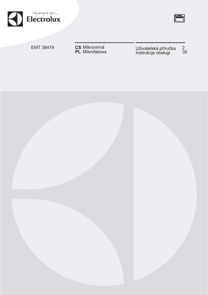 EMT 38419 CS Mikrovinná PL Mikrofalowa Uživatelská příručka Instrukcja obsługi 2 35 2 WWW.ELECTROLUX.COM OBSAH POKYNY K INSTALACI ................................................................................................. 3 BEZPEČNOST U MIKROVLNNÉ ENERGIE.................................................................. 4 VÝHODY MIKROVLNNÉ ENERGIE .............................................................................. 7 POPIS TROUBY ............................................................................................................ 9 ZÁKLADNÍ NASTAVENÍ .............................................................................................. 12 ZÁKLADNÍ FUNKCE .................................................................................................... 13 BĚHEM ČINNOSTI TROUBY... ................................................................................... 18 VAŘENÍ S MIKROVLNNOU TROUBOU ...................................................................... 18 VAŘENÍ S GRILEM ...................................................................................................... 21 JAKÉ LZE POUŽÍVAT NÁDOBÍ? ................................................................................. 23 ČIŠTĚNÍ A ÚDRŽBA TROUBY .................................................................................... 26 CO MÁM DĚLAT, JESTLIŽE TROUBA NEFUNGUJE? ............................................... 27 TECHNICKÉ VLASTNOSTI ......................................................................................... 29 ŽIVOTNÍ PROSTŘEDÍ ................................................................................................. 29 INSTALACE ................................................................................................................. 59 MYSLÍME NA VÁS Děkujeme za zakoupení spotřebiče Electrolux. Vybrali jste si výrobek, který představuje několik desetiletí odborných zkušeností a inovace. Byl navržen geniálně a ve stylu s ohledem na uživatele. Při každém použití se můžete spolehnout, že výsledek vašeho kuchařského snažení bude skvělý. Vítejte do světa společnosti Electrolux. Na našich webových stránkách můžete: získat rady k používání, prospektu, tipy k odstraňování poruch, servisní údaje: www.electrolux.com Zaregistrujte svůj výrobek a získejte lepší služby: www.electrolux.com/productregistration nakoupit příslušenství, spotřební položky a původní náhradní díly na naše spotřebiče: www.electrolux.com/shop PÉČE O ZÁKAZNÍKA A SLUŽBY Doporučujeme používat původní náhradní díly. Než se obrátíte na servis, připravte si k ruce následující údaje. Tyto informace se nacházejí na výrobním štítku. Model, kódové číslo výrobku (PNC), výrobní číslo. Výstraha, informace k bezpečnosti osob. Obecné informace a tipy. Informace k ochraně životního prostředí. Podléhá změnám bez upozornění. ČESKY 3 POKYNY K INSTALACI VÝSTRAHA: Při používání mikrovlnné trouby nenechávejte uvnitř žádné předměty včetně drátěných roštů a smažicích ploch, které jsou součástí spotřebiče, ale využívají se výhradně s funkcemi grilu a konvenčního pečení. PŘED INSTALACÍ Zkontrolujte, zda napájecí napětíuvedené na typovém štítku souhlasí s napětím síťové zásuvky, která bude sloužit k napájení trouby. Otevřete dvířka trouby, vyjměte veškeré příslušenstvía odstraňte obalový materiál včetně polystyrénového dílu, který drží otočný talíř. Neodstraňujte slídový kryt na horní straně vnitřku trouby. Tento kryt chrání zdroj mikrovlnné energie před poškozením od tuků a kousků potravin. VÝSTRAHA! Na povrchu přední strany trouby může být nanesena ochranná fólie. Než začnete troubu používat, odstraňte opatrně tuto fólii, přičemž začněte uvnitř trouby(je-li fólie zakončena uvnitř trouby. Zkontrolujte, zda není trouba nějak poškozena. Ujistěte se, že dvířka trouby se správně zavírají a že ani vnitřní strana dvířek ani čelo vstupního otvoru trouby nejsou poškozeny. Pokud byste našli nějaké poškození, spojte se s naším Střediskem technické pomoci (Technical Assistance Service). TROUBU NEPOUŽÍVEJTE, jestliže je poškozen kabel nebo zástrčka napájecího přívodu, jestliže trouba správně nefunguje nebo jestliže je poškozena či spadla. Spojte se se Střediskem technické pomoci Umístěte troubu na rovný a pevný povrch. Trouba nesmí být umístěna v blízkosti zdrojů tepla a radiových nebo televizních přijímačů. Během instalace dávejte pozor, aby napájecí přívod nepřišel do styku s vlhkostí nebo ostrými hranami. Vysoké teploty mohou kabel poškodit. VÝSTRAHA Po instalaci trouby musíte mít přístup k její síťové zástrčce. ELEKTROINSTALACE Elektroinstalace musí být provedena kvalifikovaným odborníkem podle platných předpisů. Před připojením mikrovlnné trouby k elektrické napájecí síti zkontrolujte, zda napětí a kmitočet sítě odpovídají hodnotám, které jsou uvedeny na typovém štítku spotřebiče na přední straně vnitřku trouby a na záručním listě, který by měl být uložen společně s touto příručkou. Elektrické připojení je uskutečněno přes zástrčku (tam, kde je k ní přístup) nebo přes vícepólový vypínač vhodného provedení vzhledem k proudovému zatížení a který má minimálně 3 mm mezeru mezi kontakty, aby bylo možné mikrovlnnou troubu odpojit v případě nouze nebo při jejím čištění. Elektrické připojení by mělo zajišťovat řádné uzemnění v souladu s aktuálními normami. VÝSTRAHA: TROUBA MUSÍ BÝT UZEMNĚNA. Jestliže by pohyblivý napájecí přívod do mikrovlnné trouby potřeboval někdy vyměnit, měl výměnu provést oficiální autorizovaný servis, jelikož jsou k to