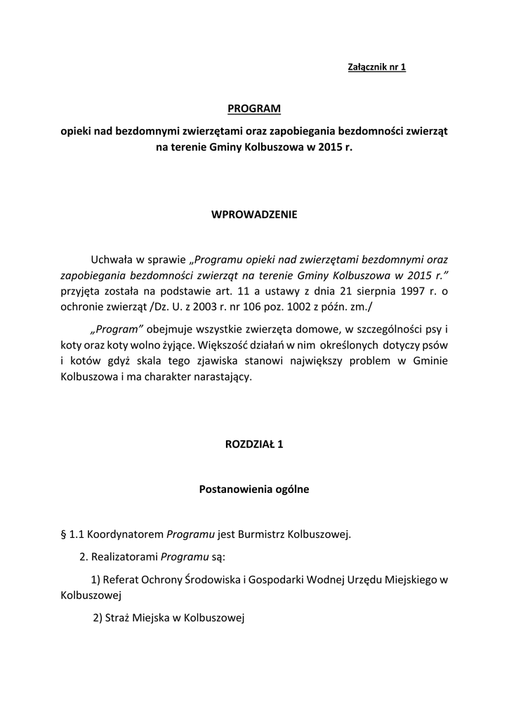 Załącznik nr 1 PROGRAM opieki nad bezdomnymi zwierzętami oraz zapobiegania bezdomności zwierząt na terenie Gminy Kolbuszowa w 2015 r. WPROWADZENIE Uchwała w sprawie „Programu opieki nad zwierzętami bezdomnymi oraz zapobiegania bezdomności zwierząt na terenie Gminy Kolbuszowa w 2015 r.” przyjęta została na podstawie art. 11 a ustawy z dnia 21 sierpnia 1997 r. o ochronie zwierząt /Dz. U. z 2003 r. nr 106 poz. 1002 z późn. zm./ „Program” obejmuje wszystkie zwierzęta domowe, w szczególności psy i koty oraz koty wolno żyjące. Większość działań w nim określonych dotyczy psów i kotów gdyż skala tego zjawiska stanowi największy problem w Gminie Kolbuszowa i ma charakter narastający. ROZDZIAŁ 1 Postanowienia ogólne § 1.1 Koordynatorem Programu jest Burmistrz Kolbuszowej. 2. Realizatorami Programu są: 1) Referat Ochrony Środowiska i Gospodarki Wodnej Urzędu Miejskiego w Kolbuszowej 2) Straż Miejska w Kolbuszowej 3) Organizacje pozarządowe, których celem statutowym jest ochrona zwierząt współpracujące z Gminą Kolbuszowa ROZDZIAŁ 2 § 2.1 Celem Programu jest zapobieganie bezdomności zwierząt na terenie Gminy Kolbuszowa oraz opieka nad zwierzętami bezdomnymi w tym: - odławianie bezdomnych i wałęsających się zwierząt - zapewnienie bezdomnym zwierzętom miejsca w schronisku lub przytulisku oraz wyszukiwanie dla nich opiekunów - opieka nad wolno żyjącymi kotami i ich dokarmianie - zapewnienie opieki weterynaryjnej zwierzętom bezdomnym oraz całodobowej opieki weterynaryjnej w przypadku zdarzeń z udziałem zwierząt - usypianie ślepych miotów 2. Ograniczenie populacji bezdomnych zwierząt poprzez ich sterylizację i kastrację przed oddaniem do adopcji 3. Ochrona mieszkańców Gminy przed zagrożeniami pochodzącymi od bezdomnych zwierząt 4. Zapobieganie i ograniczenie zachorowalności zwierząt na wściekliznę 5. Edukacja mieszkańców Gminy, a w szczególności młodzieży szkolnej w zakresie konieczności humanitarnego traktowania zwierząt i budowania empatii dla nich ROZDZIAŁ 3 Realizacja zadań § 3.1 Odławianie bezdomnych zwierząt na terenie Gminy Kolbuszowa realizują: 1) Organizacje pozarządowe, które posiadają przedstawicieli przeszkolonych w zakresie odławiania zwierząt domowych, a także odpowiedni sprzęt. Odłowione zwierzęta pozostają pod opieką tych organizacji, którym Gmina, w związku za szczególna sytuacją doraźnie zleciła odłowienie zwierząt 2) Firma Usługi Techniczno-Weterynaryjne „Arka-Vet” ul. Sybiraków 34/1 37-700 Przemyśl 3) Straż Miejska w Kolbuszowej w przypadkach nagłych, gdy jest to niezbędne z uwagi na bezpieczeństwo ludzi lub innych zwierząt oraz gdy pozostawione bez opieki i puszczone samopas psy są szczególnie uciążliwe dla mieszkańców 4) Bezpańskie lub wałęsające się zwierzęta, które znajdują się na terenie obwodu łowieckiego odławia i oddaje właścicielowi lub dostarcza do schroniska dzierżawca obwodu; odłowienie i dostarczenie psa odbywa się na koszt właściciela Zwierzęta odłowione przez podmiot wymieniony w pkt. 2 umieszczane będą na okres przejściowy w prowadzonym przez niego przytulisku, a następnie przekazywane do schroniska dla bezdomnych zwierząt Zwierzęta odłowione przez podmiot wymienione w pkt. 3 do czasu adopcji lub ustalenia właściciela przetrzymywane będą w Punkcie Opieki Nad Zwierzętami – Przytulisku zlokalizowanym w ZUK Kolbuszowa ul. Piłsudskiego 111a, prowadzonym przez gminę. W przypadkach szczególnych, gdy pies jest bardzo agresywny albo zwierzę wymaga wyspecjalizowanej lub długotrwałej pomocy weterynaryjnej, a także w sytuacjach gdy w przytulisku brak jest miejsca i nie ma możliwości oddania go pod czasową opiekę na terenie gminy będą one przekazywane firmie „Usługi Techniczno-Weterynaryjne Arka-vet” ul. Sybiraków 34/1 37-700 Przemyśl, z którą Gmina podpisze stosowną umowę. § 3.2 Bezdomne koty odławiane będą tylko w przypadkach szczególnych, gdy ich wiek, stan zdrowie lub odniesione urazy i obrażenia nie pozwolą im na sprawne funkcjonowanie w środowisku naturalnym. W takiej sytuacji umieszczone zostaną one w przytulisku prowadzonym przez gminę. Po zakończeniu leczenia będą sterylizowane /kastrowane/ i wypuszczane na wolność lub przekazywane do adopcji. § 3.3 Zwierzęta gospodarskie w sytuacjach tego wymagających umieszczane będą w Weryni w Gospodarstwie Pomocniczym Pozawydziałowego Zamiejscowego Instytutu Biotechnologii Stosowanej i Nauk Podstawowych Uniwersytetu Rzeszowskiego § 3.4 Usługi weterynaryjne niezbędne dla prawidłowej realizacji programu Gmina Kolbuszowa stosownie do potrzeb zlecać będzie następującym lecznicom: - Przychodnia weterynaryjna „Pro Animali” lek. wet. A. Starzec Kolbuszowa ul. Miodowa 1 - Gabinet Weterynaryjny lek. wet. S. Kopeć Kolbuszowa ul. Piłsudskiego 78 - Gabinet Weterynaryjny „As” wet. A. Tenerowicz Kolbuszowa ul. Piłsudskiego 80 § 3.5 Sprawowanie opieki nad zwierzętami bezdomnymi, w tym kotami wolno żyjącymi realizowane będzie poprzez wolontariat drogą: - zakupu i wydawania karmy społecznym opiekunom /karmicielom/ - podejmowanie interwencji w sprawach kotów wolno żyjących przy udziale organizacji poza rządowych lub/i przedstawicieli Urzędu - natychmiastowe reagowanie na wszelkie sygnały o niewłaściwym traktowaniu zwierząt lub znęcaniu się nad nimi - udzielaniu pomocy w wyżywieniu zwierząt i pomocy w finansowaniu opieki weterynaryjnej nad zwierzętami osobom, które przejęły je od Gminy lub zaopiekowały się nimi z własnej woli, a których sytuacja materialna tego wymaga - propagowanie w społeczności lokalnej, a zwłaszcza wśród młodzieży szkolnej idei humanitarnego traktowania zwierząt § 4. Sterylizację lub kastrację zwierząt realizują: 1) Organizacje pozarządowe poprzez wykonywanie zadań publicznych obejmujących zabiegi obligatoryjnej sterylizacji lub kastracji bezdomnych psów i ko