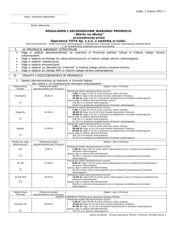 Łódź, 1 marca 2017 r. ................................................................... Imię i nazwisko Abonenta ................................................................... Adres Abonenta REGULAMIN I SZCZEGÓŁOWE WARUNKI PROMOCJI „Warto na dłużej” prowadzonej przez Operatora TOYA Sp. z o.o. z siedzibą w Łodzi. (dla konsumentów - osób fizycznych dokonujących z Operatorem czynności prawnej niezwiązanej bezpośrednio z ich działalnością gospodarczą lub zawodową) I. W PROMOCJI ABONENT OTRZYMUJE Ulgę w opłacie abonamentowej na wybrane w Promocji pakiety Usługi w trakcie całego okresu zobowiązania Ulgę w opłacie za Dostęp do usług telewizyjnych w trakcie całego okresu zobowiązania Ulgę w opłacie instalacyjnej Ulgę w opłacie aktywacyjnej Ulgę w opłacie za „Bezpieczny Internet” w trakcie całego okresu trwania Umowy Ulgę w opłacie za Usługę WiFi w trakcie całego okresu zobowiązania II. OPŁATY I OSZCZĘDNOŚCI W PROMOCJI 1. Opłaty abonamentowe za wybrany w Umowie Pakiet: dla umów z 12 miesięcznym okresem zobowiązania : Pakiet Usługi TOYAtv Oszczędny Miesięczna opłata abonamentowa bez Promocji 28.90 zł □ Wygodny 54.00 zł □ Bogaty 72.00 zł □ Dostęp do usług telewizyjnych Miesięczna opłata abonamentowa bez Promocji HD 5.00 zł □ 3G HD 15.00 zł □ 3G HD PVR □ Pakiet Usługi TOYAnet TOYAnet 25 □ 20.00 zł Opłaty i ulgi w Promocji Miesięczna opłata abonamentowa wynosi: 1.00 zł (ulga 27.90 zł) przez pierwszy pełny miesiąc, 19.90 zł (ulga 9.00 zł) przez kolejne jedenaście miesięcy, 25.90 zł (ulga 3.00 zł) w kolejnych przedłużonych okresach zobowiązania. Łączna ulga w opłacie abonamentowej wynosi: 126.90 zł w okresie zobowiązania, 36.00 zł w kolejnych przedłużonych okresach zobowiązania. Miesięczna opłata abonamentowa wynosi: 1.00 zł (ulga 53.00 zł) przez pierwszy pełny miesiąc, 39.90 zł (ulga 14.10 zł) przez kolejne jedenaście miesięcy, 48.90 zł (ulga 5.10 zł) w kolejnych przedłużonych okresach zobowiązania. Łączna ulga w opłacie abonamentowej: 208.10 zł w okresie zobowiązania, 61.20 zł w kolejnych przedłużonych okresach zobowiązania. Miesięczna opłata abonamentowa wynosi: 1.00 zł (ulga 71.00 zł) przez pierwszy pełny miesiąc, 59.90 zł (ulga 12.10 zł) przez kolejne jedenaście miesięcy, 65.90 zł (ulga 6.10 zł) w kolejnych przedłużonych okresach zobowiązania. Łączna ulga w opłacie abonamentowej: 204.10 zł w okresie zobowiązania, 73.20 zł w kolejnych przedłużonych okresach zobowiązania. Opłaty i ulgi w Promocji Miesięczna opłata abonamentowa wynosi: 1.00 zł (ulga 4.00 zł) przez okres zobowiązania oraz w kolejnych przedłużonych okresach zobowiązania. Łączna ulga w opłacie abonamentowej: 48.00 zł w okresie zobowiązania oraz w kolejnych przedłużonych okresach zobowiązania. Miesięczna opłata abonamentowa wynosi: 8.00 zł (ulga 7.00 zł) przez okres zobowiązania oraz w kolejnych przedłużonych okresach zobowiązania. Łączna ulga w opłacie abonamentowej: 84.00 zł przez okres zobowiązania oraz w kolejnych przedłużonych okresach zobowiązania. Miesięczna opłata abonamentowa wynosi: 12.00 zł (ulga 8.00 zł) przez okres zobowiązania oraz w kolejnych przedłużonych okresach zobowiązania. Łączna ulga w opłacie abonamentowej: 96.00 zł w okresie zobowiązania oraz w kolejnych przedłużonych okresach zobowiązania. Miesięczna opłata Opłaty i ulgi w Promocji abonamentowa bez Promocji PAKIETY INTERNETU TOYAnet przy aktywnej Usłudze TOYAtv Miesięczna opłata abonamentowa wynosi: 1.00 zł (ulga 58.00 zł) przez pierwszy pełny miesiąc, 59.00 zł 34.90 zł (ulga 24.10 zł) przez kolejne jedenaście miesięcy, 44.90 zł (ulga 14.10 zł) w kolejnych przedłużonych okresach zobowiązania. Łączna ulga w opłacie abonamentowej: 323.10 zł w okresie zobowiązania, „Warto na dłużej” Zmiana Operatora TOYAtv, TOYAnet, TOYAtel strona 1 TOYAnet 100 79.00 zł □ TOYAnet 150 89.00 zł □ TOYAnet 250 99.00 zł □ TOYAnet 25 65.50 zł □ TOYAnet 100 85.50 zł □ TOYAnet 150 95.50 zł □ TOYAnet 250 105.50 zł □ Pakiet Usługi TOYAtel Miesięczna opłata abonamentowa bez Promocji TOYAtel 100 przy aktywnej Usłudze TOYAnet 21.96 zł TOYAtel 100 bez aktywnej Usługi TOYAnet 28.06 zł TOYAtel Rodzinny 49.00 zł TOYAtel Rozgadany 69.00 zł □ □ □ □ 169.20 zł w kolejnych przedłużonych okresach zobowiązania. Miesięczna opłata abonamentowa wynosi: 1.00 zł (ulga 78.00 zł) przez pierwszy pełny miesiąc, 54.90 zł (ulga 24.10 zł) przez jedenaście miesięcy, 64.90 zł (ulga 14.10 zł) w kolejnych przedłużonych okresach zobowiązania. Łączna ulga w opłacie abonamentowej: 343.10 zł w okresie zobowiązania, 169.20 zł w kolejnych przedłużonych okresach zobowiązania. Miesięczna opłata abonamentowa wynosi: 1.00 zł (ulga 88.00 zł) przez pierwszy pełny miesiąc, 59.90 zł (ulga 29.10 zł) przez jedenaście miesięcy, 74.90 zł (ulga 14.10 zł) w kolejnych przedłużonych okresach zobowiązania. Łączna ulga w opłacie abonamentowej: 408.10 zł w okresie zobowiązania, 169.20 zł w kolejnych przedłużonych okresach zobowiązania. Miesięczna opłata abonamentowa wynosi: 1.00 zł (ulga 98.00 zł) przez pierwszy pełny miesiąc, 69.90 zł (ulga 29.10 zł) przez jedenaście miesięcy, 84.90 zł (ulga 14.10 zł) w kolejnych przedłużonych okresach zobowiązania. Łączna ulga w opłacie abonamentowej: 418.10 zł w okresie zobowiązania, 169.20 zł w kolejnych przedłużonych okresach zobowiązania. PAKIETY INTERNETU TOYAnet bez aktywnej Usługi TOYAtv Miesięczna opłata abonamentowa wynosi: 1.00 zł (ulga 64.50 zł) przez pierwszy pełny miesiąc, 34.90 zł (ulga 30.60 zł) przez kolejne jedenaście miesięcy, 44.90 zł (ulga 20.60 zł) w kolejnych przedłużonych okresach zobowiązania. Łączna ulga w opłacie abonamentowej: 401.10 zł w okresie zobowiązania, 247.20 zł w kolejnych przedłużonych okresach 