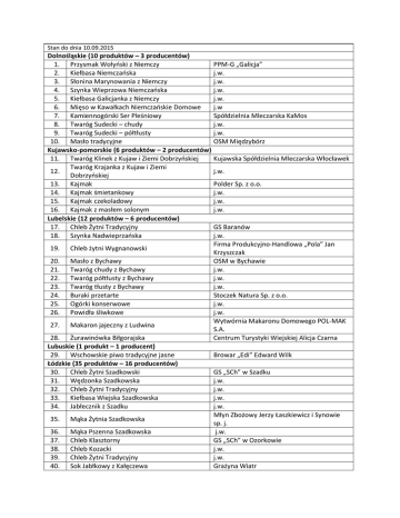 Stan do dnia 10.09.2015 Dolnośląskie (10 produktów – 3 producentów) 1. Przysmak Wołyński z Niemczy PPM-G „Galicja” 2. Kiełbasa Niemczańska j.w. 3. Słonina Marynowania z Niemczy j.w. 4. Szynka Wieprzowa Niemczańska j.w. 5. Kiełbasa Galicjanka z Niemczy j.w. 6. Mięso w Kawałkach Niemczańskie Domowe j.w 7. Kamiennogórski Ser Pleśniowy Spółdzielnia Mleczarska KaMos 8. Twaróg Sudecki – chudy j.w. 9. Twaróg Sudecki – półtłusty j.w. 10. Masło tradycyjne OSM Międzybórz Kujawsko-pomorskie (6 produktów – 2 producentów) 11. Twaróg Klinek z Kujaw i Ziemi Dobrzyńskiej Kujawska Spółdzielnia Mleczarska Włocławek Twaróg Krajanka z Kujaw i Ziemi 12. j.w. Dobrzyńskiej 13. Kajmak Polder Sp. z o.o. 14. Kajmak śmietankowy j.w. 15. Kajmak czekoladowy j.w. 16. Kajmak z masłem solonym j.w. Lubelskie (12 produktów – 6 producentów) 17. Chleb Żytni Tradycyjny GS Baranów 18. Szynka Nadwieprzańska j.w. Firma Produkcyjno-Handlowa „Pola” Jan 19. Chleb żytni Wygnanowski Krzyszczak 20. Masło z Bychawy OSM w Bychawie 21. Twaróg chudy z Bychawy j.w. 22. Twaróg półtłusty z Bychawy j.w. 23. Twaróg tłusty z Bychawy j.w. 24. Buraki przetarte Stoczek Natura Sp. z o.o. 25. Ogórki konserwowe j.w. 26. Powidła śliwkowe j.w. Wytwórnia Makaronu Domowego POL-MAK 27. Makaron jajeczny z Ludwina S.A. 28. Żurawinówka Biłgorajska Centrum Turystyki Wiejskiej Alicja Czarna Lubuskie (1 produkt – 1 producent) 29. Wschowskie piwo tradycyjne jasne Browar „Edi” Edward Wilk Łódzkie (35 produktów – 16 producentów) 30. Chleb Żytni Szadkowski GS „SCh” w Szadku 31. Wędzonka Szadkowska j.w. 32. Chleb Żytni Tradycyjny j.w. 33. Kiełbasa Wiejska Szadkowska j.w. 34. Jabłecznik z Szadku j.w. Młyn Zbożowy Jerzy Łaszkiewicz i Synowie 35. Mąka Żytnia Szadkowska sp. j. 36. Mąka Pszenna Szadkowska j.w. 37. Chleb Klasztorny GS „SCh” w Ozorkowie 38. Chleb Kozacki j.w. 39. Chleb Żytni Tradycyjny j.w. 40. Sok Jabłkowy z Kałęczewa Grażyna Wiatr 41. Kiełbasa Bilska 42. Schab Pieczony z Białej Góry 43. 44. 45. 46. Kiełbasa Krucha z Białej Góry Szynka Dojrzewająca z Białej Góry Twaróg Półtłusty Masło Ekstra z Głuchowa 47. Karp z Bylin 48. 49. 50. 51. 52. Szynka Walichnowska Golonka Walichnowska Boczek Walichnowski Chleb Solecki Ciastka Soleckie 53. Jabłka z Doliny Mrogi 54. Zalewajka 55. Buczkowskie pierogi z pieca 56. Chleb żytni z Koluszek 57. Chleb razowy z Koluszek 58. Chleb Staropolski 59. Sernik z Koluszek 60. Ciastka z Koluszek 61. Masło Ekstra z Klimeko 62. Chleb Kurowicki Małopolskie (14 produktów – 7 producentów) 63. Twaróg Tłusty Klinek 64. Masło Ekstra Bocheńskie 65. Chleb Żytni Tradycyjny 66. Kiełbasa Zwyczajna od Kołdrasa 67. Kiełbasa Wiejska od Kołdrasa 68. Kiełbasa Krakowska Podsuszana od Kołdrasa 69. Salceson od Kołdrasa 70. Salceson Wiejski 71. Mleko od krów rasy Polska Czerwona 72. Kiełbasa Piaszczańska 73. Kiełbasa Wiejska z Podstolic 74. Szynka Podstolego 75. Boczek gotowany z Podstolic 76. Kiełbasa tradycyjnie wyrabiana Mazowieckie (7 produktów – 5 producentów) 77. Ser Twarogowy Półtłusty 78. Twaróg Tłusty 79. Twaróg Półtłusty 80. Gruszka w syropie 81. 82. 83. Konfitura poziomkowa Chleb Ratuszowy z Siedlec Olej rzepakowy tłoczony na zimno Masarnia z Ubojnią Alina Kowalska Zakład Rzeźniczo-Wędliniarski Stanisław Katusza j.w. j.w. OSM Głuchów j.w. Gospodarstwo Rybackie Byliny Jerzy Ćwiertnia PPHU MARK’S sp. z o.o. j. w. j. w. PPHU Stefan Koziński, Ozorków j. w. ELITA Grupa Producentów Owoców Sp. z o. o. P.W.P.U.i H. Inter Solar j.w. PPHU Zakład Piekarniczy Elżbieta Olszyńska j. w. j.w. j.w. j.w. PPH „Klimeko” Bogusław Klimczak PPHU „Mich-Pol” Michał Woźny OSM Bochnia jw. GS „SCh” Chełmek Zakład Przetwórstwa Mięsnego Henryk Kołdras j. w. j. w. j. w. ZPHU Stanpol Jan Skawski OSM Limanowa Gawor Produkcja Wędlin Jakość Tradycja j.w. j.w. j.w. Wyrób Wędlin Tradycyjnych Wolarek OSM Sanniki OSM Garwolin j.w. KROKUS Przetwórnia Owoców i Warzyw Czesław Caryk j.w. Piekarnia Ratuszowa Radzikowscy s.c. Gospodarstwo Produkcyjno-Handlowe- Usługowe Kowalski Krzysztof Kowalski Opolskie (2 produkty – 2 producentów) 84. Chleb Żytni Tradycyjny 85. Masło Ekstra z Olesna Podkarpackie (9 produktów – 5 producentów) 86. Kiełbasianka z Górna 87. Wiejska pieczona z Górna 88. Karp ze Starzawy 89. 90. Karp po Starzawsku Chleb żytni tradycyjny 91. Krówka mleczna Strzyżowska 92. Sople Choinkowe 93. Pierożki pieczone z mięsem 94. Pierożki pieczone z kapustą i grzybami Podlaskie (2 produkty – 2 producentów) 95. Masło Tradycyjne z Filipowa 96. Chleb Żytni Staropolski Pomorskie (1 produkt – 1 producent) 97. Chleb żytni tradycyjny Śląskie (5 produktów – 3 producentów) 98. Chleb Wilamowicki 99. Chleb graham z Wilamowic 100. Kołacz z Wilamowic 101. Chleb Żytni Tradycyjny 102. Ciasto Drożdżowe Maślane Świętokrzyskie (38 produktów – 19 producentów) 103. Ser Gospodarski ANTONI z Podłazów 104. Ser Twarogowy Półtłusty Krajanka 105. Masło Jędrzejowskie 106. 107. 108. 109. 110. 111. 112. 113. 114. 115. 116. 117. 118. Jędrzejowski Twarożek Śmietankowy Ser Naturalny Twarogowy Świętokrzyski Masło Chmielnickie Ser Twarogowy Naturalny Świętokrzyski Opatowska krówka mleczna Chleb Pszenny Graham Chleb Żytni Razowy Żurek Kielecki Majonez Kielecki Musztarda Kielecka Delikatesowa Stołowa Ocet Spirytusowy 10% Karp z Oksy Kiełbasa Świętokrzyska Krajana 119. Miód spadziowo-nektarowy z Napękowa 120. Miód spadziowy Napękowski GS „SCh” w Praszce OSM w Oleśnie ZM „Smak Górno” j. w. Gospodarstwo Rybackie w Starzawie sp. z o.o. Anna Ostafińska j. w. GS „Samopomoc Chłopska” Rymanów Spółdzielnia Cukiernicza „Roksana” (podkarpackie) j.w. Przedsiębiorstwo Przemysłu Mięsnego „Taurus” Sp. z o.o. j.w. SM „Rospuda” Filipów Piekarnia „Ziarenko”, Michałów GS Samopomoc Chłopska w Żukowie Gminna Spółd