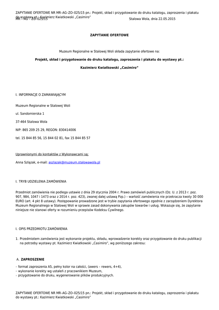 ZAPYTANIE OFERTOWE NR MR–AG–ZO–025/15 pn.: Projekt, skład i przygotowanie do druku katalogu, zaproszenia i plakatu do wystawy pt.: Kazimierz Kwiatkowski „Casimiro” MR – AG – ZO–025/15 Stalowa Wola, dnia 22.05.2015 ZAPYTANIE OFERTOWE Muzeum Regionalne w Stalowej Woli składa zapytanie ofertowe na: Projekt, skład i przygotowanie do druku katalogu, zaproszenia i plakatu do wystawy pt.: Kazimierz Kwiatkowski „Casimiro” I. INFORMACJE O ZAMAWIAJĄCYM Muzeum Regionalne w Stalowej Woli ul. Sandomierska 1 37-464 Stalowa Wola NIP: 865 209 25 29, REGON: 830414006 tel. 15 844 85 56, 15 844 02 81, fax 15 844 85 57 Uprawnionymi do kontaktów z Wykonawcami są: Anna Szlązak, e-mail: [email protected] I. TRYB UDZIELENIA ZAMÓWIENIA Przedmiot zamówienia nie podlega ustawie z dnia 29 stycznia 2004 r. Prawo zamówień publicznych (Dz. U. z 2013 r. poz. 907, 984, 1047 i 1473 oraz z 2014 r. poz. 423), zwanej dalej ustawą Pzp.) – wartość zamówienia nie przekracza kwoty 30 000 EURO (art. 4 pkt 8 ustawy). Postępowanie prowadzone jest w trybie zapytania ofertowego zgodnie z zarządzeniem Dyrektora Muzeum Regionalnego w Stalowej Woli w sprawie zasad dokonywania zakupów towarów i usług. Wskazuje się, że zapytanie niniejsze nie stanowi oferty w rozumieniu przepisów Kodeksu Cywilnego. I. OPIS PRZEDMIOTU ZAMÓWIENIA 1. Przedmiotem zamówienia jest wykonanie projektu, składu, wprowadzenie korekty oraz przygotowanie do druku publikacji na potrzeby wystawy pt. Kazimierz Kwiatkowski „Casimiro”, wg poniższego zakresu: A. ZAPROSZENIE ❍ ❍ ❍ format zaproszenia A5, pełny kolor na całości, (awers – rewers, 4+4), wykonanie korekty wg ustaleń z pracownikiem Muzeum, przygotowanie do druku, wygenerowanie plików produkcyjnych. ZAPYTANIE OFERTOWE NR MR–AG–ZO–025/15 pn.: Projekt, skład i przygotowanie do druku katalogu, zaproszenia i plakatu do wystawy pt.: Kazimierz Kwiatkowski „Casimiro” ZAPYTANIE OFERTOWE NR MR–AG–ZO–025/15 pn.: Projekt, skład i przygotowanie do druku katalogu, zaproszenia i plakatu do wystawy pt.: Kazimierz Kwiatkowski „Casimiro” A. PLAKAT ❍ ❍ ❍ ❍ format 680 mm x 980 mm, papier: kreda matowa, gramatura 170, kolor na całości (4+0) wykonanie korekty wg ustaleń z pracownikiem Muzeum przygotowanie do druku, wygenerowanie plików produkcyjnych. A. KATALOG ❍ ❍ ❍ ❍ ❍ Format: zaproponowany przez projektanta ok. 6 stron A4 maszynopisu, ok. 70 fotografii dzieł, ok. 5 fotografii archiwalnych, wytyczne do drukarni: papier, gramatura, uszlachetnianie, itp. 1. Zamawiający dostarczy Oferentowi w dniu podpisania umowy następujące materiały: a. materiał fotograficzny, b. materiał tekstowy. c. materiał graficzny (logotypy). 1. Wykonawca powinien zapewnić możliwość konsultacji z pracownikiem Muzeum Regionalnego w Stalowej Woli, w kwestiach merytorycznych dotyczących projektu szaty graficznej oraz składu. 2. Wykonawca zobowiązany jest do załączenia plików drukarskich PDF w formie elektronicznej na CD ROM lub DVD oraz dostarczenia przedmiotu zamówienia do siedziby Zamawiającego na własny koszt. 3. Wraz z zapłatą całego wynagrodzenia Zamawiający nabywa autorskie prawa majątkowe do projektu będącego Przedmiotem Umowy polegające na prawie do wykorzystania tego projektu. Autorskie prawa osobiste pozostają przy Wykonawcy. I. INFORMACJE O WARUNKACH UDZIAŁU W POSTĘPOWANIU 1. O udzielenie zamówienia mogą się ubiegać wykonawcy, którzy spełniają warunki dotyczące: a. posiadania wiedzy i doświadczenia Opis sposobu dokonywania oceny spełnienia tego warunku: ● O zamówienie mogą ubiegać się wykonawcy, których wiedza i doświadczenie pozwoli na prawidłowe wykonanie zamówienia, to znaczy w okresie ostatnich pięciu lat przed upływem terminu składania ofert, a jeżeli okres prowadzenia działalności jest krótszy - w tym okresie, wykonali należycie co najmniej 3 usługi składu książek /lub katalogów /lub albumów - dla instytucji kultury i nauki (np.: muzea, galerie, uczelnie, biblioteki). a. dysponowania osobami zdolnymi do wykonania zamówienia Opis sposobu dokonywania oceny spełnienia tego warunku: ● O zamówienie mogą ubiegać się wykonawcy, którzy dysponują odpowiednim potencjałem osobowym mającym wiedzę i doświadczenie stosowne do przedmiotu zamówienia, niezbędnym do jego realizacji: – osoba z doświadczeniem w projektowaniu szaty graficznej książek: minimum 3 lata. – osoba z doświadczeniem w składaniu / łamaniu tekstów: minimum 3 lata. 1. Ocena spełnienia przez wykonawcę warunków o których mowa w niniejszym ogłoszeniu nastąpi na podstawie ZAPYTANIE OFERTOWE NR MR–AG–ZO–025/15 pn.: Projekt, skład i przygotowanie do druku katalogu, zaproszenia i plakatu do wystawy pt.: Kazimierz Kwiatkowski „Casimiro” ZAPYTANIE OFERTOWE NR MR–AG–ZO–025/15 pn.: Projekt, skład i przygotowanie do druku katalogu, zaproszenia i plakatu do wystawy pt.: Kazimierz Kwiatkowski „Casimiro” przedłożonych w ofercie oświadczeń lub dokumentów. I. DOKUMENTY I OŚWIADCZENIA JAKIE NALEŻY PRZEDSTAWIĆ W OFERCIE a. Wypełniony i podpisany przez osoby /osobę/ uprawnione /ą/ lub uprawomocnione /ą/ do reprezentowania Wykonawcy – formularz oferty oraz wzór umowy, będące jednocześnie oświadczeniem, że Wykonawca akceptuje warunki zawarte w specyfikacji zapytania ofertowego oraz projekcie umowy, a w razie wygrania zapytania ofertowego zobowiązuje się do zawarcia umowy w wersji jak w załączniku, w uzgodnionym z Zamawiającym miejscu i terminie, b. Oferent powinien wraz z ofertą przedstawić dokumenty wykazujące, że spełnia warunki wiedzy i doświadczenia, tzn.: wykaz zrealizowanych min. 3 usług składu książek /lub katalogów /lub albumów - dla instytucji kultury i nauki (np.: muzea, galerie, uczelnie, biblioteki) oraz wykaz osób, które będą uczestniczyły w realizacji zamówienia. I. TERMIN WYKONANIA ZAMÓWIENIA 1. Wymagany termin realizacji zamówien