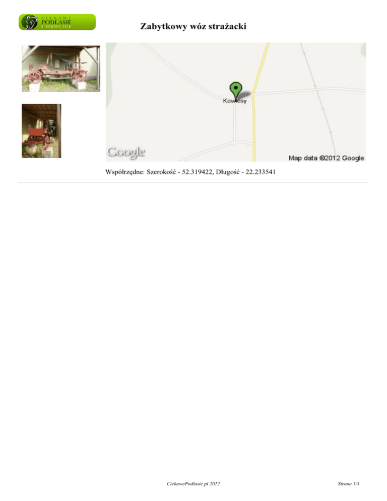Zabytkowy wóz strażacki Współrzędne: Szerokość - 52.319422, Długość - 22.233541 CiekawePodlasie.pl 2012 Strona 1/1