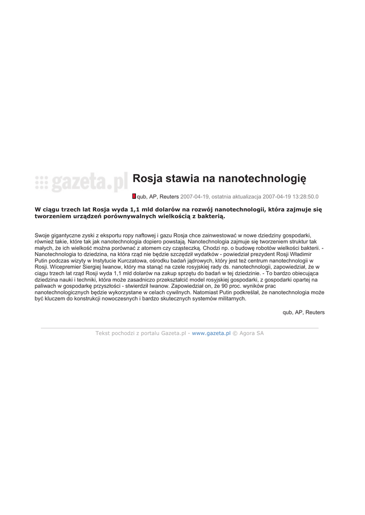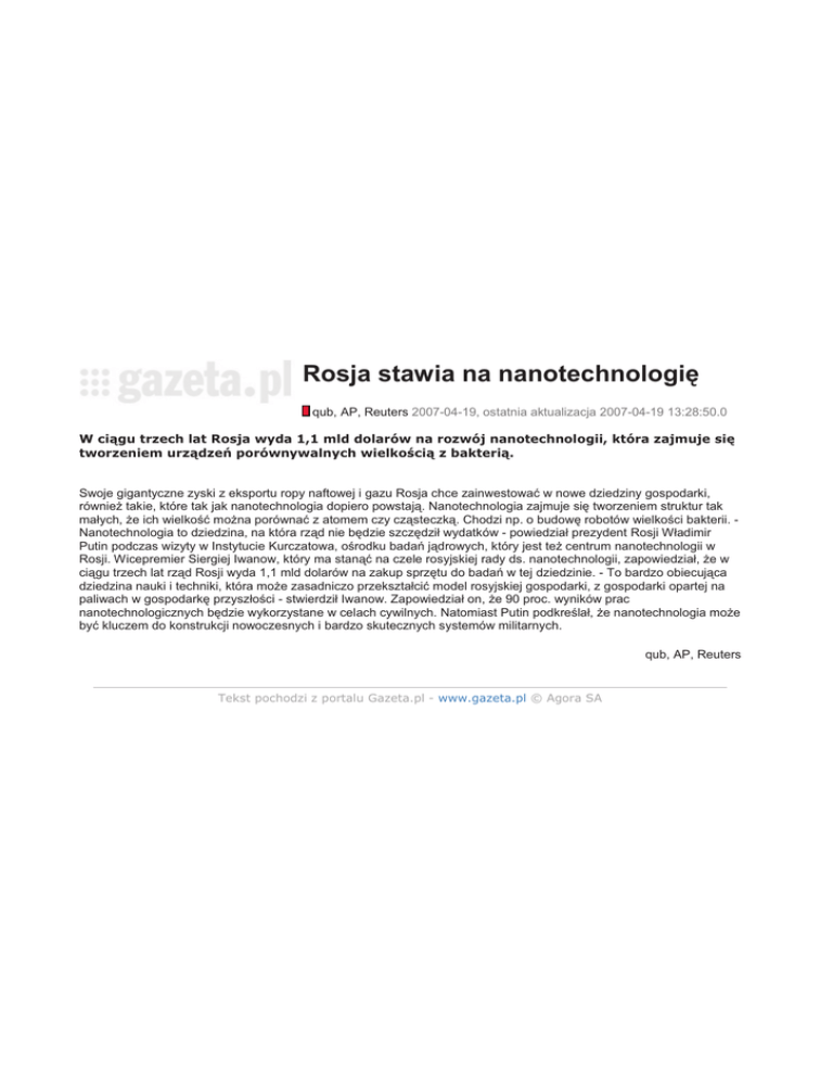 Rosja stawia na nanotechnologiê qub, AP, Reuters 2007-04-19, ostatnia aktualizacja 2007-04-19 13:28:50.0 W ci¹gu trzech lat Rosja wyda 1,1 mld dolarów na rozwój nanotechnologii, która zajmuje siê tworzeniem urz¹dzeñ porównywalnych wielkoœci¹ z bakteri¹. Swoje gigantyczne zyski z eksportu ropy naftowej i gazu Rosja chce zainwestowaæ w nowe dziedziny gospodarki, równie¿ takie, które tak jak nanotechnologia dopiero powstaj¹. Nanotechnologia zajmuje siê tworzeniem struktur tak ma³ych, ¿e ich wielkoœæ mo¿na porównaæ z atomem czy cz¹steczk¹. Chodzi np. o budowê robotów wielkoœci bakterii. Nanotechnologia to dziedzina, na która rz¹d nie bêdzie szczêdzi³ wydatków - powiedzia³ prezydent Rosji W³adimir Putin podczas wizyty w Instytucie Kurczatowa, oœrodku badañ j¹drowych, który jest te¿ centrum nanotechnologii w Rosji. Wicepremier Siergiej Iwanow, który ma stan¹æ na czele rosyjskiej rady ds. nanotechnologii, zapowiedzia³, ¿e w ci¹gu trzech lat rz¹d Rosji wyda 1,1 mld dolarów na zakup sprzêtu do badañ w tej dziedzinie. - To bardzo obiecuj¹ca dziedzina nauki i techniki, która mo¿e zasadniczo przekszta³ciæ model rosyjskiej gospodarki, z gospodarki opartej na paliwach w gospodarkê przysz³oœci - stwierdzi³ Iwanow. Zapowiedzia³ on, ¿e 90 proc. wyników prac nanotechnologicznych bêdzie wykorzystane w celach cywilnych. Natomiast Putin podkreœla³, ¿e nanotechnologia mo¿e byæ kluczem do konstrukcji nowoczesnych i bardzo skutecznych systemów militarnych. qub, AP, Reuters Tekst pochodzi z portalu Gazeta.pl - www.gazeta.pl © Agora SA