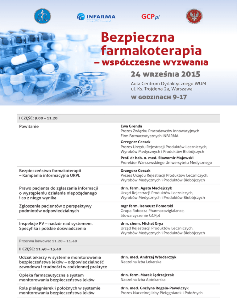 Bezpieczna farmakoterapia – współczesne wyzwania 24 września 2015 Aula Centrum Dydaktycznego WUM ul. Ks. Trojdena 2a, Warszawa w godzinach 9-17 I część: 9.00 – 11.20 Powitanie Ewa Grenda Prezes Związku Pracodawców Innowacyjnych Firm Farmaceutycznych INFARMA Grzegorz Cessak Prezes Urzędu Rejestracji Produktów Leczniczych, Wyrobów Medycznych i Produktów Biobójczych Prof. dr hab. n. med. Sławomir Majewski Prorektor Warszawskiego Uniwersytetu Medycznego Bezpieczeństwo farmakoterapii – Kampania informacyjna URPL Grzegorz Cessak Prezes Urzędu Rejestracji Produktów Leczniczych, Wyrobów Medycznych i Produktów Biobójczych Prawo pacjenta do zgłaszania informacji o wystąpieniu działania niepożądanego i co z niego wynika dr n. farm. Agata Maciejczyk Urząd Rejestracji Produktów Leczniczych, Wyrobów Medycznych i Produktów Biobójczych Zgłoszenia pacjentów z perspektywy podmiotów odpowiedzialnych mgr farm. Ireneusz Pomorski Grupa Robocza Pharmacovigialance, Stowarzyszenie GCPpl Inspekcje PV – nadzór nad systemem. Specyfika i polskie doświadczenia dr n. chem. Michał Gryz Urząd Rejestracji Produktów Leczniczych, Wyrobów Medycznych i Produktów Biobójczych Przerwa kawowa: 11.20 – 11.40 II część: 11.40 – 13.40 Udział lekarzy w systemie monitorowania bezpieczeństwa leków – odpowiedzialność zawodowa i trudności w codziennej praktyce dr n. med. Andrzej Włodarczyk Naczelna Izba Lekarska Opieka farmaceutyczna a system monitorowania bezpieczeństwa leków dr n. farm. Marek Jędrzejczak Naczelna Izba Aptekarska Rola pielęgniarek i położnych w systemie monitorowania bezpieczeństwa leków dr n. med. Grażyna Rogala-Pawelczyk Prezes Naczelnej Izby Pielęgniarek i Położnych Mechanizmy minimalizacji ryzyka – komunikaty bezpieczeństwa i programy edukacyjne mgr farm. Monika Nowak Grupa Robocza ds. Pharmacovigilance INFARMY Edukacja lekarzy w zakresie bezpieczeństwa farmakoterapii Warszawski Uniwersytet Medyczny LUNCH: 13.40 – 14.20 Debata z udziałem zaproszonych gości: 14.20 – 15.20 „Dziś i jutro systemu monitorowania bezpieczeństwa leków” • Jak system monitorowania funkcjonuje dzisiaj i jak można by go zmienić? • Gdzie chcemy być za pięć lat? • Czy nowe technologie zmienią system? • Jak mógłby wyglądać system idealny? Prowadzenie: lek. med. Agnieszka Szymchel Przewodnicząca Grupy Roboczej ds. Pharmacovigilance INFARMY III część: 15.20 – 17.00 Leki sfałszowane mgr Ewelina Siadkowska Główny Inspektorat Farmaceutyczny Monitorowanie bezpieczeństwa leków w ośrodkach regionalnych prof. dr hab. n. farm. Anna Wiela-Hojeńska Kierownik Katedry i Zakładu Farmakologii Klinicznej Uniwersytetu Medycznego we Wrocławiu Zatrucia lekowe – polskie doświadczenia oraz udział ośrodków regionalnych w systemie monitorowania dr n. med. Piotr Burda Konsultant Krajowy w dziedzinie Toksykologii Klinicznej Wewnątrzszpitalny system monitorowania działań niepożądanych – doświadczenia szpitala w Gryficach dr n. med. Andrzej Gorzka Ordynator Szpitalnego Oddziału Ratunkowego Samodzielny Publiczny Zespół Zakładów Opieki Zdrowotnej w Gryficach Współpraca krajów Unii Europejskiej w zakresie monitorowania działań niepożądanych leków dr hab. n. med. Adam Przybyłkowski Katedra Farmakologii Klinicznej i Doświadczalnej WUM