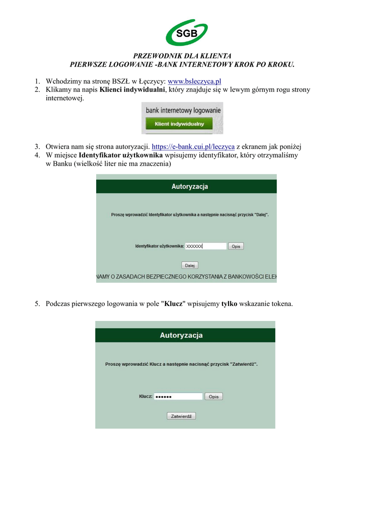 PRZEWODNIK DLA KLIENTA PIERWSZE LOGOWANIE -BANK INTERNETOWY KROK PO KROKU. 1. Wchodzimy na stronę BSZŁ w Łęczycy: www.bsleczyca.pl 2. Klikamy na napis Klienci indywidualni, który znajduje się w lewym górnym rogu strony internetowej. 3. Otwiera nam się strona autoryzacji. https://e-bank.cui.pl/leczyca z ekranem jak poniżej 4. W miejsce Identyfikator użytkownika wpisujemy identyfikator, który otrzymaliśmy w Banku (wielkość liter nie ma znaczenia) 5. Podczas pierwszego logowania w pole "Klucz" wpisujemy tylko wskazanie tokena. 6. Następnie zostaniemy przekierowani na stronę, na której ustawiamy Nasze hasło docelowe logowania do banku internetowego -hasło musi posiadać od 4 do 8 znaków (cyfr lub liter, bez polskich znaków diaktrycznych) 7. Po wprowadzeniu, powtórzeniu i zatwierdzeniu nowego hasła, wchodzimy na stronę Naszego konta internetowego 8. BARDZO WAŻNE: Od tej pory przy kolejnych logowaniach do banku internetowe oraz akceptacji przelewów, w miejsce Klucz, wpisujemy łącznie swoje hasło oraz aktualne wskazanie tokena. 9. Wskazówka: Po nieudanej próbie logowania zaleca się usunięcie plików cookie (ciasteczka) z przeglądarki internetowej (dotyczy Internet Explorer: Narzędzia>>Opcje Internetowe>>Ogólne>>Historia przeglądania), będąc na innej stronie niż strona „autoryzacji” banku internetowego. W przypadku wystąpienia ewentualnych problemów prosimy o kontakt. 10. Zastrzeganie środków identyfikacji elektronicznej (token) pod numerem telefonu 24 721 20 18