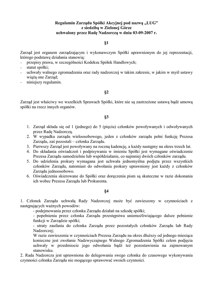 Regulamin Zarządu Spółki Akcyjnej pod nazwą „LUG” z siedzibą w Zielonej Górze uchwalony przez Radę Nadzorczą w dniu 03-09-2007 r. §1 Zarząd jest organem zarządzającym i wykonawczym Spółki uprawnionym do jej reprezentacji, którego podstawę działania stanowią: − przepisy prawa, w szczególności Kodeksu Spółek Handlowych; − statut spółki; − uchwały walnego zgromadzenia oraz rady nadzorczej w takim zakresie, w jakim w myśl ustawy wiąŜą one Zarząd; − niniejszy regulamin. §2 Zarząd jest właściwy we wszelkich Sprawach Spółki, które nie są zastrzeŜone ustawą bądź umową spółki na rzecz innych organów. §3 1. Zarząd składa się od 1 (jednego) do 5 (pięciu) członków powoływanych i odwoływanych przez Radę Nadzorczą. 2. W wypadku zarządu wieloosobowego, jeden z członków zarządu pełni funkcję Prezesa Zarządu, zaś pozostali – członka Zarządu. 3. Pierwszy Zarząd jest powoływany na roczną kadencję, a kaŜdy następny na okres trzech lat. 4. Do składania oświadczeń i podpisywania w imieniu Spółki jest wymagane oświadczenie Prezesa Zarządu samodzielnie lub współdziałanie, co najmniej dwóch członków zarządu. 5. Do udzielenia prokury wymagana jest uchwała jednomyślna podjęta przez wszystkich członków Zarządu, natomiast do odwołania prokury uprawniony jest kaŜdy z członków Zarządu jednoosobowo. 6. Oświadczenia skierowane do Spółki oraz doręczenia pism są skuteczne w razie dokonania ich wobec Prezesa Zarządu lub Prokurenta. §4 1. Członek Zarządu uchwałą Rady Nadzorczej moŜe być zawieszony w czynnościach z następujących waŜnych powodów: - podejmowania przez członka Zarządu działań na szkodę spółki; - popełnienia przez członka Zarządu przestępstwa uniemoŜliwiającego dalsze pełnienie funkcji w Zarządzie spółki; - utraty zaufania do członka Zarządu przez pozostałych członków Zarządu lub Rady Nadzorczej; W razie zawieszenia w czynnościach Prezesa Zarządu na okres dłuŜszy od jednego miesiąca konieczne jest zwołanie Nadzwyczajnego Walnego Zgromadzenia Spółki celem podjęcia uchwały w przedmiocie jego odwołania bądź teŜ pozostawienia na zajmowanym stanowisku. 2. Rada Nadzorcza jest uprawniona do delegowania swego członka do czasowego wykonywania czynności członka Zarządu nie mogącego sprawować swoich czynności. §5 1. Pracami Zarządu kieruje jego Prezes, jak równieŜ przewodniczy on na posiedzeniach Zarządu oraz koordynuje prace pozostałych członków Zarządu. Do kompetencji prezesa zarządu ponadto naleŜy w szczególności: a) reprezentowanie Zarządu, b) zatrudnianie i zwalnianie pracowników Spółki; c) udział w posiedzeniach Rady Nadzorczej. 2. W razie niemoŜności pełnienia obowiązków przez Prezesa Zarządu wyznacza on członka zarządu wykonującego w zastępstwie jego obowiązki, o których mowa w ust. 1. §6 Do kompetencji Zarządu Spółki naleŜą wszelkie sprawy niezastrzeŜone dla Walnego Zgromadzenia lub Rady Nadzorczej, w szczególności: a) reprezentowanie Spółki w czynnościach sądowych i pozasądowych, b) zwoływanie zwyczajnych i nadzwyczajnych Walnych Zgromadzeń, c) proponowanie porządku obrad Walnego Zgromadzenia, d) opracowanie projektów uchwał Walnego Zgromadzenia, e) uczestniczenie w posiedzeniach Rady Nadzorczej oraz Walnego Zgromadzenia, f) wykonywanie uchwał Walnego Zgromadzenia, g) zatrudnianie i zwalnianie pracowników Spółki, h) powoływanie i odwoływanie prokurentów Spółki oraz jej pełnomocników. §7 1. Posiedzenia Zarządu odbywają się raz w tygodniu lub częściej w terminie i miejscu wyznaczonym z góry uchwałą Zarządu i w takim trybie teŜ podlegającym zmianie. Członkowie Zarządu nie muszą być informowani o takim posiedzeniu. 2. Posiedzenie Zarządu zwołuje jego Prezes z własnej inicjatywy lub na wniosek któregokolwiek z członków Zarządu albo na Ŝądanie Rady Nadzorczej. 3. W waŜnych przypadkach nadzwyczajne posiedzenie Zarządu moŜe zwołać kaŜdy z członków Zarządu z podaniem terminu i miejsca jego odbycia oraz porządku obrad. 4. Zawiadomienie o posiedzeniu, o którym mowa w ust. 3, wraz ze wskazaniem porządku obrad powinno nastąpić co najmniej na 24 godziny przed terminem posiedzenia, w sposób gwarantujący uzyskanie zawiadomienia przez adresata oraz potwierdzenie przez niego otrzymania zawiadomienia tj. faksem, e-mailem, telefonicznie. 5. Porządek obrad Zarządu określa podmiot, z którego inicjatywy zwołano posiedzenie. 6. Porządek obrad moŜe być uzupełniony na wniosek członka zarządu zgłoszony co najmniej na 12 godzin naprzód przed planowanym terminem posiedzenia. 7. W posiedzeniach Zarządu mogą brać udział, bez prawa głosu, zaproszeni przez członka zarządu, członkowie Rady Nadzorczej, eksperci niezbędni do powzięcia decyzji w danej sprawie, ewentualnie protokolant. 8. Do waŜności uchwał Zarządu wymagana jest obecność przynajmniej 3 członków Zarządu. 9. Uchwały zarządu zapadają zwykłą większością głosów. W razie równej ilości głosów decyduje głos Prezesa. §8 1. Z kaŜdego posiedzenia Zarządu spisywany jest protokół przez osobę wyznaczoną przez Prezesa. 2. Protokół winien zawierać: - kolejny numer, - datę i miejsce odbycia posiedzenia, - czas rozpoczęcia i zakończenia posiedzenia, - imiona i nazwiska osób obecnych na posiedzeniu, z oznaczeniem ich funkcji, - wzmiankę dotyczącą prawidłowości odbycia posiedzenia, - porządek obrad, - treść wystąpień uczestników posiedzenia, - treść powziętych uchwał, ze wskazaniem numeru uchwały (według kolejności jej powzięcia w danym roku), ilości głosów „za”, „przeciw” oraz „wstrzymujących się”; - imię i nazwisko protokolanta. 3. Protokół winien być podpisany przez wszystkich obecnych członków Zarządu oraz protokolanta. 4. Protokoły z posiedzeń Zarządu są przechowywane w biurze Zarządu Spółki. §9 1. W razie zakończenia