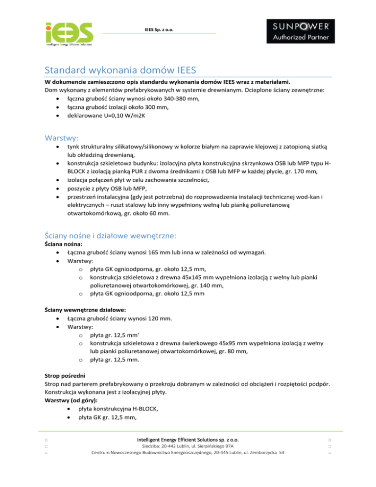 IEES Sp. z o.o. Ul. Sierpińskiego 97A, 20-442 Lublin, NIP: 678-314-67-79 Standard wykonania domów IEES W dokumencie zamieszczono opis standardu wykonania domów IEES wraz z materiałami. Dom wykonany z elementów prefabrykowanych w systemie drewnianym. Ocieplone ściany zewnętrzne: łączna grubość ściany wynosi około 340-380 mm, łączna grubość izolacji około 300 mm, deklarowane U=0,10 W/m2K Warstwy: tynk strukturalny silikatowy/silikonowy w kolorze białym na zaprawie klejowej z zatopioną siatką lub okładziną drewnianą, konstrukcja szkieletowa budynku: izolacyjna płyta konstrukcyjna skrzynkowa OSB lub MFP typu HBLOCK z izolacją pianką PUR z dwoma średnikami z OSB lub MFP w każdej płycie, gr. 170 mm, izolacja połączeń płyt w celu zachowania szczelności, poszycie z płyty OSB lub MFP, przestrzeń instalacyjna (gdy jest potrzebna) do rozprowadzenia instalacji technicznej wod-kan i elektrycznych – ruszt stalowy lub inny wypełniony wełną lub pianką poliuretanową otwartokomórkową, gr. około 60 mm. Ściany nośne i działowe wewnętrzne: Ściana nośna: Łączna grubość ściany wynosi 165 mm lub inna w zależności od wymagań. Warstwy: o płyta GK ognioodporna, gr. około 12,5 mm, o konstrukcja szkieletowa z drewna 45x145 mm wypełniona izolacją z wełny lub pianki poliuretanowej otwartokomórkowej, gr. 140 mm, o płyta GK ognioodporna, gr. około 12,5 mm Ściany wewnętrzne działowe: Łączna grubość ściany wynosi 120 mm. Warstwy: o płyta gr. 12,5 mm' o konstrukcja szkieletowa z drewna świerkowego 45x95 mm wypełniona izolacją z wełny lub pianki poliuretanowej otwartokomórkowej, gr. 80 mm, o płyta gr. 12,5 mm. Strop pośredni Strop nad parterem prefabrykowany o przekroju dobranym w zależności od obciążeń i rozpiętości podpór. Konstrukcja wykonana jest z izolacyjnej płyty. Warstwy (od góry): płyta konstrukcyjna H-BLOCK, płyta GK gr. 12,5 mm, :: Intelligent Energy Efficient Solutions sp. z o.o. :: :: :: Siedziba: 20-442 Lublin, ul. Sierpińskiego 97A Centrum Nowoczesnego Budownictwa Energooszczędnego, 20-445 Lublin, ul. Zemborzycka 53 :: :: IEES Sp. z o.o. Ul. Sierpińskiego 97A, 20-442 Lublin, NIP: 678-314-67-79 Konstrukcja dachowa wiązarowa Łączna grubość części stropowej wynosi 210 mm. Więźba dachowa, podobnie jak pozostałe elementy konstrukcyjne, wykonane są z atestowanego drewna litego klasy C24, czterostronnie struganego i fazowanego lub z drewna KVH. Wiązary dachowe: Więźba dachowa wykonywana jest w postaci prefabrykowanych wiązarów kratowych z drewna, łączonych na płytki kolczaste. Gotowe wiązary transportowane są na plac budowy, po czym następuje ich montaż wraz z wykonaniem stężeń. Ocieplenie części stropowej: deklarowane U=0,10 W/m2K Pokrycie dachowe: papa wierzchniego krycia Warstwy części dachowej (od góry): pokrycie dachu pełne deskowanie płytą OSB lub MFP Warstwy części stropowej (od góry): Strop nad piętrem prefabrykowany o przekroju dobranym w zależności od obciążeń i rozpiętości podpór. Konstrukcja wykonana jest z izolacyjnej płyty konstrukcyjnej skrzynkowej OSB lub MFP, gr. 210 mm, izolacja połączeń płyt w celu zachowania szczelności, warstwa łat instalacyjnych do rozprowadzenia instalacji elektrycznej w suficie oraz do mocowania płyt, gr. około 50 mm, płyta gr. 12,5 mm. Płyta fundamentowa Wykonanie płyty fundamentowej ocieplonej wraz z uzgodnionymi przepustami (woda, instalacje elektryczne) izolowanej styropianem pod płytą; U=0,12 W/m2K. WYLEWKI Wylewki wewnętrzne anhydrytowe o grubości około 40-60 mm. STOLARKA stolarka okienna 3-szybowa PCV U<0,8 W/m2K dla okna, parapety zewnętrzne, wymiary zgodnie z planem, okna FIX w ramie, okna otwieralno-uchylne i drzwi balkonowe. Kolor: rama z zewnątrz i z wewnątrz biała, skrzydła otwierane z zewnątrz kolor standardowy do wyboru i z wewnątrz białe; szkło U=0,5 LT-71%, G-50%; listwa standardowa; zawiasy niewidoczne (dane deklarowane przez Producenta), stolarka drzwiowa – drzwi wejściowe: wymiary według projektu, U<0,8 W/m2K (deklarowane przez Producenta). :: Intelligent Energy Efficient Solutions sp. z o.o. :: :: :: Siedziba: 20-442 Lublin, ul. Sierpińskiego 97A Centrum Nowoczesnego Budownictwa Energooszczędnego, 20-445 Lublin, ul. Zemborzycka 53 :: :: IEES Sp. z o.o. Ul. Sierpińskiego 97A, 20-442 Lublin, NIP: 678-314-67-79 INSTALACJE Instalacja ogrzewania, ciepłej wody użytkowej oraz wentylacji: dostawa, montaż oraz uruchomienie instalacji ogrzewania i wentylacji z rekuperacją. Kompletna instalacja z 5 nawiewnikami w pokojach i sypialniach, wywiewnikami w kuchni, holu, łazience i WC. Dodatkowe elektryczne ogrzewanie podłogowe lub sufitowe (komfort cieplny) we wszystkich wymienionych pomieszczeniach (pokojach, łazience i WC) wraz z regulacją temperatury sterowaną lokalnie. Czerpnia powietrza/wyrzutnia na elewacji budynku. Podstawą produkcji ciepła do ogrzewania, ciepłej wody użytkowej jest pompa ciepła. Instalacja zapewnia ogrzewanie, wentylację mechaniczną z rekuperacją oraz produkcję ciepłej wody użytkowej. OPCJE dla instalacji grzewczej: GGWC (glikolowy gruntowy wymiennik ciepła) podłączony i uruchomiony. INSTALACJA WODNO-KANALIZACYJNA Rozprowadzenie instalacji wodno-kanalizacyjnej wewnątrz domu i przyłączy pod płytą fundamentową zgodnie z projektem i oraz uzgodnieniami. Dwa ujęcia wody na elewacjach do podlewania ogrodu. OPCJE dla instalacji wod-kan: Instalacja szarej wody (przyłącza do 2 spłuczek, pralki i 1 zewnętrznym podłączeniem z filtrem przeciwskażeniowym, instalacja oczyszczalni biologicznej. INSTALACJA ELEKTRYCZNA I NISKICH PRĄDÓW (Z PRZYŁĄCZEM ZEWNĘTRZNYM) Wykonanie instalacji elektrycznej wewnętrznej według ustaleń. Wykonanie instalacji niskich prądów (kabel ETHERNET (komputerowy) w ustalonych 4 lokalizacjach), kabel TV i TV-Sat w ustalonych 4 lokalizacjach oraz na dachu, instalacja alarmowa – kable do czujek alarmowych i 2 paneli s