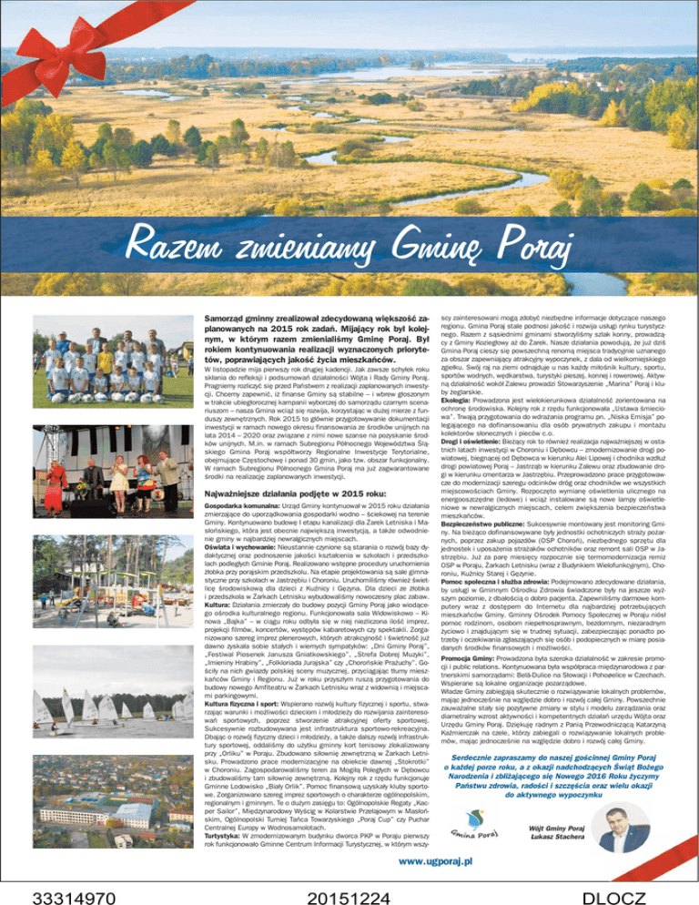 Razem zmieniamy Gminę Poraj Samorząd gminny zrealizował zdecydowaną większość zaplanowanych na 2015 rok zadań. Mijający rok był kolejnym, w którym razem zmienialiśmy Gminę Poraj. Był rokiem kontynuowania realizacji wyznaczonych priorytetów, poprawiających jakość życia mieszkańców. W listopadzie mija pierwszy rok drugiej kadencji. Jak zawsze schyłek roku skłania do refleksji i podsumowań działalności Wójta i Rady Gminy Poraj. Pragniemy rozliczyć się przed Państwem z realizacji zaplanowanych inwestycji. Chcemy zapewnić, iż finanse Gminy są stabilne – i wbrew głoszonym w trakcie ubiegłorocznej kampanii wyborczej do samorządu czarnym scenariuszom – nasza Gmina wciąż się rozwija, korzystając w dużej mierze z funduszy zewnętrznych. Rok 2015 to głównie przygotowywanie dokumentacji inwestycji w ramach nowego okresu finansowania ze środków unijnych na lata 2014 – 2020 oraz związane z nimi nowe szanse na pozyskanie środków unijnych. M.in. w ramach Subregionu Północnego Województwa Śląskiego Gmina Poraj współtworzy Regionalne Inwestycje Terytorialne, obejmujące Częstochowę i ponad 30 gmin, jako tzw. obszar funkcjonalny. W ramach Subregionu Północnego Gmina Poraj ma już zagwarantowane środki na realizację zaplanowanych inwestycji. Najważniejsze działania podjęte w 2015 roku: Gospodarka komunalna: Urząd Gminy kontynuował w 2015 roku działania zmierzające do uporządkowania gospodarki wodno – ściekowej na terenie Gminy. Kontynuowano budowę I etapu kanalizacji dla Żarek Letniska i Masłońskiego, która jest obecnie największą inwestycją, a także odwodnienie gminy w najbardziej newralgicznych miejscach. Oświata i wychowanie: Nieustannie czynione są starania o rozwój bazy dydaktycznej oraz podnoszenie jakości kształcenia w szkołach i przedszkolach podległych Gminie Poraj. Realizowano wstępne procedury uruchomienia żłobka przy porajskim przedszkolu. Na etapie projektowania są sale gimnastyczne przy szkołach w Jastrzębiu i Choroniu. Uruchomiliśmy również świetlicę środowiskową dla dzieci z Kuźnicy i Gęzyna. Dla dzieci ze żłobka i przedszkola w Żarkach Letnisku wybudowaliśmy nowoczesny plac zabaw. Kultura: Działania zmierzały do budowy pozycji Gminy Poraj jako wiodącego ośrodka kulturalnego regionu. Funkcjonowała sala Widowiskowo – Kinowa „Bajka” – w ciągu roku odbyła się w niej niezliczona ilość imprez, projekcji filmów, koncertów, występów kabaretowych czy spektakli. Zorganizowano szereg imprez plenerowych, których atrakcyjność i świetność już dawno zyskała sobie stałych i wiernych sympatyków: „Dni Gminy Poraj”, „Festiwal Piosenek Janusza Gniatkowskiego”, „Strefa Dobrej Muzyki”, „Imieniny Hrabiny”, „Folkloriada Jurajska” czy „Chorońskie Prażuchy”. Gościły na nich gwiazdy polskiej sceny muzycznej, przyciągając tłumy mieszkańców Gminy i Regionu. Już w roku przyszłym ruszą przygotowania do budowy nowego Amfiteatru w Żarkach Letnisku wraz z widownią i miejscami parkingowymi. Kultura fizyczna i sport: Wspierano rozwój kultury fizycznej i sportu, stwarzając warunki i możliwości dzieciom i młodzieży do rozwijania zainteresowań sportowych, poprzez stworzenie atrakcyjnej oferty sportowej. Sukcesywnie rozbudowywana jest infrastruktura sportowo-rekreacyjna. Dbając o rozwój fizyczny dzieci i młodzieży, a także dalszy rozwój infrastruktury sportowej, oddaliśmy do użytku gminny kort tenisowy zlokalizowany przy „Orliku” w Poraju. Zbudowano siłownię zewnętrzną w Żarkach Letnisku. Prowadzono prace modernizacyjne na obiekcie dawnej „Stokrotki” w Choroniu. Zagospodarowaliśmy teren za Mogiłą Poległych w Dębowcu i zbudowaliśmy tam siłownię zewnętrzną. Kolejny rok z rzędu funkcjonuje Gminne Lodowisko „Biały Orlik”. Pomoc finansową uzyskały kluby sportowe. Zorganizowano szereg imprez sportowych o charakterze ogólnopolskim, regionalnym i gminnym. Te o dużym zasięgu to: Ogólnopolskie Regaty „Kacper Sailor”, Międzynarodowy Wyścig w Kolarstwie Przełajowym w Masłońskim, Ogólnopolski Turniej Tańca Towarzyskiego „Poraj Cup” czy Puchar Centralnej Europy w Wodnosamolotach. Turtystyka: W zmodernizowanym budynku dworca PKP w Poraju pierwszy rok funkcjonowało Gminne Centrum Informacji Turystycznej, w którym wszy- scy zainteresowani mogą zdobyć niezbędne informacje dotyczące naszego regionu. Gmina Poraj stale podnosi jakość i rozwija usługi rynku turystycznego. Razem z sąsiednimi gminami stworzyliśmy szlak konny, prowadzący z Gminy Koziegłowy aż do Żarek. Nasze działania powodują, że już dziś Gmina Poraj cieszy się powszechną renomą miejsca tradycyjnie uznanego za obszar zapewniający atrakcyjny wypoczynek, z dala od wielkomiejskiego zgiełku. Swój raj na ziemi odnajduje u nas każdy miłośnik kultury, sportu, sportów wodnych, wędkarstwa, turystyki pieszej, konnej i rowerowej. Aktywną działalność wokół Zalewu prowadzi Stowarzyszenie „Marina” Poraj i kluby żeglarskie. Ekologia: Prowadzona jest wielokierunkowa działalność zorientowana na ochronę środowiska. Kolejny rok z rzędu funkcjonowała „Ustawa śmieciowa”. Trwają przygotowania do wdrażania programu pn. „Niska Emisja” polegającego na dofinansowaniu dla osób prywatnych zakupu i montażu kolektorów słonecznych i pieców c.o. Drogi i oświetlenie: Bieżący rok to również realizacja najważniejszej w ostatnich latach inwestycji w Choroniu i Dębowcu – zmodernizowanie drogi powiatowej, biegnącej od Dębowca w kierunku Alei Lipowej i chodnika wzdłuż drogi powiatowej Poraj – Jastrząb w kierunku Zalewu oraz zbudowanie drogi w kierunku cmentarza w Jastrzębiu. Przeprowadzono prace przygotowawcze do modernizacji szeregu odcinków dróg oraz chodników we wszystkich miejscowościach Gminy. Rozpoczęto wymianę oświetlenia ulicznego na energooszczędne (ledowe) i wciąż instalowane są 
