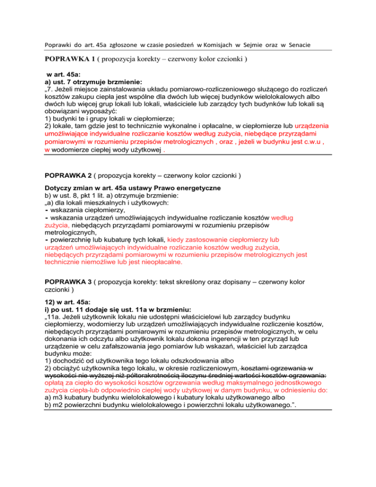 Poprawki do art. 45a zgłoszone w czasie posiedzeń w Komisjach w Sejmie oraz w Senacie POPRAWKA 1 ( propozycja korekty – czerwony kolor czcionki ) w art. 45a: a) ust. 7 otrzymuje brzmienie: „7. Jeżeli miejsce zainstalowania układu pomiarowo-rozliczeniowego służącego do rozliczeń kosztów zakupu ciepła jest wspólne dla dwóch lub więcej budynków wielolokalowych albo dwóch lub więcej grup lokali lub lokali, właściciele lub zarządcy tych budynków lub lokali są obowiązani wyposażyć: 1) budynki te i grupy lokali w ciepłomierze; 2) lokale, tam gdzie jest to technicznie wykonalne i opłacalne, w ciepłomierze lub urządzenia umożliwiające indywidualne rozliczanie kosztów według zużycia, niebędące przyrządami pomiarowymi w rozumieniu przepisów metrologicznych , oraz , jeżeli w budynku jest c.w.u , w wodomierze ciepłej wody użytkowej . POPRAWKA 2 ( propozycja korekty – czerwony kolor czcionki ) Dotyczy zmian w art. 45a ustawy Prawo energetyczne b) w ust. 8, pkt 1 lit. a) otrzymuje brzmienie: „a) dla lokali mieszkalnych i użytkowych: ⁃ wskazania ciepłomierzy, ⁃ wskazania urządzeń umożliwiających indywidualne rozliczanie kosztów według zużycia, niebędących przyrządami pomiarowymi w rozumieniu przepisów metrologicznych, ⁃ powierzchnię lub kubaturę tych lokali, kiedy zastosowanie ciepłomierzy lub urządzeń umożliwiających indywidualne rozliczanie kosztów według zużycia, niebędących przyrządami pomiarowymi w rozumieniu przepisów metrologicznych jest technicznie niemożliwe lub jest nieopłacalne. POPRAWKA 3 ( propozycja korekty: tekst skreślony oraz dopisany – czerwony kolor czcionki ) 12) w art. 45a: i) po ust. 11 dodaje się ust. 11a w brzmieniu: „11a. Jeżeli użytkownik lokalu nie udostępni właścicielowi lub zarządcy budynku ciepłomierzy, wodomierzy lub urządzeń umożliwiających indywidualne rozliczenie kosztów, niebędących przyrządami pomiarowymi w rozumieniu przepisów metrologicznych, w celu dokonania ich odczytu albo użytkownik lokalu dokona ingerencji w ten przyrząd lub urządzenie w celu zafałszowania jego pomiarów lub wskazań, właściciel lub zarządca budynku może: 1) dochodzić od użytkownika tego lokalu odszkodowania albo 2) obciążyć użytkownika tego lokalu, w okresie rozliczeniowym, kosztami ogrzewania w wysokości nie wyższej niż półtorakrotnością iloczynu średniej wartości kosztów ogrzewania: opłatą za ciepło do wysokości kosztów ogrzewania według maksymalnego jednostkowego zużycia ciepła lub odpowiednio ciepłej wody użytkowej w danym budynku, w odniesieniu do: a) m3 kubatury budynku wielolokalowego i kubatury lokalu użytkowanego albo b) m2 powierzchni budynku wielolokalowego i powierzchni lokalu użytkowanego.”.