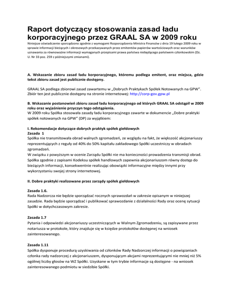 Raport dotyczący stosowania zasad ładu korporacyjnego przez GRAAL SA w 2009 roku Niniejsze oświadczenie sporządzono zgodnie z wymogami Rozporządzenia Ministra Finansów z dnia 19 lutego 2009 roku w sprawie informacji bieżących i okresowych przekazywanych przez emitentów papierów wartościowych oraz warunków uznawania za równoważne informacji wymaganych przepisami prawa państwa niebędącego państwem członkowskim (Dz. U. Nr 33 poz. 259 z późniejszymi zmianami). A. Wskazanie zbioru zasad ładu korporacyjnego, któremu podlega emitent, oraz miejsca, gdzie tekst zbioru zasad jest publicznie dostępny. GRAAL SA podlega zbiorowi zasad zawartemu w „Dobrych Praktykach Spółek Notowanych na GPW”. Zbiór ten jest publicznie dostępny na stronie internetowej: http://corp‐gov.gpw.pl B. Wskazanie postanowień zbioru zasad ładu korporacyjnego od których GRAAL SA odstąpił w 2009 roku oraz wyjaśnienie przyczyn tego odstąpienia. W 2009 roku Spółka stosowała zasady ładu korporacyjnego zawarte w dokumencie „Dobre praktyki spółek notowanych na GPW” (DP) za wyjątkiem: I. Rekomendacje dotyczące dobrych praktyk spółek giełdowych Zasada 1 Spółka nie transmitowała obrad walnych zgromadzeń, ze względu na fakt, że większość akcjonariuszy reprezentujących z reguły od 40% do 50% kapitału zakładowego Spółki uczestniczy w obradach zgromadzeń. W związku z powyższym w ocenie Zarządu Spółki nie ma konieczności prowadzenia transmisji obrad. Spółka zgodnie z zapisami Kodeksu spółek handlowych zapewnia akcjonariuszom równy dostęp do bieżących informacji, konsekwentnie realizując obowiązki informacyjne między innymi przy wykorzystaniu swojej strony internetowej. II. Dobre praktyki realizowane przez zarządy spółek giełdowych Zasada 1.6. Rada Nadzorcza nie będzie sporządzać rocznych sprawozdań w zakresie opisanym w niniejszej zasadzie. Rada będzie sporządzać i publikować sprawozdanie z działalności Rady oraz ocenę sytuacji Spółki w dotychczasowym zakresie. Zasada 1.7 Pytania i odpowiedzi akcjonariuszy uczestniczących w Walnym Zgromadzeniu, są zapisywane przez notariusza w protokole, który znajduje się w księdze protokołów dostępnej na wniosek zainteresowanego. Zasada 1.11 Spółka dysponuje procedurą uzyskiwania od członków Rady Nadzorczej informacji o powiązaniach członka rady nadzorczej z akcjonariuszem, dysponującym akcjami reprezentującymi nie mniej niż 5% ogólnej liczby głosów na WZ Spółki. Uzyskane w tym trybie informacje są dostępne ‐ na wniosek zainteresowanego podmiotu w siedzibie Spółki. Zasada 2. Spółka nie zapewnia funkcjonowania strony internetowej w języku angielskim, w zakresie wskazanym w części II.1. DP, z uwagi na wysokie koszty usług z tym związane. W języku angielskim są zamieszczane jedynie wybrane dokumenty i materiały korporacyjne, jednakże w zakresie węższym niż to wynika z zasady II.2. Zasada 3. Zawieranie umów w imieniu Spółki należy do kompetencji Zarządu Spółki, w ramach obowiązujących przepisów prawa. III. Dobre praktyki stosowane przez członków rad nadzorczych Zasada 1.1) Rada Nadzorcza raz w roku sporządza i przedstawia Walnemu Zgromadzeniu zwięzłą ocenę sytuacji Spółki w dotychczasowym zakresie. Zasada 1.2) Oceny pracy rady i jej poszczególnych członków dokonuje Walne Zgromadzenie. Zasada 6. Zasada nie będzie stosowana z uwagi na specyfikę układu właścicielskiego. Zasada 9. Zasada nie będzie stosowana z uwagi na niestosowanie zasady 3 w części II DS. Zasady ładu korporacyjnego zawarte w dokumencie „Dobre Praktyki Spółek Notowanych na GPW” oraz wykaz tych, których emitent nie stosuje, są dostępne na jego stronie internetowej pod adresem: www.graal.pl C. Opis głównych cech stosowanych w przedsiębiorstwie emitenta systemów kontroli wewnętrznej i zarządzania ryzykiem w odniesieniu do procesu sporządzania sprawozdań finansowych i skonsolidowanych sprawozdań finansowych. Sprawozdaniem skonsolidowanym Grupy Kapitałowej Graal objętych jest 9 podmiotów w tym: 1) jeden podmiot stowarzyszony prowadzący księgi i sporządzający sprawozdania jednostkowe w oparciu o polską Ustawę o rachunkowości, 2) 8 podmiotów prowadzących księgi i sporządzających sprawozdania w oparciu o MSR i MSSF. W 9 spółkach (w tym jednostką dominującą i stowarzyszoną), wyodrębniony jest zespół odpowiedzialny za prowadzenie ksiąg rachunkowych i przygotowanie sprawozdań jednostkowych, który zatrudnia osoby posiadające niezbędne kwalifikacje, wiedzę i doświadczenie w zakresie prowadzenia ksiąg rachunkowych oraz sporządzania sprawozdań finansowych. Zespół księgowy Spółki Dominującej weryfikuje również sprawozdania finansowe przygotowywane przez podmioty posiadające własne zespoły księgowe oraz dokonuje przekształceń sprawozdań jednostkowych spółek zależnych i spółki stowarzyszonej w celu zapewnienia porównywalności danych i przestrzegania polityki rachunkowości obowiązującej w Grupie. Do szczególnych zadań tego zespołu należy m.in. zapewnienie zgodności sprawozdań i prezentowanych w nich danych z przepisami prawa, współpraca z rewidentami zewnętrznymi, bieżące weryfikowanie stanu ksiąg oraz urządzeń księgowych ze stanem rzeczywistym i obowiązującymi w Grupie zasadami rachunkowości, śledzenie zmian w przepisach i regulacjach zewnętrznych odnoszących się do wymogów sprawozdawczości spółek publicznych i przygotowanie do ich wprowadzenia z odpowiednim wyprzedzeniem czasowym. Proces przygotowania danych finansowych na potrzeby sprawozdawczości nie jest zautomatyzowany. Spółki nie posiadają jednolitego system finansowo księgowego. Wszelkie tabele finansowe i dane opisowe przygotowywane są przez zespół księgowy, dla którego głównym źródłem informacji są księgi handlowe oraz dodatkowe moduły systemu komputerowego, wykorzystywane do przygotowania sprawozdań wewnętrz