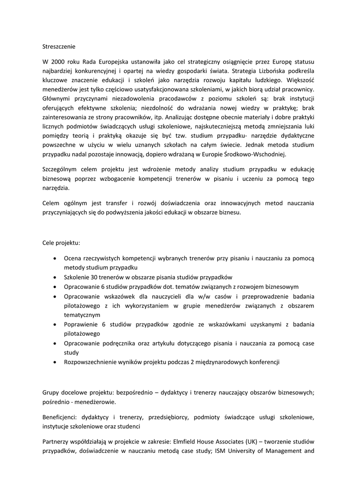Streszczenie W 2000 roku Rada Europejska ustanowiła jako cel strategiczny osiągnięcie przez Europę statusu najbardziej konkurencyjnej i opartej na wiedzy gospodarki świata. Strategia Lizbońska podkreśla kluczowe znaczenie edukacji i szkoleń jako narzędzia rozwoju kapitału ludzkiego. Większość menedżerów jest tylko częściowo usatysfakcjonowana szkoleniami, w jakich biorą udział pracownicy. Głównymi przyczynami niezadowolenia pracodawców z poziomu szkoleń są: brak instytucji oferujących efektywne szkolenia; niezdolność do wdrażania nowej wiedzy w praktykę; brak zainteresowania ze strony pracowników, itp. Analizując dostępne obecnie materiały i dobre praktyki licznych podmiotów świadczących usługi szkoleniowe, najskuteczniejszą metodą zmniejszania luki pomiędzy teorią i praktyką okazuje się być tzw. studium przypadku- narzędzie dydaktyczne powszechne w użyciu w wielu uznanych szkołach na całym świecie. Jednak metoda studium przypadku nadal pozostaje innowacją, dopiero wdrażaną w Europie Środkowo-Wschodniej. Szczególnym celem projektu jest wdrożenie metody analizy studium przypadku w edukację biznesową poprzez wzbogacenie kompetencji trenerów w pisaniu i uczeniu za pomocą tego narzędzia. Celem ogólnym jest transfer i rozwój doświadczenia oraz innowacyjnych metod nauczania przyczyniających się do podwyższenia jakości edukacji w obszarze biznesu. Cele projektu: Ocena rzeczywistych kompetencji wybranych trenerów przy pisaniu i nauczaniu za pomocą metody studium przypadku Szkolenie 30 trenerów w obszarze pisania studiów przypadków Opracowanie 6 studiów przypadków dot. tematów związanych z rozwojem biznesowym Opracowanie wskazówek dla nauczycieli dla w/w casów i przeprowadzenie badania pilotażowego z ich wykorzystaniem w grupie menedżerów związanych z obszarem tematycznym Poprawienie 6 studiów przypadków zgodnie ze wskazówkami uzyskanymi z badania pilotażowego Opracowanie podręcznika oraz artykułu dotyczącego pisania i nauczania za pomocą case study Rozpowszechnienie wyników projektu podczas 2 międzynarodowych konferencji Grupy docelowe projektu: bezpośrednio – dydaktycy i trenerzy nauczający obszarów biznesowych; pośrednio - menedżerowie. Beneficjenci: dydaktycy i trenerzy, przedsiębiorcy, podmioty świadczące usługi szkoleniowe, instytucje szkoleniowe oraz studenci Partnerzy współdziałają w projekcie w zakresie: Elmfield House Associates (UK) – tworzenie studiów przypadków, doświadczenie w nauczaniu metodą case study; ISM University of Management and Economics (LT Business University) – transfer innowacyjnych metod w nauczaniu osób dorosłych; Navigator Consultancy (UK) – badania w celu uzyskania danych sektora biznesowego oraz przedstawicielstwo firm biorących udział w opracowywaniu i badaniu pilotażowym casów. Partnerzy są profesjonalistami w zakresie szkoleń, edukacji w obszarze biznesowym, badaniach, tworzeniu oraz nauczaniu za pomocą studium przypadku, a także zdobyli doświadczenie w rozpowszechnianiu rezultatów i zarządzaniu projektem. Osiągnięte rezultaty: 30 przeszkolonych trenerów, 6 studiów przypadków w języku angielskim, polskim i litewskim, podręcznik dotyczący pisania i nauczania za pomocą case study, artykuł w Baltic Journal of Management http://www.emeraldinsight.com/bjm.htm) oraz 2 konferencje międzynarodowe. Czas trwania projektu: 24 miesiące. Czemu służy Projekt? Przedsiębiorstwa twierdzą, że jednostki naukowo – badawcze pracują w oderwaniu od rzeczywistego świata, a dostarczana wiedza nie jest adekwatna do potrzeb sektora biznesowego. Wyniki badań przeprowadzanych w przedsiębiorstwach wskazują, że większość menedżerów jest tylko częściowo zadowolona ze szkoleń swoich pracowników. Dlatego też priorytetem tego Projektu stało się minimalizowanie luki pomiędzy oczekiwaniami podmiotów świadczących usługi szkoleniowe i przedsiębiorstw, poprzez ciągłe doskonalenie umiejętności trenerów. Głównymi przyczynami niezadowolenia pracodawców z poziomu szkoleń są: brak instytucji oferujących efektywne szkolenia; niezdolność do wdrażania nowej wiedzy w praktykę; brak zainteresowania ze strony pracowników, itp. Analizując dostępne obecnie materiały i dobre praktyki licznych podmiotów świadczących usługi szkoleniowe, najskuteczniejszą metodą zmniejszania luki pomiędzy teorią i praktyką okazuje się być tzw. studium przypadku. To narzędzie dydaktyczne jest w powszechnym użyciu w wielu uznanych szkołach na całym świecie, takich jak przykładowo Harvard Business School, IMD, Oxford, Cambridge. Jednak metoda studium przypadku nadal pozostaje innowacją, dopiero wdrażaną w Europie Środkowo-Wschodniej. Do tej pory nie opracowano jeszcze wielu casów ilustrujących i analizujących rozwój biznesu w różnych krajach Europy Środkowo-Wschodniej, które można by zastosować w nauczaniu biznesu w tym regionie. Głównymi wskaźnikami, które ilustrują te potrzeby są: Wpływ nauczania metodą studiów przypadków - tworzenie i stosowanie casów w nauczaniu osób dorosłych jest szeroko podkreślane w literaturze przedmiotu: używanie studiów przypadków jest efektywnym mechanizmem na przytaczanie rzeczywistych rozwiązań w dydaktyce (Easton, 1982; Leenders and Erskine, 1989; Richardson et al., 1995); casy są uznaną techniką w naukach zarządzania i edukacji (Rees and Porter, 2002); studium przypadku jest szczególnie istotne w ciągłym szkoleniuzawodowym (Ross, Wright, 2000). Autorzy podkreślają różnice w stosowaniu metody case study oraz tradycyjnych sposobów nauczania: studia przypadków wzbogacają proces nauczania angażując i pobudzając uczestników do aktywnego udziału, które jest efektywniejsze niż jego tradycyjny, pasywny odpowiednik – wykład (OCinneide, 1998); studia przypadków pozwalają na zgłębienie istoty problemów, w odróżnieniu od powierzchownego zapoznania 