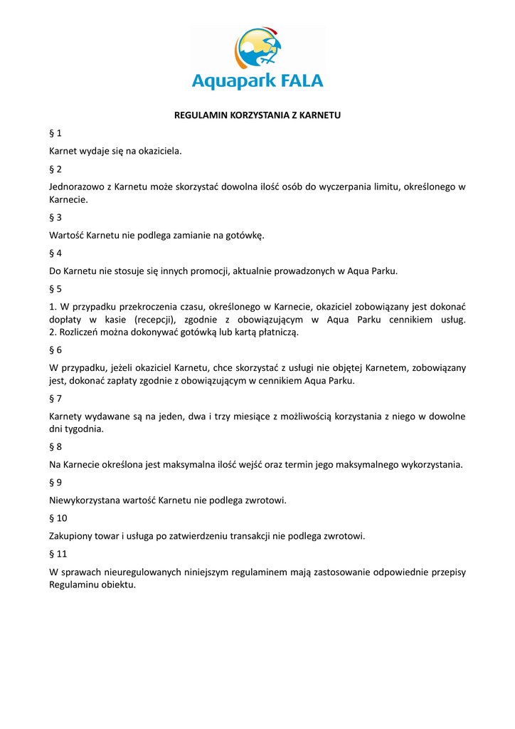 REGULAMIN KORZYSTANIA Z KARNETU §1 Karnet wydaje się na okaziciela. §2 Jednorazowo z Karnetu może skorzystać dowolna ilość osób do wyczerpania limitu, określonego w Karnecie. §3 Wartość Karnetu nie podlega zamianie na gotówkę. §4 Do Karnetu nie stosuje się innych promocji, aktualnie prowadzonych w Aqua Parku. §5 1. W przypadku przekroczenia czasu, określonego w Karnecie, okaziciel zobowiązany jest dokonać dopłaty w kasie (recepcji), zgodnie z obowiązującym w Aqua Parku cennikiem usług. 2. Rozliczeń można dokonywać gotówką lub kartą płatniczą. §6 W przypadku, jeżeli okaziciel Karnetu, chce skorzystać z usługi nie objętej Karnetem, zobowiązany jest, dokonać zapłaty zgodnie z obowiązującym w cennikiem Aqua Parku. §7 Karnety wydawane są na jeden, dwa i trzy miesiące z możliwością korzystania z niego w dowolne dni tygodnia. §8 Na Karnecie określona jest maksymalna ilość wejść oraz termin jego maksymalnego wykorzystania. §9 Niewykorzystana wartość Karnetu nie podlega zwrotowi. § 10 Zakupiony towar i usługa po zatwierdzeniu transakcji nie podlega zwrotowi. § 11 W sprawach nieuregulowanych niniejszym regulaminem mają zastosowanie odpowiednie przepisy Regulaminu obiektu.