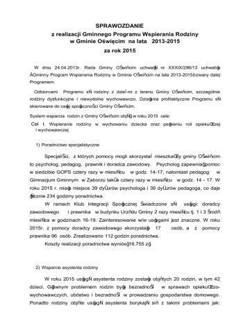 SPRAWOZDANIE z realizacji Gminnego Programu Wspierania Rodziny w Gminie Oświęcim na lata 2013-2015 za rok 2015 W dniu 24.04.2013r. Rada Gminy Oświęcim uchwałą nr XXXIX/296/13 uchwaliła „ Gminny Program Wspierania Rodziny w Gminie Oświęcim na lata 2013-2015” zwany dalej Programem. Odbiorcami Programu są rodziny z dziećmi z terenu Gminy Oświęcim, szczególnie rodziny dysfunkcyjne i niewydolne wychowawczo. Działania profilaktyczne Programu są skierowane do całej społeczności Gminy Oświęcim. System wsparcia rodzin z Gminy Oświęcim objął w roku 2015 cele: Cel I. Wspieranie rodziny w wychowaniu dziecka oraz pełnieniu roli opiekuńczej i wychowawczej 1) Poradnictwo specjalistyczne Specjaliści, z których pomocy mogli skorzystać mieszkańcy gminy Oświęcim to psycholog, pedagog, prawnik i doradca zawodowy. Psycholog zapewniał pomoc w siedzibie GOPS cztery razy w miesiącu w godz. 14-17, natomiast pedagog w Gimnazjum Gminnym w Zaborzu także cztery razy w miesiącu w godz. 14 - 17. W roku 2015 r. miało miejsce 39 dyżurów psychologa i 39 dyżurów pedagoga, co daje łącznie 234 godziny poradnictwa. W ramach Klub Integracji Społecznej świadczone są zawodowego usługi: doradcy i prawnika w budynku Urzędu Gminy 2 razy miesiącu tj. 1 i 3 środę miesiąca w godzinach 16-19. Zainteresowanie w/w usługami jest znaczne. W roku 2015r. z pomocy doradcy zawodowego skorzystało 17 osób, a z pomocy prawnika 96 osób. Zrealizowano 112 godzin poradnictwa. Koszty realizacji poradnictwa wyniósł 16.755 zł 2) Wsparcie asystenta rodziny W roku 2015 usługą asystenta rodziny zostało objętych 20 rodzin, w tym 42 dzieci. Głównym problemem rodzin była bezradność w sprawach opiekuńczo- wychowawczych, ubóstwo i bezradność w prowadzeniu gospodarstwa domowego. Ponadto rodziny objęte usługą asystenta borykają się z takimi problemami jak: znaczny konflikt miedzy małżonkami, rodzina niepełna, zaburzenia w funkcjonowaniu dziecka i ograniczona władza rodzicielska nad dziećmi. Asystenci rodziny, w ramach wykonywanych obowiązków współpracowali z wieloma instytucjami m.in. z placówkami oświatowymi, Zespołem Kurateli Sądowej, Poradnią Psychologiczno-Pedagogiczną, Powiatowym Centrum Pomocy Rodzinie, służbą zdrowia, Klubem Integracji Społecznej. Asystenci rodziny w ramach swoich obowiązków podejmowali m.in. takie działania: - pomoc w sprzątaniu mieszkania, - trening higieniczny, - monitorowanie sytuacji szkolnej dzieci, -łagodzenie konfliktów wewnątrzrodzinnych, - udzielanie wsparcia emocjonalnego. Koszty zatrudnienia asystenta rodziny wyniosły: 64.105,44zł w tym z dotacji 22.283.98zł z budżetu państwa otrzymanej w ramach programu „Asystent rodziny”. 3) Zapewnienie miejsc w placówkach wsparcia dziennego Dzieci z Gminy Oświęcim korzystały w roku 2015 z placówek wsparcia dziennego na terenie Oświęcimia tj. świetlic ze Stowarzyszenie „Szansa” socjoterapeutycznych prowadzonych przez w tym: - filia na osiedlu Zasole ul. Więźniów Oświęcimia 10, do której uczęszczało 11 dzieci, - filia na osiedlu Błonie ul. Bałandy 4d, do której uczęszczało 7 dzieci. Cel główny pobytu dzieci w świetlicy to zapewnienie im opieki, zapobieganie marginalizacji, wskazywanie alternatywnych form spędzania czasu wolnego oraz wdrażanie dzieci do zachowań chroniących przez zagrożeniem uzależnieniami, a także wyrównywanie deficytów rozwojowych i nabywanie przez uczestników zajęć umiejętności prospołecznych, w tym nieagresywnej komunikacji i współpracy, jak również pomoc w trudnościach szkolnych. Powyższe cele były realizowane m.in. poprzez: - zajęcia socjoterapeutyczne, - zajęcia dydaktyczno-wychowawcze, - zajęcia rekreacyjne, - społeczność korekcyjną, - terapię indywidualną, -współpracę z rodzicami, -zajęcia w okresie wakacji i ferii zimowych, -udział w imprezach typu m.in: Parada Smoków w Krakowie, „Sprzątanie świata”, akcja „Kurier Świętego Mikołaja, udział w konkursach lokalnych i ogólnopolskich. Wydatki związane z pobytem w 2015r. wyniosły 35 000 zł. Cel II. Monitorowanie sytuacji rodzin zagrożonych wykluczeniem społecznym 1) - Inicjowanie współpracy w indywidualnych sprawach z zakresu pomocy dziecku i rodzinie - Rozwój Zespołów Interdyscyplinarnych na rzecz rodziny w kryzysie - Interdyscyplinarny kontakt instytucji działających na rzecz dziecka i rodziny · Zespół Interdyscyplinarny na Rzecz Przeciwdziałania Przemocy w Rodzinie dla Gminy Oświęcim funkcjonuje od 10 lutego 2011r. W roku 2015r. miało miejsce 5 spotkań Zespołu: 11 lutego, 28 maja, 30 lipca, 29 września oraz 14 grudnia. W roku 2015 do Przewodniczącej Zespołu wpłynęło 28 Niebieskich Kart, z czego Gminny Ośrodek Pomocy Społecznej założył 8 Niebieskich Kart, Komenda Powiatowa Policji założyła 16 Niebieskich Kart, 1 Niebieska Karta została założona przez placówkę oświatową (Szkoła Podstawowa we Włosienicy) oraz 1 Niebieska Karta przez Ośrodek Interwencji Kryzysowej Ponadto 1 Niebieska Karta została przesłana Interdyscyplinarnego w Oświęcimiu. z Miejskiego Zespołu w Oświęcimiu. W roku 2015r. odbyło się 125 spotkań grup roboczych dla 41 rodzin. W skład grup roboczych wchodzili przedstawiciele Gminnego Ośrodka Pomocy Społecznej, Policji, Gminnej Komisji Rozwiązywania Problemów Alkoholowych, placówek oświatowych (dyrektorzy, pedagodzy, nauczyciele szkół i przedszkoli), przedstawiciele Ośrodka Interwencji Kryzysowej · i Zespołu Kuratorskiej Służby Sądowej. Udział w Forum Asystentów Rodziny, które organizowane jest przez zrzeszenie asystentów rodziny z następujących gmin: Wielka Wieś, Jerzmanowice, Czernichów, Michałowice, Zielonki, Kocmyrzów, Zabierzów, Oświęcim. Spotkania organizowane są cyklicznie co miesiąc w danej gminie, mają charakter wymiany doświadczeń, „koleżeńskiej superwizji”, omawiania bieżących spraw związanych z asystenturą. W r