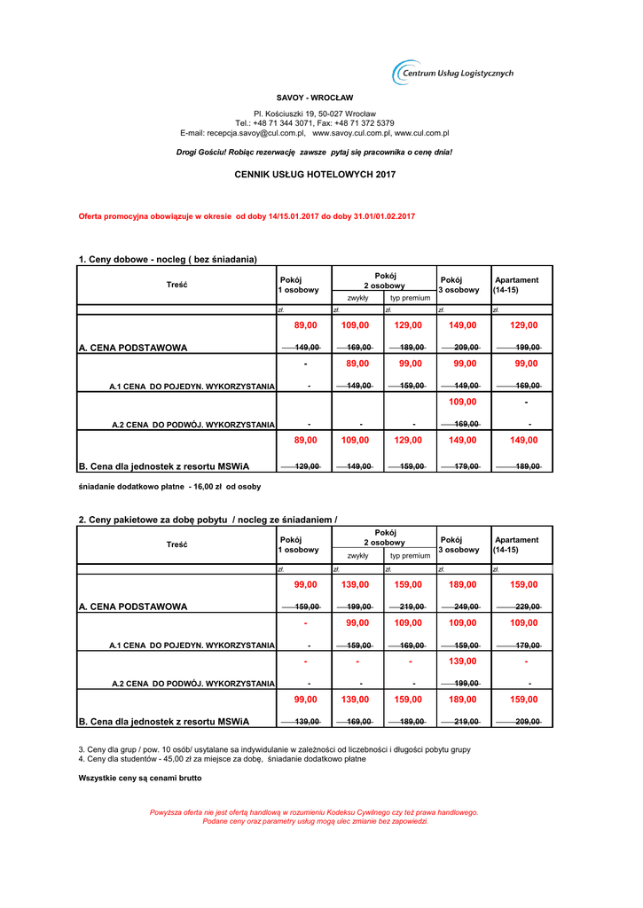CENNIK SAVOY - WROCŁAW Pl. Kościuszki 19, 50-027 Wrocław Tel.: +48 71 344 3071, Fax: +48 71 372 5379 E-mail: [email protected], www.savoy.cul.com.pl, www.cul.com.pl Drogi Gościu! Robiąc rezerwację zawsze pytaj się pracownika o cenę dnia! CENNIK USŁUG HOTELOWYCH 2017 Oferta promocyjna obowiązuje w okresie od doby 14/15.01.2017 do doby 31.01/01.02.2017 1. Ceny dobowe - nocleg ( bez śniadania) Treść Pokój 2 osobowy Pokój 1 osobowy zł. A. CENA PODSTAWOWA zwykły zł. typ premium zł. Pokój 3 osobowy Apartament (14-15) zł. zł. 89,00 109,00 129,00 149,00 129,00 149,00 169,00 189,00 209,00 199,00 - 89,00 99,00 99,00 99,00 149,00 159,00 149,00 169,00 - A.1 CENA DO POJEDYN. WYKORZYSTANIA 109,00 - A.2 CENA DO PODWÓJ. WYKORZYSTANIA B. Cena dla jednostek z resortu MSWiA - - - 169,00 - 89,00 109,00 129,00 149,00 149,00 129,00 149,00 159,00 179,00 189,00 Pokój 3 osobowy Apartament (14-15) zł. zł. śniadanie dodatkowo płatne - 16,00 zł od osoby 2. Ceny pakietowe za dobę pobytu / nocleg ze śniadaniem / Treść zł. A. CENA PODSTAWOWA typ premium zł. 99,00 139,00 159,00 189,00 159,00 159,00 199,00 219,00 249,00 229,00 - 99,00 109,00 109,00 109,00 159,00 169,00 159,00 179,00 - - - - B. Cena dla jednostek z resortu MSWiA zwykły zł. A.1 CENA DO POJEDYN. WYKORZYSTANIA A.2 CENA DO PODWÓJ. WYKORZYSTANIA Pokój 2 osobowy Pokój 1 osobowy - - 139,00 - 199,00 - 99,00 139,00 159,00 189,00 159,00 139,00 169,00 189,00 219,00 209,00 3. Ceny dla grup / pow. 10 osób/ usytalane sa indywidulanie w zależności od liczebności i długości pobytu grupy 4. Ceny dla studentów - 45,00 zł za miejsce za dobę, śniadanie dodatkowo płatne Wszystkie ceny są cenami brutto Powyższa oferta nie jest ofertą handlową w rozumieniu Kodeksu Cywilnego czy też prawa handlowego. Podane ceny oraz parametry usług mogą ulec zmianie bez zapowiedzi.