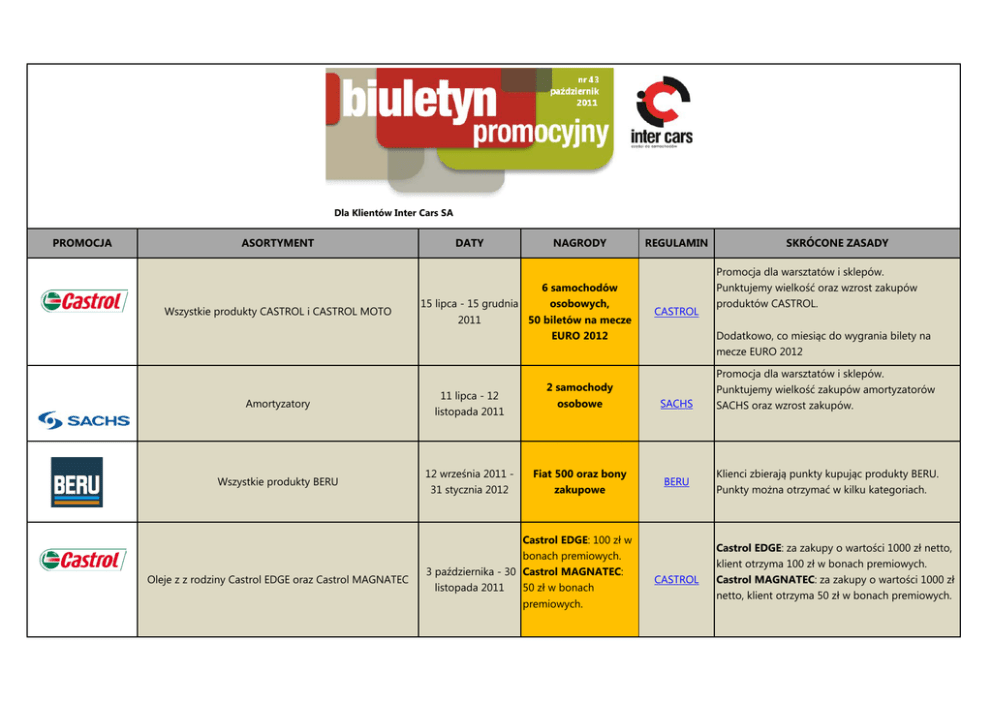 nr 43 nr 42 październik październik 2011 2011 Dla Klientów Inter Cars SA PROMOCJA ASORTYMENT Wszystkie produkty CASTROL i CASTROL MOTO DATY 6 samochodów 15 lipca - 15 grudnia osobowych, 2011 50 biletów na mecze EURO 2012 Amortyzatory 11 lipca - 12 listopada 2011 Wszystkie produkty BERU 12 września 2011 31 stycznia 2012 Oleje z z rodziny Castrol EDGE oraz Castrol MAGNATEC NAGRODY 2 samochody osobowe Fiat 500 oraz bony zakupowe Castrol EDGE: 100 zł w bonach premiowych. 3 października - 30 Castrol MAGNATEC: listopada 2011 50 zł w bonach premiowych. REGULAMIN CASTROL SKRÓCONE ZASADY Promocja dla warsztatów i sklepów. Punktujemy wielkość oraz wzrost zakupów produktów CASTROL. Dodatkowo, co miesiąc do wygrania bilety na mecze EURO 2012 SACHS BERU CASTROL Promocja dla warsztatów i sklepów. Punktujemy wielkość zakupów amortyzatorów SACHS oraz wzrost zakupów. Klienci zbierają punkty kupując produkty BERU. Punkty można otrzymać w kilku kategoriach. Castrol EDGE: za zakupy o wartości 1000 zł netto, klient otrzyma 100 zł w bonach premiowych. Castrol MAGNATEC: za zakupy o wartości 1000 zł netto, klient otrzyma 50 zł w bonach premiowych. PROMOCJA ASORTYMENT DATY NAGRODY REGULAMIN SKRÓCONE ZASADY 4MAX 1201-00-0013E +P = 200L (-22°C) zimowy płyn do spryskiwaczy (do wyczerpania zapasów) 1201-00-0020E +P = 200L (-80) zimowy koncentrat do spryskiwaczy (do wyczerpania zapasów) 1201-00-0013N +P = 200L (-22°C) NANO+ zimowy płyn do spryskiwaczy 1201-00-0020N +P = 200L (-60°C) NANO+ zimowy koncentrat od września do spryskiwaczy Za każdy zakup płynu czy koncentratu zimowego REGULAMIN w opakowaniach 60L i 200L klient otrzymuje ręczną pompkę. CARTECHNIC CART MA5571526 +P = 60L (-60C) Zimowy koncentrat do spryskiwaczy CART MA5571534 +P = 200L (-60C) Zimowy koncentrat do spryskiwaczy 4MAX 1601-00-0005E +P --> 4Max 60L płyn do chłodnic -35°C, + pompka - (do wyczerpania zapasów) 1601-00-0006E +P --> 4Max 200L płyn do chłodnic -35°C + pompka - (do wyczerpania zapasów) 1601-00-9995E +P --> 4Max 50L koncentrat do chłodnic (1:1=35°C) + pompka - (do wyczerpania zapasów) 1601-00-9996E +P --> 4Max 200L koncentrat do chłodnic (1:1=35°C) + pompka - (do wyczerpania zapasów) CARTECHNIC CART999 60L +P --> CARTECHNIC - ATR, konc. do chłodnic /1:1=-36 C/ 60L + pompka - (do wyczerpania zapasów) CART999 200L +P --> CARTECHNIC - ATR, konc. do chłodnic /1:1=-36 C/ 200L + pompka - (do wyczerpania zapasów) CART999 CT12 PLUS 60L +P --> CARTECHNIC - ATR, bezkrzemianowy konc. do chłodnic /1:1=-36 C/ 60L + pompka (do wyczerpania zapasów) CART999 CT12 PLUS 200L +P --> CARTECHNIC - ATR, bezkrzemianowy konc. do chłodnic /1:1=-36 C/ 200L + pompka (do wyczerpania zapasów) od września Za każdy zakup płynu lub koncentratu do chłodnic w opakowaniach 50L, 60L i 200L klient otrzymuje ręczną pompkę. PROMOCJA ASORTYMENT DATY Świece zapłonowe DENSO serii TT REGULAMIN SKRÓCONE ZASADY Możliwość skorzystania Oferta skierowana jest do sieci serwisowych: Qz oferty leasingowej na SERVICE, AUTO CREW, PERFECT SERVICE i preferencyjnych MOTOINTEGRATOR i dotyczy leasingu wybranego REGULAMIN warunkach oraz auta poprzez jedną z firm leasingowych (do refudacji jednym z wielu wyboru Raiffeisen Leasing lub EFL), okres trwania programów leasingu 36 lub 48 miesięcy. inwestycyinych IC Skoda Fabia oraz Ford Fiesta jako auto zastępcze w leasingu na 36 lub 48 miesięcy Wybrane urządzenia wyposażenia warsztatowego NAGRODY 5 września - 31 października 2011 10 października - 30 30 punktów IC Premia listopada 2011 Plus Świece żarowe NGK 3 października - 31 grudnia 2011 Ochraniacz na błotnik Filtry firmy KNECHT 26 września - 31 grudnia 2011 Bon premiowy w wartości 50 zł LEASING W okresie trwania promocji na wybrany asortyment wyposażenia warsztatowego leasing w EFL z oprocentowaniem 3% rocznie. Lista urządzeń biorących udział w promocji dostępna u PH. DENSO Za każde 13 zł netto klient otrzyma 30 punktów IC Premia Plus. NGK KNECHT Za zakupy produktów Knecht w wyskości 1500 zł netto klient otrzyma bon premiowy w wartości 50 zł. PROMOCJA ASORTYMENT DATY NAGRODY Wytypowane produkty/producenci z określonego asortymentu proponowane do pakietów osobowych i ciężarowych. 25 sierpnia 2011 15 stycznia 2012 Warunki handlowe, punkty IC Premia Opony zimowe: osobowe, dostawcze, 4x4 i SUV wszystkich marek i producentów dostepne w Inter Cars SA. 1 lipca 2011 - 28 luty 2012 Bony zakupowe Isnieje możliwość w Oferta ograniczona pełni refundowania rat Przenośny tester KTS 340 i 540 z 4 letnim abonamentem ilościowo. Ważna do leasingowych poprzez w leasingu 108% na 48 m-cy. wyczerpania liczne programy zapasów. inwestycyjne dostępne w Inter Cars SA. Olej silnikowy 4MAX 2001-02-0007E: 200L Olej silnikowy COMMA ADVANCED DIESEL 10W40 205 L Od 14 września do wyczerpania zapasów. Od 1 sierpnia do wyczerpania zapasów. REGULAMIN SKRÓCONE ZASADY APTECZKA Kupując wytypowane produkty z określonego WARSZTATOW asortymentu, otrzymasz specjalne warunki A handlowe oraz punkty IC Premia. BONY ZAKUPOWE KTS Za zakupy opon zimowych klientom przyznawane będą punkty. Za każde wydane 10 PLN netto przyznany zostanie 1 punkt. Szczegóły u Przedstawicieli Handlowych. Polar XL 3 szt. i pasta do rąk 4MAX 10L (2 sztuki) Do każdej kupionej beczki oleju (200 L) 4MAX 2001-02-0007E, otrzymasz dodatkowo: polar XL (3 sztuki) i pastę do rąk 4MAX 10L (2 sztuki). Uwaga - gratis wysyłany osobno. 25L oleju silnikowego COMMA ADVANCED DIESEL 10W40 Do każdej kupionej beczki oleju (205 L) COMMA ADVANCED DIESEL 10W40, otrzymasz dodatkowo 25L tego samego oleju gratis. Uwaga - gratis wysyłany osobno. INNE NAGRODA MIESIĄCA październik 2011 TERMINAL Verifone VX 510 z modemem GPRS październik Przez cały czas trwania oferty. 19 września - 20 listopada 2011 Apple iPod classic 160GB (srebrny) + stacja dokująca Philips DS3000 Fidelio NAGRODA MIESIĄCA Oferta skierowana jest do wszystkich klientów, którzy c