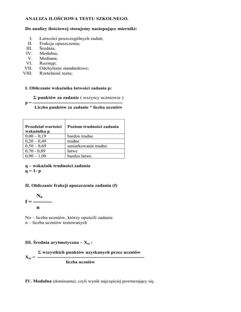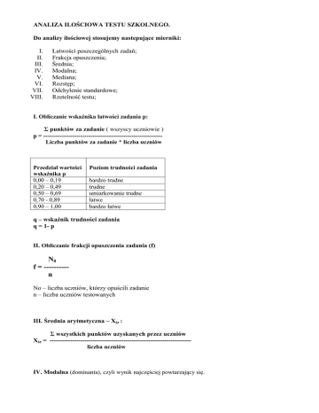 ANALIZA ILOŚCIOWA TESTU SZKOLNEGO. Do analizy ilościowej stosujemy nastepujące mierniki: I. II. III. IV. V. VI. VII. VIII. Łatwości poszczególnych zadań; Frakcja opuszczenia; Średnia; Modalna; Mediana; Rozstęp; Odchylenie standardowe; Rzetelność testu; I. Obliczanie wskaźnika łatwości zadania p: Σ punktów za zadanie ( wszyscy uczniowie ) p = ---------------------------------------------------------Liczba punktów za zadanie * liczba uczniów Przedział wartości wskaźnika p 0,00 – 0,19 0,20 – 0,49 0,50 – 0,69 0,70 - 0,89 0,90 – 1,00 Poziom trudności zadania bardzo trudne trudne umiarkowanie trudne łatwe bardzo łatwe q – wskaźnik trudności zadania q = 1- p II. Obliczanie frakcji opuszczenia zadania (f) N0 f = ---------n No – liczba uczniów, którzy opuścili zadanie n – liczba uczniów testowanych III. Średnia arytmetyczna – Xśr : Σ wszystkich punktów uzyskanych przez uczniów Xśr = --------------------------------------------------------------------liczba uczniów IV. Modalna (dominanta), czyli wynik najczęściej powtarzający się. V. Mediana – jest to wynik środkowy w uporządkowanym zbiorze wyników. MEDIANA (zwana też wartością środkową) to w statystyce wartość środkowa dzieląca zbiorowość (uporządkowany szereg) na dwie równe części. W jednej z tych części znajdują się jednostki o wartościach wyższych od mediany, w drugiej zaś o wartościach od niej niższych. VI. Rozstęp (rozpiętość) – rozrzut wyników, czyli różnica między skrajnymi wynikami (wynikiem maksymalnym a minimalnym); R = Xmax – Xmin VII. Odchylenie standardowe (s), miara zmienności określająca rozrzut (odchylenie) wyników poszczególnych uczniów od wyniku średniego. Pozwala na ustalenie przedziału wyników typowych. s2 – wariancja, s - odchylenie standardowe Σ ( X – Xśr)2 s2 = -------------------------liczba uczniów s s2 VIII. Rzetelność pomiaru – wskaźnik Kudera / Richardsona nr 20 (KR20). k Ʃ (pi * qi ) KR20 = -------- ( 1 - ---------------- ) k–1 s2 k – liczba zadań w teście pi – łatwość danego zadania qi – trudność danego zadania s2 – wariancja wyników testowania Przedział wskaźnika rzetelności KR20 0,80 – 1,00 Stopień rzetelności testu 0,50 – 0,79 test mało rzetelny 0,00 – 0,49 test nierzetelny test rzetelny Dopuszczalność wnioskowania Test daje rzetelny obraz wiedzy i umiejętności uczniów Test pozwala analizować wyniki grup, klas, szkół, ale nie można na jego podstawie wystawiać ocen test nie nadaje się do dalszych analiz