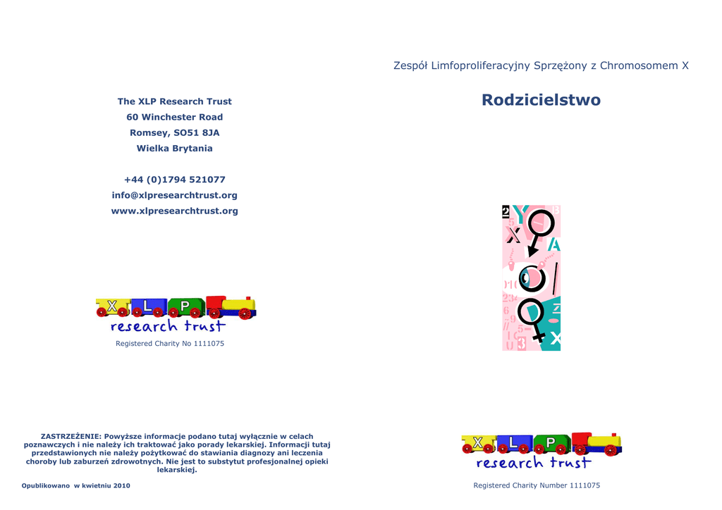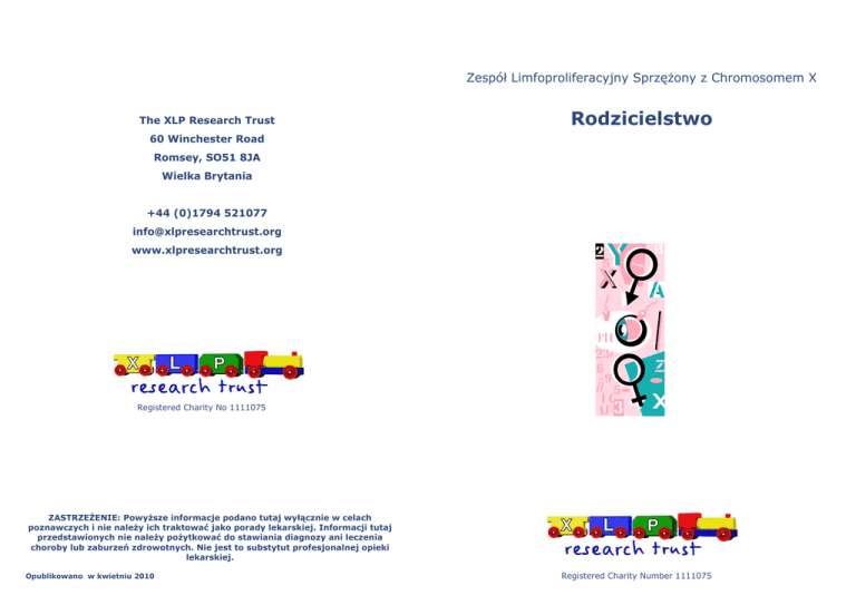 Zespół Limfoproliferacyjny Sprzężony z Chromosomem X The XLP Research Trust Rodzicielstwo 60 Winchester Road Romsey, SO51 8JA Wielka Brytania +44 (0)1794 521077 [email protected] www.xlpresearchtrust.org Registered Charity No 1111075 ZASTRZEŻENIE: Powyższe informacje podano tutaj wyłącznie w celach poznawczych i nie należy ich traktować jako porady lekarskiej. Informacji tutaj przedstawionych nie należy pożytkować do stawiania diagnozy ani leczenia choroby lub zaburzeń zdrowotnych. Nie jest to substytut profesjonalnej opieki lekarskiej. Opublikowano w kwietniu 2010 Registered Charity Number 1111075 Wprowadzenie Zespół limfoproliferacyjny sprzężony z chromosomem X (ang. X-Linked Lymphoproliferative Syndrome – XLP) to rzadka, dziedziczna choroba, która jest przekazywana z pokolenie na pokolenie. Notuje się jednak przypadki XLP u osób bez historii zachorowań w rodzinie. Celem tej ulotki jest wyjaśnienie prawdopodobieństwa przekazywania XLP przez chore osoby kolejnym pokoleniom. Kobiety nosicielki XLP Pytanie: Moja córka jest nosicielką XLP. Jakie jest prawdopodobieństwo, że jej dziecko zachoruje na XLP? Odpowiedź: Jeśli Pani córka będzie miała dzieci z partnerem, który nie jest dziedzicznie obciążony XLP, to: W przypadku każdej ciąży istnieje 1 szansa na 4, że będą mieli: • Chłopca z XLP • Chłopca, który nie będzie nosicielem XLP, i który nie przekaże choroby swoim dzieciom • Dziewczynkę, która nie będzie chora na XLP, lecz która będzie nosicielką tego genu. • Dziewczynkę, które nie będzie chora na XLP i która nie będzie nosicielką genu XLP. Podsumowanie. W przypadku kobiet nosicielek XLP istnieje 50% prawdopodobieństwo, że będą miały dziecko z XLP. Istnieje 25% prawdopodobieństwo urodzenia chłopca chorego na XLP i 25% prawdopodobieństwo urodzenia dziewczynki, która będzie nosicielką. Chłopcy dotknięci XLP Pytanie: Mój syn ma XLP. Jakie jest prawdopodobieństwo, że jego dzieci będą chore? Odpowiedź: Uderzającą osobliwością chorób związanych z chromosomem X jest to, że ojcowie nie mogą przekazać cech sprzężonych z chromosomem X swoim synom. Nie istnieje przenoszenie choroby z ojca na syna. Jeśli Pani syn będzie miał dzieci z partnerką, która nie jest nosicielką XLP, to: Chłopcy nie będą chorzy i nie przekażą genu XLP swoim dzieciom. Wszystkie dziewczynki będą nosicielkami XLP i potencjalnie przekażą gen XLP swojemu potomstwu. Mężczyzna cierpiący na XLP, u którego zastosowano przeszczep szpiku kostnego jako kurację przeciw XLP może jednak - w wyniku chemioterapii – być bezpłodny. Należy zwrócić się do swojego lekarza, który może zlecić przeprowadzenie testów płodności. Testy genetyczne Dzięki ostatnim postępom w naukach medycznych istnieje obecnie możliwość przeprowadzenia testów na XLP przed zajściem w ciążę. Preimplantacyjny test genetyczny to proces, z którym związane jest badanie mapy genetycznej embrionów powołanych do życia za pomocą technik rozrodu wspomaganego medycznie (ART), jak zapłodnienie in vitro (IVF), oraz wybór określonych, niezaatakowanych przez XLP zarodków i wprowadzenie ich do układu rozrodczego kobiety przed początkiem ciąży.