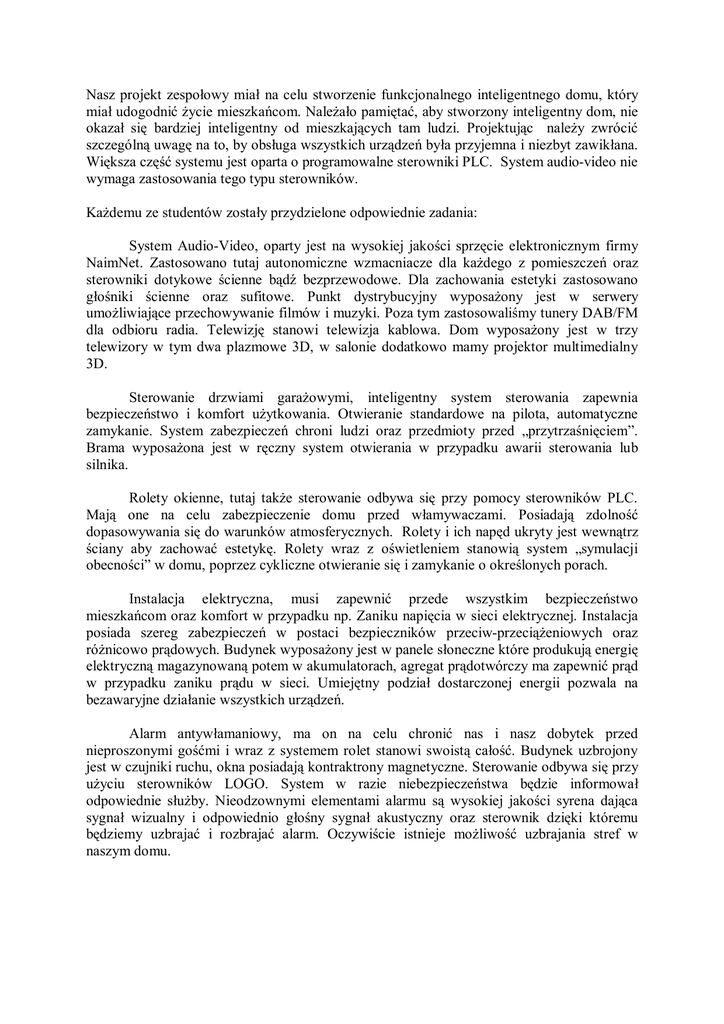 Nasz projekt zespołowy miał na celu stworzenie funkcjonalnego inteligentnego domu, który miał udogodnić życie mieszkańcom. Należało pamiętać, aby stworzony inteligentny dom, nie okazał się bardziej inteligentny od mieszkających tam ludzi. Projektując należy zwrócić szczególną uwagę na to, by obsługa wszystkich urządzeń była przyjemna i niezbyt zawikłana. Większa część systemu jest oparta o programowalne sterowniki PLC. System audio-video nie wymaga zastosowania tego typu sterowników. Każdemu ze studentów zostały przydzielone odpowiednie zadania: System Audio-Video, oparty jest na wysokiej jakości sprzęcie elektronicznym firmy NaimNet. Zastosowano tutaj autonomiczne wzmacniacze dla każdego z pomieszczeń oraz sterowniki dotykowe ścienne bądź bezprzewodowe. Dla zachowania estetyki zastosowano głośniki ścienne oraz sufitowe. Punkt dystrybucyjny wyposażony jest w serwery umożliwiające przechowywanie filmów i muzyki. Poza tym zastosowaliśmy tunery DAB/FM dla odbioru radia. Telewizję stanowi telewizja kablowa. Dom wyposażony jest w trzy telewizory w tym dwa plazmowe 3D, w salonie dodatkowo mamy projektor multimedialny 3D. Sterowanie drzwiami garażowymi, inteligentny system sterowania zapewnia bezpieczeństwo i komfort użytkowania. Otwieranie standardowe na pilota, automatyczne zamykanie. System zabezpieczeń chroni ludzi oraz przedmioty przed „przytrzaśnięciem”. Brama wyposażona jest w ręczny system otwierania w przypadku awarii sterowania lub silnika. Rolety okienne, tutaj także sterowanie odbywa się przy pomocy sterowników PLC. Mają one na celu zabezpieczenie domu przed włamywaczami. Posiadają zdolność dopasowywania się do warunków atmosferycznych. Rolety i ich napęd ukryty jest wewnątrz ściany aby zachować estetykę. Rolety wraz z oświetleniem stanowią system „symulacji obecności” w domu, poprzez cykliczne otwieranie się i zamykanie o określonych porach. Instalacja elektryczna, musi zapewnić przede wszystkim bezpieczeństwo mieszkańcom oraz komfort w przypadku np. Zaniku napięcia w sieci elektrycznej. Instalacja posiada szereg zabezpieczeń w postaci bezpieczników przeciw-przeciążeniowych oraz różnicowo prądowych. Budynek wyposażony jest w panele słoneczne które produkują energię elektryczną magazynowaną potem w akumulatorach, agregat prądotwórczy ma zapewnić prąd w przypadku zaniku prądu w sieci. Umiejętny podział dostarczonej energii pozwala na bezawaryjne działanie wszystkich urządzeń. Alarm antywłamaniowy, ma on na celu chronić nas i nasz dobytek przed nieproszonymi gośćmi i wraz z systemem rolet stanowi swoistą całość. Budynek uzbrojony jest w czujniki ruchu, okna posiadają kontraktrony magnetyczne. Sterowanie odbywa się przy użyciu sterowników LOGO. System w razie niebezpieczeństwa będzie informował odpowiednie służby. Nieodzownymi elementami alarmu są wysokiej jakości syrena dająca sygnał wizualny i odpowiednio głośny sygnał akustyczny oraz sterownik dzięki któremu będziemy uzbrajać i rozbrajać alarm. Oczywiście istnieje możliwość uzbrajania stref w naszym domu. System przeciw pożarowy, ma na celu chronić nasz przed nieszczęśliwymi wypadkami. Ma ostrzec mieszkańców przed niebezpieczeństwem o odpowiednie służby o niebezpieczeństwie – chodzi tu przede wszystkim o pożar. System w przypadku niebezpieczeństwa uruchamia „drogę ewakuacyjną” a mianowicie awaryjne oświetlenie przypodłogowe. Oprócz systemu przeciwpożarowego, w domu znajduje się system wykrywania szkodliwych gazów. Podczas wykrycia wycieku gazu uruchamia się alarm, uruchamiane jest wietrzenie. Oświetlenie, System inteligentnego oświetlenia podobnie jak system Audio działa strefowo. Istnieje możliwość dostosowania natężenia światła dla każdego z pomieszczeń za pomocą pilota bądź naściennego panelu dotykowego. Wraz z systemie rolet stanowi system „system symulacji obecności” w domu. Nasz dom posiada automatyczne oświetlenie posesji uruchamiające się o odpowiedniej porze, oraz w przypadku obecności kogoś w pobliżu – czujniki ruchu. Ogrzewanie, inteligentny system ogrzewania pozwoli automatycznie dopasować temperaturę pomieszczeń zależnie od ustawień. Termostaty przy każdym grzejniku regulują dopływ ciepłej wody a tym samym temperaturę wewnątrz pomieszczenia. Klimatyzacja, wyposażona w odpowiednie czujniki temperatury wyregulować temperaturę pomieszczenia do żądanej szczególnie w upalne dni. pozwala