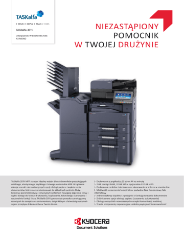DRUK KOPIA SKAN FAKS TASKalfa 3511i URZĄDZENIE WIELOFUNKCYJNE A3 MONO NIEZASTĄPIONY POMOCNIK W TWOJEJ DRUŻYNIE TASKalfa 3511i MFP stanowi idealny wybór dla użytkowników poszukujących solidnego, elastycznego, szybkiego i łatwego w obsłudze MFP. Urządzenie oferuje szeroki zakres dostępnych opcji obsługi papieru i wykończenia dokumentów, które możesz dostosować do aktualnych potrzeb. Duży, kolorowy panel dotykowy z intuicyjnym systemem nawigacji zapewnia łatwy i szybki dostęp do funkcji drukowania, kopiowania, kolorowego skanowania i opcjonalnie funkcji faksu. TASKalfa 3511i gwarantuje ponadto szeroką gamę rozwiązań do zarządzania dokumentem, dzięki którym z łatwością zoptymalizujesz przepływ dokumentów w Twoim biurze. Drukowanie z prędkością 35 stron A4 na minutę 2 GB pamięci RAM, 32 GB SSD + opcjonalnie 320 GB HDD Drukowanie mobilne i sieciowe oraz skanowanie w kolorze w standardzie Możliwość rozszerzenia funkcji faksu: podwójny faks, faks sieciowy, faks internetowy Jednościeżkowy dupleks i 2 podajniki z funkcją obracania dokumentów Zróżnicowane opcje obsługi papieru (zszywanie, dziurkowanie) Obsługa wszystkich nowoczesnych narzędzi komunikacji mobilnej Trwałe komponenty zapewniające unikalną wydajność i niezawodność TASKalfa 3511i została wyposażona w bardzo wytrzymałe komponenty umożliwiające efektywne i niezawodne działanie w aktywnych środowiskach biurowych. Urządzenia zapewniają wysoką wydajność oraz szerokie możliwości indywidualnej konfiguracji, gwarantując jednocześnie minimalny wpływ na środowisko. DANE OGÓLNE Technologia: KYOCERA Laser mono, platforma HyPAS™ Wyświetlacz: Kolorowy panel dotykowy o przekątnej 9 cali (22,8 cm), wielostopniowa regulacja położenia (w zakresie 15 – 90 stopni) Prędkość drukowania i kopiowania: 35/17 stron A4/A3 Rozdzielczość: 600 x 600 dpi, technologia Multi-bit do drukowania z jakością równoważną 9600 x 600 dpi Czas nagrzewania: Ok. 18 sekund lub mniej Czas wydruku pierwszej strony: Ok. 3,6 sek. Procesor: Freescale QorIQ T1024 (Dual Core) 1.0GHz Pamięć: 2 GB pamięci RAM, 32 GB SSD + opcjonalnie 320 GB HDD Interfejsy: USB 2.0 (Hi-Speed) x 4, USB Host 2.0, Fast Ethernet 10BaseT/100BaseTX/1000BaseT, gniazdo dodatkowej karty sieciowej, gniazdo opcjonalnej karty pamięci SD, gniazdo na opcjonalny Fax System Wymiary (szer x głęb x wys): 594x696x680 mm Waga: Ok. 58 kg Napięcie zasilania: AC 220 V ~ 240 V, 50/60 Hz Pobór mocy: Drukowanie: 660 W Tryb gotowości: 120 W Tryb uśpienia: 1 W Poziom hałasu (ISO 7779/ISO 9296): Drukowanie: 46,8 dB(A) LpA, gotowość: 26,1 dB(A) LpA Certyfikaty: GS, TÜV, CE - urządzenie produkowane jest zgodnie z normami jakości ISO 9001, ochrony środowiska ISO 14001 oraz dyrektywą RoHs Dodatkowe możliwości drukowania: Szyfrowany druk bezpośredni PDF, drukowanie IPP, drukowanie e-mail, WSD, wydruk bezpieczny przez SSL, IPsec, SNMPv3, szybkie kopiowanie, funkcja wydruku próbnego, wydruk prywatny, przechowywanie i zarządzanie pracami KOPIOWANIE Maksymalny format oryginału: A3 Kopiowanie ciągłe: 1 – 999 Zakres zoom: 25 – 400% co 1% Stałe współczynniki zoom: 5 zmniejszeń/5 powiększeń Funkcje: Skanuj raz-drukuj wielokrotnie, sorter elektroniczny, 2w1, 4w1, funkcja powtarzania obrazu, numerowanie stron, tryb okładki, broszura, przerwanie kopiowania, szablon formularza, funkcja stemplowania, pomijanie pustych stron Tryby ekspozycji: Automatyczny, ręczny: 16 stopni Wybór oryginału: Tekst + zdjęcie, tekst, zdjęcie, mapa SKANOWANIE Tryby skanowania: Skan do e-mail, skan do FTP, do SMB, do USB Host, do skrzynki, Network TWAIN, WSD Szybkość skanowania: (A4, 300 dpi z DP-7110) 160 obrazów na minutę (mono/kolor) Rozdzielczość: 600 x 600 dpi, 400 x 400 dpi, 300 x 300 dpi, 200 x 400 dpi, 200 x 200 dpi, 200 x 100 dpi (24 bity) Maksymalny obszar skanowania: A3, baner do 1900 mm z opcjonalnym podajnikiem dokumentów Rozpoznawanie oryginału: Tekst, zdjęcie, tekst + zdjęcie, zoptymalizowany pod OCR Typy plików: PDF (skompresowany), przeszukiwalny PDF (opcja), JPEG, TIFF, XPS, Open XPS FAKS (OPCJA) Pojemność wyjściowa: 250 arkuszy drukiem do dołu, maks. 3200 arkuszy Kompatybilność: ITU-T Super G3 Szybkość modemu: Maks. 33,6 kbps Szybkość transmisji: Maks. 3 sekundy (JBIG) Dostępne rozdzielczości: Normal: 200 x 100 dpi Fine: 200 x 200 dpi Superfine: 200 x 400 dpi Ultrafine: 400 x 400 dpi, 600 x 600 dpi Maks. rozmiar oryginału: A3, baner do 1600 mm Metody kompresji: JBIG, MMR, MR, MH Funkcje: Faks internetowy (opcja), faks sieciowy, wysyłanie i odbiór z obrotem obrazu, odbiór faksów 2-stronnych, odbiór do pamięci, skrzynka faksów, zdalna diagnostyka, opcjonalnie druga linia faksowa DRUKOWANIE EKSPLOATACJA OBSŁUGA PAPIERU Wszystkie podane pojemności dotyczą papieru o grubości 0,11 mm. Pojemność wejściowa: 100-kartkowa taca uniwersalna, 45–256 g/m2, A6R–A3, podajnik kasetowy 2 x 500 arkuszy, 60–163 g/m2, A5R–A3; maks. pojemność wejściowa: 4100 ark. A4 Moduł dupleksu: W standardzie, obsługa papieru A5R–A3, 60–160 g/m2 Język kontrolera: PRESCRIBE Emulacje: PCL6 (PCL5c/PCL-XL), KPDL3 (zgodna z PostScript 3), wydruk bezpośredni plików PDF, XPS Obsługiwane systemy operacyjne: Wszystkie aktualne wersje Windows, Mac OS X wersja 10.8 lub wyższa, UNIX LINUX oraz inne według potrzeb Czcionki: 93 czcionki outline (PCL), 136 czcionek (KPDL3), 8 czcionek (Windows Vista), 1 czcionka Bitmap, 45 typów 1-wymiarowych oraz jeden 2-wymiarowy kod kreskowy (PDF-417) TK-7205: Toner na 35 000 stron A4 przy średnim pokryciu 6 % Fax System 12 Internet Fax Kit (A) Scan Extension Kit (A): Skanowanie do przeszukiwalnego pliku PDF (OCR) Obsługa papieru: DP-7100 Podajnik oryginałów: (Rewersyjny), 140 ark., 35 – 160 g/m² (1-stronnie), A6R–A3, baner do 1900 mm DP-7110 Podajnik oryginałów: (Dwustronne jednoprzebiegowe skanowanie) 270 arkuszy, 35 – 220 g/m2 (1-stronny), 50 – 220 g/m2 (2-str
