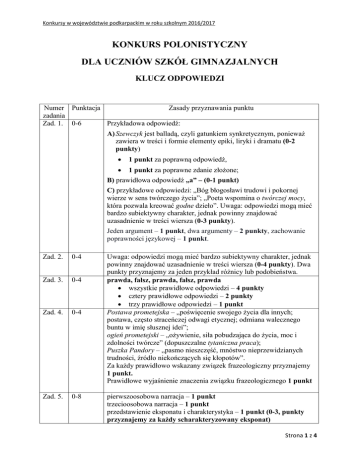 Konkursy w województwie podkarpackim w roku szkolnym 2016/2017 KONKURS POLONISTYCZNY DLA UCZNIÓW SZKÓŁ GIMNAZJALNYCH KLUCZ ODPOWIEDZI Numer Punktacja Zasady przyznawania punktu zadania Zad. 1. 0-6 Przykładowa odpowiedź: A) Szewczyk jest balladą, czyli gatunkiem synkretycznym, ponieważ zawiera w treści i formie elementy epiki, liryki i dramatu (0-2 punkty) 1 punkt za poprawną odpowiedź, 1 punkt za poprawne zdanie złożone; B) prawidłowa odpowiedź „a” – (0-1 punkt) C) przykładowe odpowiedzi: „Bóg błogosławi trudowi i pokornej wierze w sens twórczego życia”; „Poeta wspomina o twórczej mocy, która pozwala kreować godne dzieło”. Uwaga: odpowiedzi mogą mieć bardzo subiektywny charakter, jednak powinny znajdować uzasadnienie w treści wiersza (0-3 punkty). Jeden argument – 1 punkt, dwa argumenty – 2 punkty, zachowanie poprawności językowej – 1 punkt. Zad. 2. 0-4 Zad. 3. 0-4 Zad. 4. 0-4 Zad. 5. 0-8 Uwaga: odpowiedzi mogą mieć bardzo subiektywny charakter, jednak powinny znajdować uzasadnienie w treści wiersza (0-4 punkty). Dwa punkty przyznajemy za jeden przykład różnicy lub podobieństwa. prawda, fałsz, prawda, fałsz, prawda wszystkie prawidłowe odpowiedzi – 4 punkty cztery prawidłowe odpowiedzi – 2 punkty trzy prawidłowe odpowiedzi – 1 punkt Postawa prometejska – „poświęcenie swojego życia dla innych; postawa, często straceńczej odwagi etycznej; odmiana walecznego buntu w imię słusznej idei”; ogień prometejski – „ożywienie, siła pobudzająca do życia, moc i zdolności twórcze” (dopuszczalne tytaniczna praca); Puszka Pandory – „pasmo nieszczęść, mnóstwo nieprzewidzianych trudności, źródło niekończących się kłopotów”. Za każdy prawidłowo wskazany związek frazeologiczny przyznajemy 1 punkt. Prawidłowe wyjaśnienie znaczenia związku frazeologicznego 1 punkt pierwszoosobowa narracja – 1 punkt trzecioosobowa narracja – 1 punkt przedstawienie eksponatu i charakterystyka – 1 punkt (0-3, punkty przyznajemy za każdy scharakteryzowany eksponat) Strona 1 z 4 Konkursy w województwie podkarpackim w roku szkolnym 2016/2017 Zad. 6. Zad. 7. 0-1 0-3 Zad. 8. 0-5 Zad. 9. 0-5 Zad.10. 0-5 Zad.11. 0-5 poprawność językowa – 1 punkt (dopuszczalny jeden błąd ortograficzny i dwa interpunkcyjne; w przypadku większej liczby błędów – nie przyznajemy punktu) wejście w rolę przewodnika – 1 punkt oryginalność konceptu, eksponatów – 1 punkt C średniowiecznej anonimowości a) metaforyczny – 1 punkt Przykładowa odpowiedź: „Tytuł nawiązuje do głównego przesłania powieści, mianowicie poszukiwania prawdziwego, dobrego domu przez Genowefę (Aurelię Jedwabińską). Dobry, ciepły i pogodny dom symbolizował tytułowy rosół. Powiązanie zupy z narkotykiem znajdujemy w rozmowie mamy Aurelii i pani Borejko: – Może to i narkotyk: trochę serca – śmiała się pani Borejko. „Wyjątkowość” tej przyprawy przyciągała Genowefę. trafne odwołanie do treści lektury – 1 punkt wyjaśnienie metaforycznego znaczenia – 1 punkt. a) Lis b) Pilot c) Zwrotniczy d) Król e) Mały Książę Wszystkie odpowiedzi prawidłowe - 5 punktów Jeden błąd – 3 punkty Dwa błędy – 2 punkty Trzy błędy – 1 punkt 5 zdań złożonych, forma monologu wewnętrznego, podkreślenie roli dobra, odwołanie do treści lektury – 5 punktów, 4 zdania złożone – 3 punkty, 3 zdania złożone – 1 punkt, pominięcie jednego z warunków: (formy monologu, podkreślenia roli dobra, odwołania do treści lektury) powoduje odjęcie 1 punktu za każdy wymieniony w nawiasie błąd. a) Przykładowe odpowiedzi: „Dbają o braterskie relacje; opiekują się opuszczonym psem; akceptują i szanują prawo do zachowania ponurej prawdy tylko dla siebie; szanują siebie nawzajem; gdy Bartek rezygnuje z gry w drużynie, kolega nie przyjmuje opaski kapitana; znają swoje sekrety, dochowują tajemnicy, współczują” (0-2 punkty). Punkt przyznajemy za każdy przykład znajdujący uzasadnienie w fabule filmu. b) Przykładowe odpowiedzi: „akcja filmu rozgrywa się w autentycznych plenerach i wnętrzach; ujęcia «z ręki»; użycie długich obiektywów; «zaglądanie» bohaterom w oczy; świadome nawiązanie do konwencji dokumentu; naturalistyczne szczegóły”(0-3 punkty). Punkt przyznajemy za każdy przykład znajdujący uzasadnienie w poetyce filmu. a) Samarytanina, kapłana, Żydami (1 punkt), b) Kapłan i lewita nie chcieli zbliżać się do pobitego również z powodu troski o swą czystość rytualną, ważną w judaizmie(2 Strona 2 z 4 Konkursy w województwie podkarpackim w roku szkolnym 2016/2017 Zad.12. 0-50 punkty), c) Tytuł – (1 punkt), Oryginalny koncept tytułu, wzmacniający przesłanie przypowieści (1 punkt) Kryteria oceny i punktacja: I Warstwa koncepcyjna (0-10) Stopień rozumienia tematu: wyczerpujący, pogłębiony, poszerzony, stanowisko adekwatne do problemu podanego w poleceniu – 10 punktów, poprawny; stanowisko częściowo adekwatne do problemu podanego w poleceniu – 6 punktów, niepełny, stanowisko nieadekwatne do problemu podanego w poleceniu – 3 punkty, brak stanowiska – 0 punktów. II Warstwa semantyczna (zawartość treściowa) (0-15): uczeń zachował odpowiednią liczbę zawartych w pracy informacji; zadbał o ich jakość; zaprezentował trafnie wiedzę o literaturze; prezentował pogłębioną wiedzę o człowieku, życiu, świecie; pracę charakteryzuje spójność semantyczna podporządkowana planowi wewnętrznemu pracy; brak błędów rzeczowych – 15 punktów, rozprawka nie zawiera pełnej argumentacji (co najmniej 3 argumenty); niektóre argumenty odbiegają od tematu i nie zapewniają odpowiedniej jakości wywodu; uczeń prezentuje tylko podstawową wiedzę o literaturze; prezentowane refleksje o człowieku, życiu, świecie mają zbyt ogólny charakter; praca zawiera uchybienia w zakresie spójności semantycznej, choć możemy w niej dostrzec plan