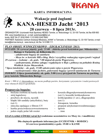 KARTA INFORMACYJNA Wakacje pod żaglami KANA-HESED Jacht ‘2013 28 czerwca – 8 lipca 2013r. ORGANIZATOR: Uczniowski Klub Sportowy HESED Tarnów, ul. Mościckiego 12, 33-100 Tarnów, tel./fax 609 663 654, www.hesedtarnow.pl , e-mail: [email protected], konto: BGŻ SA 27 2030 0045 1110 0000 0245 5950 PARTNER: Katolickie Centrum Edukacji Młodzieży „KANA” w Tarnowie, ul. Mościckiego 12, 33-100 Tarnów, e-mail: [email protected], www.kana.pl, tel./fax 14 6 888 111 PLAN OBOZU WYPOCZYNKOWO – EDUKACYJNEGO ‘2013: WYJAZD: 28 czerwca( piątek), godz. 21:00 – zbiórka przed kościołem par. Miłosierdzia Bożego w Tarnowie, ul. Klikowska 21. - załadowanie bagaży do autokaru - Msza św .w kościele MB o błog. Boże i szczęśliwy wakacyjny wypoczynek i wyjazd 29 czerwca – (sobota) – ok. godz. 7:00 dojazd do portu Węgorzewo, - zaokrętowanie, drobne zakupy i wypłynięcie w Rejs z północy na południe Krainą Wielkich Jezior Mazurskich. 7 lipca (niedziela) – ok. godz. 15:00 zakończenie rejsu w porcie Węgorzewo. - wyokrętowanie i klar jachtów, pakowanie bagaży i powrót autokarem do Tarnowa POWRÓT: 8 lipca (poniedziałek), ok. godz. 5:00 (rano) przyjazd do Tarnowa na parking przy kościele Miłosierdzia Bożego Koszt = 990 zł. (+ kieszonkowe na nocne podboje portów, korzystanie z pryszniców i toalet portowych oraz własnych innych upodobań). Propozycja bagażu: - bielizna osobista na każdy dzień strój kąpielowy przybory do mycia, ręcznik klapki lub sandały (antyśliskie), buty (szt.1) mleczka opalające z filtrem UV kurtka przeciwdeszczowosztormowa jeden ciepły polar lub sweter - koszula długorękawnoantykomarowa (szt.1), koszulki krótkorękawne krótkospodnie (1 szt.), długospodnie (szt.1) fotoaparat, lornetka preparat antykomarowoodstraszający śpiwór …inne STAN ŁASKI UŚWIĘCAJĄCEJ (codzienne uczestnictwo we Mszy św. i modlitwie) Dla chętnych spotkanie informacyjne (UCZESTNIK + RODZIC) 24 czerwca (poniedziałek) o godz. 19:00 w KANIE KULTURA AKTYWNOŚĆ NAUKA ANIMACJA