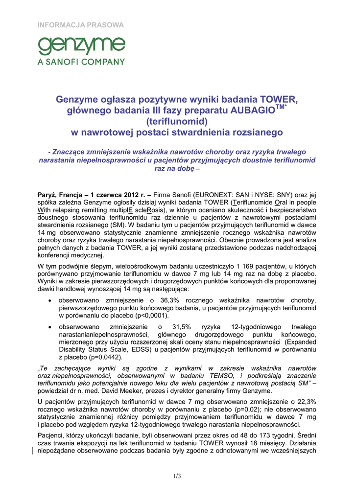 INFORMACJA PRASOWA Genzyme ogłasza pozytywne wyniki badania TOWER, głównego badania III fazy preparatu AUBAGIOTM* (teriflunomid) w nawrotowej postaci stwardnienia rozsianego - Znaczące zmniejszenie wskaźnika nawrotów choroby oraz ryzyka trwałego narastania niepełnosprawności u pacjentów przyjmujących doustnie teriflunomid raz na dobę – Paryż, Francja – 1 czerwca 2012 r. – Firma Sanofi (EURONEXT: SAN i NYSE: SNY) oraz jej spółka zależna Genzyme ogłosiły dzisiaj wyniki badania TOWER (Teriflunomide Oral in people With relapsing remitting multiplE scleRosis), w którym oceniano skuteczność i bezpieczeństwo doustnego stosowania teriflunomidu raz dziennie u pacjentów z nawrotowymi postaciami stwardnienia rozsianego (SM). W badaniu tym u pacjentów przyjmujących teriflunomid w dawce 14 mg obserwowano statystycznie znamienne zmniejszenie rocznego wskaźnika nawrotów choroby oraz ryzyka trwałego narastania niepełnosprawności. Obecnie prowadzona jest analiza pełnych danych z badania TOWER, a jej wyniki zostaną przedstawione podczas nadchodzącej konferencji medycznej. W tym podwójnie ślepym, wieloośrodkowym badaniu uczestniczyło 1 169 pacjentów, u których porównywano przyjmowanie teriflunomidu w dawce 7 mg lub 14 mg raz na dobę z placebo. Wyniki w zakresie pierwszorzędowych i drugorzędowych punktów końcowych dla proponowanej dawki handlowej wynoszącej 14 mg są następujące: obserwowano zmniejszenie o 36,3% rocznego wskaźnika nawrotów choroby, pierwszorzędowego punktu końcowego badania, u pacjentów przyjmujących teriflunomid w porównaniu do placebo (p<0,0001). obserwowano zmniejszenie o 31,5% ryzyka 12-tygodniowego trwałego narastanianiepełnosprawności, głównego drugorzędowego punktu końcowego, mierzonego przy użyciu rozszerzonej skali oceny stanu niepełnosprawności (Expanded Disability Status Scale, EDSS) u pacjentów przyjmujących teriflunomid w porównaniu z placebo (p=0,0442). „Te zachęcające wyniki są zgodne z wynikami w zakresie wskaźnika nawrotów oraz niepełnosprawności, obserwowanymi w badaniu TEMSO, i podkreślają znaczenie teriflunomidu jako potencjalnie nowego leku dla wielu pacjentów z nawrotową postacią SM” – powiedział dr n. med. David Meeker, prezes i dyrektor generalny firmy Genzyme. U pacjentów przyjmujących teriflunomid w dawce 7 mg obserwowano zmniejszenie o 22,3% rocznego wskaźnika nawrotów choroby w porównaniu z placebo (p=0,02); nie obserwowano statystycznie znamiennej różnicy pomiędzy przyjmowaniem teriflunomidu w dawce 7 mg i placebo pod względem ryzyka 12-tygodniowego trwałego narastania niepełnosprawności. Pacjenci, którzy ukończyli badanie, byli obserwowani przez okres od 48 do 173 tygodni. Średni czas trwania ekspozycji na lek teriflunomid w badaniu TOWER wynosił 18 miesięcy. Działania niepożądane obserwowane podczas badania były zgodne z odnotowanymi we wcześniejszych 1/3 badaniach klinicznych nad zastosowaniem teriflunomidu w leczeniu SM. Do najpowszechniejszych działań niepożądanych, obserwowanych częściej w grupie przyjmującej teriflunomid, należały ból głowy, wzrost aktywności ALT (aminotransferazy alaninowej), przerzedzenie włosów, biegunka, nudności i neutropenia. Nastąpił jeden zgon z powodu infekcji dróg oddechowych w grupie przyjmującej placebo oraz trzy zgony w grupie przyjmującej teriflunomid: z powodu wypadku komunikacyjnego, samobójstwa i posocznicy. Zgłoszenia rejestracyjne teriflunomidu w leczeniu nawrotowych postaci SM są obecnie poddawane ocenie przez amerykańską Agencję ds. Żywności i Leków (FDA), Europejską Agencję ds. Leków (EMA) oraz inne władze rejestracyjne. Informacje o Teriflunomidzie Teriflunomid, stosowany w postaci tabletki doustnej raz na dobę, to immunomodulator o unikalnym mechanizmie działania. Mimo że mechanizm działania teriflunomidu nie został w pełni poznany, badania potwierdzają, że teriflunomid blokuje proliferację oraz działanie aktywowanych limfocytów T oraz B – uważanych za odpowiedzialne za uszkadzające procesy zapalne w stwardnieniu rozsianym, jednocześnie zapewniając prawidłową funkcję immunologiczną. Teriflunomid oceniany jest w ramach szeroko zakrojonego programu badań klinicznych, który ma objąć ponad 5 000 pacjentów w 36 krajach. Pięć badań klinicznych oceniających skuteczność teriflunomidu zostało ukończonych lub jest w toku, co sprawia, że ten program badań klinicznych jest jednym z największych w zakresie aktualnie opracowywanych terapii stwardnienia rozsianego. Teriflunomid był badany w trzech wieloośrodkowych badaniach III fazy u pacjentów z nawrotową postacią SM, w tym w ramach ukończonych badań TEMSO oraz TENERE i badaniu TOWER. W innym trwającym obecnie badaniu fazy III TOPIC oceniane jest stosowanie teriflunomidu we wczesnym stadium stwardnienia rozsianego, a także w pierwszym izolowanym zespole objawów neurologicznych (CIS). Teriflunomid jest również oceniany jako terapia wspomagająca w uzupełnieniu do interferonu-β w badaniu fazy III TERACLES. Teriflunomid, stosowany w sposób ciągły do 10 lat w rozszerzeniu badania klinicznego fazy II, cechuje się najdłuższym doświadczeniem klinicznym ze wszystkich badanych terapii doustnych stwardnienia rozsianego. *AUBAGIO™ to nazwa zastrzeżona preparatu zawierającego eksperymentalny lek teriflunomid stosowany w leczeniu SM złożona do władz rejestracyjnych. Informacje o TOWER TOWER to podwójnie ślepe, wieloośrodkowe badanie kliniczne III fazy prowadzone w grupach równoległych z kontrolą placebo skuteczności i bezpieczeństwa stosowania teriflunomidu u pacjentów z nawrotową postacią SM wraz z przedłużeniem badania metodą otwartej próby. Do badania TOWER włączano pacjentów w wieku od 18 do 55 lat. Pierwszorzędowym punktem końcowym był roczny wskaźnik nawrotów choroby, definiowany jako liczba potwierdzonych nawrotów w przeliczeniu na pacjento-rok. Głów