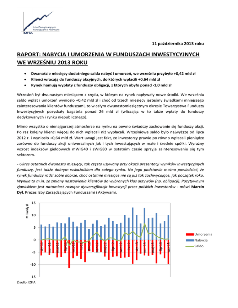 11 października 2013 roku RAPORT: NABYCIA I UMORZENIA W FUNDUSZACH INWESTYCYJNYCH WE WRZEŚNIU 2013 ROKU Dwanaście miesięcy dodatniego salda nabyć i umorzeń, we wrześniu przybyło +0,42 mld zł Klienci wracają do funduszy akcyjnych, do których wpłacili +0,64 mld zł Rynek hamują wypłaty z funduszy obligacji, z których ubyło ponad -1,0 mld zł Wrzesień był dwunastym miesiącem z rzędu, w którym na rynek napływały nowe środki. We wrześniu saldo wpłat i umorzeń wyniosło +0,42 mld zł i choć od trzech miesięcy jesteśmy świadkami mniejszego zainteresowania klientów funduszami, to w całym dwunastomiesięcznym okresie Towarzystwa Funduszy Inwestycyjnych pozyskały bagatela ponad 26 mld zł (wliczając w to także wpłaty do funduszy dedykowanych i rynku niepublicznego). Mimo wszystko o nienajgorszej atmosferze na rynku na pewno świadczy zachowanie się funduszy akcji. Po raz kolejny klienci więcej do nich wpłacali niż wypłacali. Wrześniowe saldo było najwyższe od lipca 2012 r. i wyniosło +0,64 mld zł. Wart uwagi jest fakt, że inwestorzy prawie po równo wpłacali pieniądze zarówno do funduszy akcji uniwersalnych jak i tych inwestujących w małe i średnie spółki. Wyraźny wzrost indeksów giełdowych mWIG40 i sWIG80 w ostatnim czasie sprzyja zainteresowaniu się tym sektorem. - Okres ostatnich dwunastu miesięcy, tak często używany przy okazji prezentacji wyników inwestycyjnych funduszy, jest także dobrym wskaźnikiem dla całego rynku. Na jego podstawie można powiedzieć, że rynek funduszy radzi sobie dobrze, choć ostatnie miesiące nie są już tak zachwycające, jak początek roku. Wynika to m.in. ze zmiany nastawienia klientów do wybranych klas aktywów (np. obligacji). Pozytywnym zjawiskiem jest natomiast rosnąca dywersyfikacja inwestycji przez polskich inwestorów - mówi Marcin Dyl, Prezes Izby Zarządzających Funduszami i Aktywami. Źródło: IZFiA O ile jednak fundusze akcji były główną siłą napędową w minionym miesiącu, z pewnością nie były nią fundusze obligacji. To właśnie ta klasa aktywów pociągnęła w dół wrześniowe saldo. Inwestorzy wypłacili z nich ponad -1,0 mld zł. Jedynie fundusze obligacji korporacyjnych utrzymały dodatnie saldo wpłat i umorzeń, zresztą nie pierwszy raz w ciągu minionych kilku miesięcy. Środki wciąż płyną także do funduszy rynku pieniężnego, traktowanych przez większość inwestorów jako najbardziej bezpieczne. We wrześniu trafiło do nich +195 mln zł, znacząco mniej niż w poprzednich miesiącach. Fundusze rynku pieniężnego w największym stopniu przyczyniały się w tym okresie do wzrostu rynku funduszy. Zwiększona skłonność do ryzyka i chęć osiągania wyższych zysków może nieco zmienić tę sytuację na korzyść wspomnianych funduszy akcji czy innych funduszy z ich udziałem. Kategoria funduszy Nabycia Umorzenia Saldo Saldo od początku roku Akcyjne 3773 -3131,5 641,5 2658,5 Uniwersalne 2924,7 -2638,1 286,6 1656,3 Sektorowe 140,5 -87,2 53,3 138,5 Małych i Średnich Spółek 707,8 -406,2 301,6 863,7 Mieszane 1262,6 -1122,5 140,1 756,0 Aktywnej Alokacji 427,3 -239,0 188,3 887,4 Zrównoważone 314,8 -333,6 -18,8 -443,9 Ochrony Kapitału 100,0 -114,8 -14,8 -110,4 Stabilnego Wzrostu 406,1 -425,3 -19,2 229,9 Inne 14,4 -9,8 4,6 193,0 Dłużne 2259,1 -3296,6 -1037,5 778,0 Bez głównej waluty 1294,4 -1528,0 -233,6 1623,8 Złotówkowe 947,1 -1735,3 -788,2 -970,1 Inne waluty 17,6 -33,3 -15,7 124,3 Gotówkowe i Rynku Pieniężnego 2158,4 -1963,0 195,4 5588,3 Absolutnej stopy zwrotu 197,0 -100,5 96,5 669,0 Surowcowe 45,2 -47,5 -2,3 -149,0 Rynku niepublicznego* 416,2 -27,3 388,9 7173,6 422,6 17474,4 -142,0 818,1 Suma końcowa W tym fundusze dedykowane: 10111,5 -9688,9 2234,7 -2038,5 Źródło: IZFiA (dane w mln zł, niektóre wartości zaokrąglone) * Fundusze aktywów niepublicznych, nieruchomości i sekurytyzacyjne Raport przygotował: Zespół Izby Zarządzających Funduszami i Aktywami Raport powstał na bazie 428 funduszy, które zaraportowały do IZFiA. Izba Zarządzających Funduszami i Aktywami jest organizacją zrzeszającą, na zasadach dobrowolności, działające w Polsce towarzystwa funduszy inwestycyjnych, działa na mocy ustawy z dnia 27 maja 2004 roku o funduszach inwestycyjnych (Dz. U. Nr 146 poz. 1546 ze zmianami). Izba została powołana 28 października 2004 roku (wcześniej – od 1997 roku środowisko było reprezentowane przez Stowarzyszenie Towarzystw Funduszy Inwestycyjnych, którego następcą jest Izba). Członkami Izby jest obecnie 15 działających w Polsce towarzystw funduszy inwestycyjnych. Kontakt: Izba Zarządzających Funduszami i Aktywami ul. Książęca 4 00-498 Warszawa Mail: [email protected] Tel. 22 537 76 30