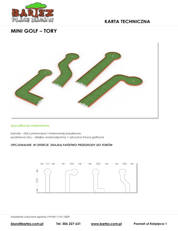 KARTA TECHNICZNA MINI GOLF – TORY Specyfikacja materiałowa: banda - stal cynkowana i malowanej proszkowo, podstawa toru - sklejka wodoodporna + sztuczna trawa golfowa OPCJONALNIE W OFERCIE ZNAJDĄ PAŃSTWO PRZESZKODY DO TORÓW Urządzenie wykonane zgodnie z PN-EN 1176:1-2009 [email protected] Tel. 506 227 631 www.bartez.com.pl Poznań ul Książęca 1