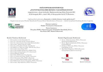 OGÓLNOPOLSKA KONFERENCJA „STATYSTYKA W SŁUŻBIE BIZNESU I NAUK SPOŁECZNYCH” zorganizowana z okazji obchodów Międzynarodowego Roku Statystyki 2013 25-26 listopada 2013 r., Aula F-401, ul. Kawęczyńska 36, 03-772 Warszawa Ogólnopolska konferencja „Statystyka w służbie biznesu i nauk społecznych” Organizowana jest przez Wydział Menedżerski Wyższej Szkoły Menedżerskiej w Warszawie – Zakład Zarządzania Produkcją Jakością i Logistyką Patronat naukowy: Polskie Towarzystwo Statystyczne Patron honorowy: Prezydent WSM w Warszawie prof. dr Stanisław Dawidziuk, Dr h.c. Pan Prezes BCC Marek Goliszewski Komitet Naukowy Konferencji Komitet Organizacyjny Konferencji Prof. dr hab. Czesław Domański, UŁ Prof. UE w Poznaniu dr hab. Grażyna Dehnel Prof. UE w Katowicach dr hab. Zofia Mielecka-Kubień Prof. dr hab. Andrzej Ochocki, UKSW Prof. UE we Wrocławiu Dr hab. Zofia Rusnak Prof. RNDr. Lev Bukovský, DrSc., ISM Slovakia, Presov Prof. dr hab. Teresa Słaby, SGH Prof. dr hab. Bogdan Stefanowicz, WSISiZ PAN Prof. dr hab. Grażyna Trzpiot, UE w Katowicach Dr Józef Bielecki, GFKM Prof. SGH i WSM dr hab. Ewa Frątczak Prof. zw. dr hab. Jan Kordos, WSM w Warszawie Prof. dr hab. Janusz Mika, WSM w Warszawie Prof. zw. dr hab. Marian Daniluk, WSM w Warszawie Prof. WSM dr hab. Krystyna Poznańska, WSM w Warszawie Prof. dr hab. Alicja Sajkiewicz, WSM w Warszawie Dr inż. Alfreda Kamińska, WSM w Warszawie [email protected] Dr inż. Marek Lewandowski, WSM w Warszawie [email protected] Dr Bartosz Witkowski, WSM w Warszawie [email protected] Mgr Maciej Pałygiewicz, WSM wWarszawie [email protected] Patronat honorowy 1 Sponsor konferencji Informacje ogólne Rok 2013 został ogłoszony Międzynarodowym Rokiem Statystyki („Statistics 2013”, por. www.statistics2013.org). Jest to ogólnoświatowe przedsięwzięcie mające na celu podkreślenie znaczenia i roli statystyki we współczesnym świecie, w jego wszystkich wymiarach. Globalna inicjatywa – wspierana jest przez ponad 1850 organizacji na świecie. Rozwój statystyki definiowanej w wymiarze teorii jak i aplikacji modelowych (zastosowań) – wyraźnie uległ przyspieszeniu i upowszechnieniu w drugiej połowie XX wieku. Proces upowszechnienia następował głównie dzięki postępowi technologii. Era techniki komputerowej sprawiła, że większość metod i modeli statystycznych została oprogramowana w różnych pakietach statystycznych, co niewątpliwie przyczyniło się do wzrostu liczby zastosowań statystyki w wielu dziedzinach życia naukowego, społecznego, politycznego i biznesowego. Ostatnie 25 lat XX i XXI świadczy o tym, że statystyczne modelowanie obejmuje nie tylko takie dyscypliny jak: ekonomię, socjologię, psychologię, medycynę, nauki przyrodnicze, nauki o ziemi itd., ale intensywnie wkroczyło do finansów (analiza rynków finansowych) do marketingu (analizy i badania marketingowe) do telekomunikacji – można rzec do szeroko definiowanego biznesu i zarządzania. Tym znaczącym zmianom towarzyszył rozwój nie tylko aplikacji ale nowych metod estymacji, konieczności radzenia sobie zarówno z małymi jak i dużymi zbiorami danych oraz – rozwój zaawansowanych metod analiz statystycznych na użytek analiz biznesowych (advanced business analytics). Zakres tematyczny przemian w zakresie użyteczności statystycznego modelowania jest bardzo pojemny i wielowątkowy, można rzec – wielodyscyplinarny. Nawiązując do przemian ostatnich 25 lat w zakresie zastosowań statystyki – podjeliśmy trud organizacji konferencji naukowej „Statystyka w służbie biznes i nauk społecznych”. Organizacją konferencji „Statystyka w służbie biznesu i badań społecznych” wpisujemy się w ogólnoświatową inicjatywę i dołączamy jako środowisko akademickie i naukowe do społeczności międzynarodowej. Cele konferencji – tematyka Zgodnie z celami Międzynarodowego Roku Statystyki, celem naszej konferencji jest zwiększenie publicznej świadomości znaczenia i wpływu statystyki na wszystkie aspekty życia społecznego i gospodarczego, a szczególnie na jej wykorzystanie i twórcze rozwinięcie w biznesie i naukach społecznych. Tematyka konferencji dotyczy następujących problemów: a. Wykorzystanie statystycznego myślenia i statystyki w: ekonomii, finansach i naukach o zarządzaniu. b. Wykorzystanie statystycznego myślenia i statystyki w biznesie (ubezpieczeniach, telekomunikacji, bankowości, marketingu, przedsiębiorczości, produkcji, inżynierii, logistyce, medycynie, doświadczalnictwie, farmacji). c. Statystyka małych, średnich i dużych przedsiębiorstw. d. Statystyka w badaniach i naukach społecznych (rynku pracy, poziomie życia, procesów ludnościowych, polityce społecznej, psychologii, socjologii), e. Przemiany statystycznego myślenia w: nauce, procesie dydaktycznym, zarządzaniu, zastosowaniach biznesowych. f. BIG DATA – DATA QUALITY – wyzwaniem dla statystyki w służbie biznesu i nauk społecznych. 2 OGÓLNOPOLSKA KONFRERENCJA „STATYSTYKA W SŁUŻBIE BIZNESU I NAUK SPOŁECZNYCH” 25-26 listopada 2013 roku PROGRAM: z – referat zaproszony 25.XI.2013 PIERWSZY DZIEŃ KONFERENCJI 13.30 – 14.00 Rejestracja 14.00 – 14.30 Aula F-401 Otwarcie konferencji: Przywitanie uczestników: dr inż. Alfreda Kamińska, Dziekan Wydziału Menedżerskiego WSM Wystąpienia: Prezes Polskiego Towarzystwa Statystycznego prof. dr hab. Czesław Domański JE Prezydent WSM w Warszawie prof. dr Stanisław Dawidziuk, Dr h.c. SESJA I. Przewodniczący: Prof. Czesław Domański 14.30 – 16.00 Aula F-401 16.00 – 16.30 1. Janina Jóźwiak – z (SGH) European Doctoral School of Demography – innowacyjny program doktorski 2. Zofia Mielecka-Kubień – z (UE, Katowice) Zastosowanie metod statystycznych w badaniu nadumieralności mężczyzn w Polsce 3. Małgorzata Podogrodzka (SGH) Wpływ przestrzennego poziomu agregacji danych na wyniki powiązań poziomu bezrobocia z procesem zawierania i rozpadu małże