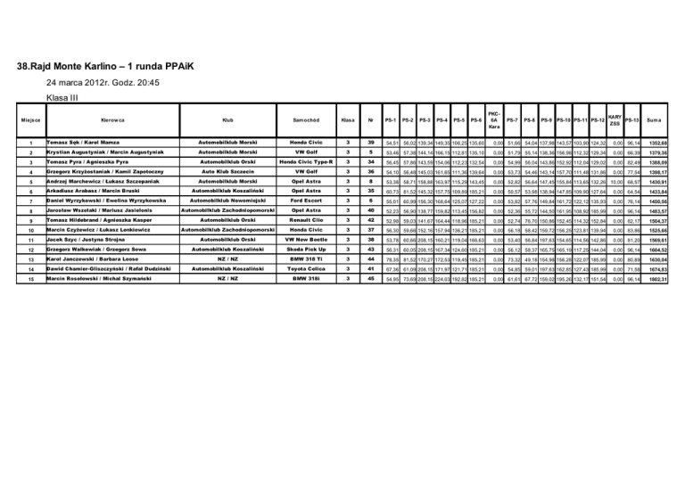 38.Rajd Monte Karlino – 1 runda PPAiK 24 marca 2012r. Godz. 20:45 Klasa III Miejsce Kierow ca Klub Sam ochód Klasa Nr PS-1 PS-2 PS-3 PS-4 PS-5 PS-6 PKC6A Kara PS-7 PS-8 PS-9 PS-10 PS-11 PS-12 KARY PS-13 ZSS Sum a 1 Tomasz Sęk / Karol Mamza Automobilklub Morski Honda Civic 3 39 54,51 56,02 139,34 149,35 106,25 135,60 0,00 51,66 54,04 137,98 143,57 103,90 124,32 0,00 96,14 1352,68 2 Krystian Augustyniak / Marcin Augustyniak Automobilklub Morski VW Golf 3 5 53,46 57,38 144,14 166,15 112,81 135,10 0,00 51,79 55,14 138,36 156,98 112,32 129,34 0,00 66,39 1379,36 3 Tomasz Pyra / Agnieszka Pyra Automobilklub Orski Honda Civic Type-R 3 34 56,45 57,86 143,59 154,06 112,23 132,54 0,00 54,99 56,04 143,86 152,92 112,04 129,02 0,00 82,49 1388,09 4 Grzegorz Krzyżostaniak / Kamil Zapotoczny Auto Klub Szczecin VW Golf 3 36 54,10 56,48 145,03 161,65 111,36 139,64 0,00 53,73 54,46 143,14 157,70 111,48 131,86 0,00 77,54 1398,17 5 Andrzej Marchewicz / Łukasz Szczepaniak Automobilklub Morski Opel Astra 3 8 53,38 58,71 158,88 163,97 115,29 143,45 0,00 52,82 56,64 147,45 155,84 113,65 132,26 10,00 68,57 1430,91 6 Arkadiusz Arabasz / Marcin Bruski Automobilklub Koszaliński Opel Astra 3 35 60,73 81,52 145,32 157,75 109,89 185,21 0,00 50,57 53,98 138,94 147,85 109,90 127,64 0,00 64,54 1433,84 7 Daniel Wyrzykowski / Ewelina Wyrzykowska Automobilklub Nowomiejski Ford Escort 3 6 55,01 60,99 156,30 168,64 125,07 127,22 0,00 53,82 57,76 149,84 161,72 122,12 135,93 0,00 76,14 1450,56 8 Jarosław Wszelaki / Mariusz Jasielonis Automobilklub Zachodniopomorski Opel Astra 3 40 52,23 56,90 138,77 159,82 113,45 156,82 0,00 52,36 55,72 144,50 161,95 108,92 185,99 0,00 96,14 1483,57 9 Tomasz Hildebrand / Agnieszka Kasper Automobilklub Orski Renault Clio 3 42 52,98 59,03 141,67 164,44 118,96 185,21 0,00 52,74 76,70 150,86 152,45 114,32 152,84 0,00 82,17 1504,37 10 Marcin Czyżewicz / Łukasz Lenkiewicz Automobilklub Zachodniopomorski Honda Civic 3 37 56,30 59,66 152,16 157,94 136,21 185,21 0,00 56,18 58,42 159,72 156,25 123,81 139,94 0,00 83,86 1525,66 11 Jacek Szyc / Justyna Strojna Automobilklub Orski VW New Beetle 3 38 53,78 60,66 208,15 160,21 119,04 166,63 0,00 53,40 56,84 197,63 154,65 114,56 142,86 0,00 81,20 1569,61 12 Grzegorz Walkowiak / Grzegorz Sowa Automobilklub Koszaliński Skoda Pick Up 3 43 56,31 60,05 208,15 167,34 124,60 185,21 0,00 56,12 58,37 165,75 165,19 117,25 144,04 0,00 96,14 1604,52 13 Karol Janczewski / Barbara Loose NZ / NZ BMW 318 Ti 3 44 78,35 81,52 170,27 172,53 119,45 185,21 0,00 73,32 49,18 154,98 156,28 122,07 185,99 0,00 80,89 1630,04 14 Dawid Chamier-Gliszczyński / Rafał Dudziński Automobilklub Koszaliński Toyota Celica 3 41 67,36 61,09 208,15 171,97 121,71 185,21 0,00 54,85 59,01 197,63 162,85 127,43 185,99 0,00 71,58 1674,83 15 Marcin Rosołowski / Michal Szymański NZ / NZ BMW 318i 3 45 54,95 73,69 208,15 224,03 192,82 185,21 0,00 61,61 67,72 159,02 195,26 132,17 151,54 0,00 96,14 1802,31