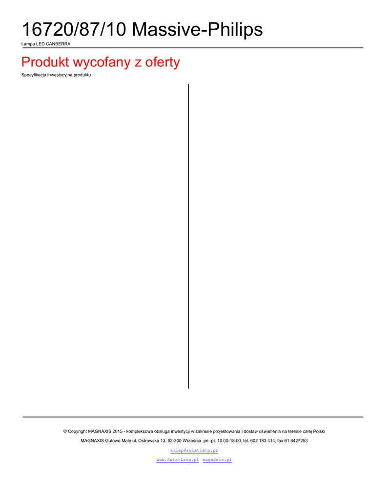 16720/87/10 Massive-Philips Lampa LED CANBERRA Produkt wycofany z oferty Specyfikacja inwestycyjna produktu © Copyright MAGNAXIS 2015 - kompleksowa obsługa inwestycji w zakresie projektowania i dostaw oświetlenia na terenie całej Polski MAGNAXIS Gutowo Małe ul. Ostrowska 13, 62-300 Września pn.-pt. 10:00-18:00, tel. 602 183 414, fax 61 6427253 [email protected] www.SwiatLamp.pl magnaxis.pl