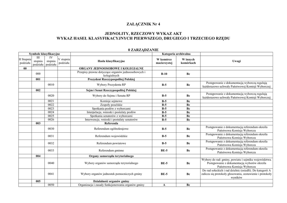 ZAŁĄCZNIK Nr 4 JEDNOLITY, RZECZOWY WYKAZ AKT WYKAZ