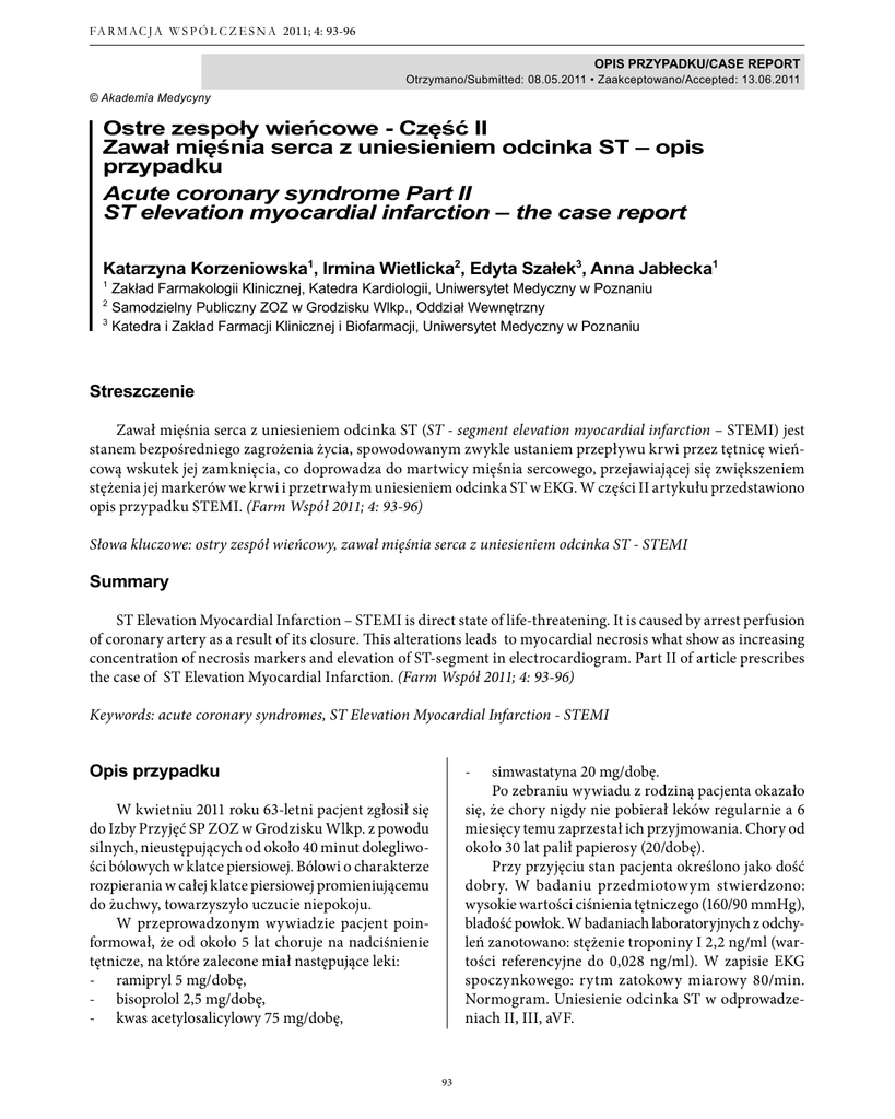 93 FA R M A C J A W S P Ó Ł C Z E S N A 2011; 4: 93-96 OPIS PRZYPADKU/CASE REPORT Otrzymano/Submitted: 08.05.2011 • Zaakceptowano/Accepted: 13.06.2011 © Akademia Medycyny Ostre zespoły wieńcowe - Część II Zawał mięśnia serca z uniesieniem odcinka ST – opis przypadku Acute coronary syndrome Part II ST elevation myocardial infarction – the case report Katarzyna Korzeniowska1, Irmina Wietlicka2, Edyta Szałek3, Anna Jabłecka1 Zakład Farmakologii Klinicznej, Katedra Kardiologii, Uniwersytet Medyczny w Poznaniu Samodzielny Publiczny ZOZ w Grodzisku Wlkp., Oddział Wewnętrzny 3 Katedra i Zakład Farmacji Klinicznej i Biofarmacji, Uniwersytet Medyczny w Poznaniu 1 2 Streszczenie Zawał mięśnia serca z uniesieniem odcinka ST (ST - segment elevation myocardial infarction – STEMI) jest stanem bezpośredniego zagrożenia życia, spowodowanym zwykle ustaniem przepływu krwi przez tętnicę wieńcową wskutek jej zamknięcia, co doprowadza do martwicy mięśnia sercowego, przejawiającej się zwiększeniem stężenia jej markerów we krwi i przetrwałym uniesieniem odcinka ST w EKG. W części II artykułu przedstawiono opis przypadku STEMI. (Farm Współ 2011; 4: 93-96) Słowa kluczowe: ostry zespół wieńcowy, zawał mięśnia serca z uniesieniem odcinka ST - STEMI Summary ST Elevation Myocardial Infarction – STEMI is direct state of life-threatening. It is caused by arrest perfusion of coronary artery as a result of its closure. This alterations leads to myocardial necrosis what show as increasing concentration of necrosis markers and elevation of ST-segment in electrocardiogram. Part II of article prescribes the case of ST Elevation Myocardial Infarction. (Farm Współ 2011; 4: 93-96) Keywords: acute coronary syndromes, ST Elevation Myocardial Infarction - STEMI Opis przypadku - simwastatyna 20 mg/dobę. Po zebraniu wywiadu z rodziną pacjenta okazało się, że chory nigdy nie pobierał leków regularnie a 6 miesięcy temu zaprzestał ich przyjmowania. Chory od około 30 lat palił papierosy (20/dobę). Przy przyjęciu stan pacjenta określono jako dość dobry. W badaniu przedmiotowym stwierdzono: wysokie wartości ciśnienia tętniczego (160/90 mmHg), bladość powłok. W badaniach laboratoryjnych z odchyleń zanotowano: stężenie troponiny I 2,2 ng/ml (wartości referencyjne do 0,028 ng/ml). W zapisie EKG spoczynkowego: rytm zatokowy miarowy 80/min. Normogram. Uniesienie odcinka ST w odprowadzeniach II, III, aVF. W kwietniu 2011 roku 63-letni pacjent zgłosił się do Izby Przyjęć SP ZOZ w Grodzisku Wlkp. z powodu silnych, nieustępujących od około 40 minut dolegliwości bólowych w klatce piersiowej. Bólowi o charakterze rozpierania w całej klatce piersiowej promieniującemu do żuchwy, towarzyszyło uczucie niepokoju. W przeprowadzonym wywiadzie pacjent poinformował, że od około 5 lat choruje na nadciśnienie tętnicze, na które zalecone miał następujące leki: - ramipryl 5 mg/dobę, - bisoprolol 2,5 mg/dobę, - kwas acetylosalicylowy 75 mg/dobę, 93 FA R M A C J A W S P Ó Ł C Z E S N A 2011; 4: 93-96 Rycina 1. Elektrokardiogram przedstawiający uniesienie odcinka ST w II, III, aVF Na podstawie obrazu klinicznego, zapisu EKG i stężenia troponiny I u pacjenta rozpoznano ostry zespół wieńcowy – zawał serca z uniesieniem odcinka ST (STEMI) i zastosowano następujące leki: - clopidogrel 600 mg, - kwas acetylosalicylowy 300 mg, - atorwastatyna 80 mg, - heparyna niefrakcjonowana 5000 jednostek. Chory w trybie natychmiastowym został przekazany do Pracowni Hemodynamiki SPSK nr 2 w Poznaniu celem leczenia inwazyjnego - zabieg angioplastyki wieńcowej – PCI (ang. percutaenous coronary intervention) prawej tętnicy wieńcowej (PTW) z implantacją 2 stentów lekowych, który przebiegł bez powikłań. Po 2 dniach pacjent powrócił do szpitala macierzystego z dokumentacją medyczną potwierdzającą zawał serca STEMI. W wykonanej koronarografii rozpoznano miażdżycę tętnic wieńcowych z krytycznym zwężeniem prawej tętnicy wieńcowej (PTW). 1. pień tętnicy płucnej 2. lewa tętnica wieńcowa 3. gałąź otaczająca 4. żyły wieńcowe 5. prawa tętnica wieńcowa 6. łuk aorty Rycina 3. Unaczynienie serca Przy przyjęciu pacjent w stanie ogólnym dobrym. Przedmiotowo bez odchyleń. W trakcie hospitalizacji wdrożono rehabilitację ogólnoustrojową – nie obserwowano nawrotu bólów wieńcowych. W zapisie EKG obserwowano ewolucję zawału ściany dolnej (pojawienie się patologicznych załamków Q, ujemnych załamków T) (Rycina 4). Rycina 4. Ewolucja krzywej QRS w zawale serca z uniesieniem odcinka ST Rycina 2. Angiogram prawej tętnicy wieńcowej (miejsce zwężenia oznaczone strzałką) Pacjent został wypisany do domu w 7 dobie 94 FA R M A C J A W S P Ó Ł C Z E S N A 2011; 4: 93-96 częstotliwość we wczesnych godzinach rannych, może wynikać z występujących w tym przedziale czasowym wielu czynników: - stymulacji β-adrenergicznej (podwyższone napięcie ściany naczyń i wyższe ciśnienie), - nadkrzepliwości krwi oraz nadmiernej aktywności płytek krwi. Czynności związane z nasiloną stymulacją współczulną i skurczem naczyń, takie jak wysiłek fizyczny czy napięcie emocjonalne, mogą również przyczyniać się do pęknięcia blaszek i zakrzepicy w tętnicach wieńcowych [4,5]. Szybka i trafna diagnoza OZW oraz właściwa stratyfikacja ryzyka u chorego zgłaszającego się do lekarza z bólem zamostkowym pozwala zidentyfikować osoby, u których bezzwłoczna interwencja może poprawić rokowanie. Rozpoznanie wstępne STEMI zwykle opiera się na obecności bólu/dyskomfortu w klatce piersiowej trwającego co najmniej 10-20 minut lub więcej, który nie reaguje na nitroglicerynę. Ból może być również zlokalizowany w nadbrzuszu lub w okolicy międzyłopatkowej. Ważnymi wskazówkami diagnostycznymi są dodatni wywiad w kierunku choroby wieńcowej i promieniowanie bólu do szyi, żuchwy i lewego ramienia. U osób w w