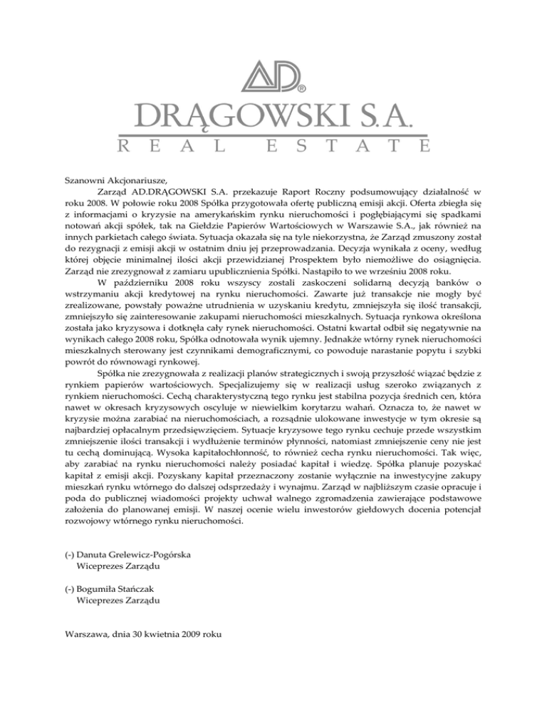 Szanowni Akcjonariusze, Zarząd AD.DRĄGOWSKI S.A. przekazuje Raport Roczny podsumowujący działalność w roku 2008. W połowie roku 2008 Spółka przygotowała ofertę publiczną emisji akcji. Oferta zbiegła się z informacjami o kryzysie na amerykańskim rynku nieruchomości i pogłębiającymi się spadkami notowań akcji spółek, tak na Giełdzie Papierów Wartościowych w Warszawie S.A., jak również na innych parkietach całego świata. Sytuacja okazała się na tyle niekorzystna, że Zarząd zmuszony został do rezygnacji z emisji akcji w ostatnim dniu jej przeprowadzania. Decyzja wynikała z oceny, według której objęcie minimalnej ilości akcji przewidzianej Prospektem było niemożliwe do osiągnięcia. Zarząd nie zrezygnował z zamiaru upublicznienia Spółki. Nastąpiło to we wrześniu 2008 roku. W październiku 2008 roku wszyscy zostali zaskoczeni solidarną decyzją banków o wstrzymaniu akcji kredytowej na rynku nieruchomości. Zawarte już transakcje nie mogły być zrealizowane, powstały poważne utrudnienia w uzyskaniu kredytu, zmniejszyła się ilość transakcji, zmniejszyło się zainteresowanie zakupami nieruchomości mieszkalnych. Sytuacja rynkowa określona została jako kryzysowa i dotknęła cały rynek nieruchomości. Ostatni kwartał odbił się negatywnie na wynikach całego 2008 roku, Spółka odnotowała wynik ujemny. Jednakże wtórny rynek nieruchomości mieszkalnych sterowany jest czynnikami demograficznymi, co powoduje narastanie popytu i szybki powrót do równowagi rynkowej. Spółka nie zrezygnowała z realizacji planów strategicznych i swoją przyszłość wiązać będzie z rynkiem papierów wartościowych. Specjalizujemy się w realizacji usług szeroko związanych z rynkiem nieruchomości. Cechą charakterystyczną tego rynku jest stabilna pozycja średnich cen, która nawet w okresach kryzysowych oscyluje w niewielkim korytarzu wahań. Oznacza to, że nawet w kryzysie można zarabiać na nieruchomościach, a rozsądnie ulokowane inwestycje w tym okresie są najbardziej opłacalnym przedsięwzięciem. Sytuacje kryzysowe tego rynku cechuje przede wszystkim zmniejszenie ilości transakcji i wydłużenie terminów płynności, natomiast zmniejszenie ceny nie jest tu cechą dominującą. Wysoka kapitałochłonność, to również cecha rynku nieruchomości. Tak więc, aby zarabiać na rynku nieruchomości należy posiadać kapitał i wiedzę. Spółka planuje pozyskać kapitał z emisji akcji. Pozyskany kapitał przeznaczony zostanie wyłącznie na inwestycyjne zakupy mieszkań rynku wtórnego do dalszej odsprzedaży i wynajmu. Zarząd w najbliższym czasie opracuje i poda do publicznej wiadomości projekty uchwał walnego zgromadzenia zawierające podstawowe założenia do planowanej emisji. W naszej ocenie wielu inwestorów giełdowych docenia potencjał rozwojowy wtórnego rynku nieruchomości. (-) Danuta Grelewicz-Pogórska Wiceprezes Zarządu (-) Bogumiła Stańczak Wiceprezes Zarządu Warszawa, dnia 30 kwietnia 2009 roku