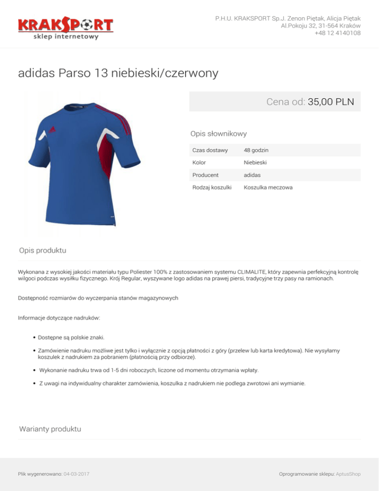 P.H.U. KRAKSPORT Sp.J. Zenon Piętak, Alicja Piętak Al.Pokoju 32, 31-564 Kraków +48 12 4140108 adidas Parso 13 niebieski/czerwony Cena od: 35,00 PLN Opis słownikowy Czas dostawy 48 godzin Kolor Niebieski Producent adidas Rodzaj koszulki Koszulka meczowa Opis produktu Wykonana z wysokiej jakości materiału typu Poliester 100% z zastosowaniem systemu CLIMALITE, który zapewnia perfekcyjną kontrolę wilgoci podczas wysiłku fizycznego. Krój Regular, wyszywane logo adidas na prawej piersi, tradycyjne trzy pasy na ramionach. Dostępność rozmiarów do wyczerpania stanów magazynowych Informacje dotyczące nadruków: Dostępne są polskie znaki. Zamówienie nadruku możliwe jest tylko i wyłącznie z opcją płatności z góry (przelew lub karta kredytowa). Nie wysyłamy koszulek z nadrukiem za pobraniem (płatnością przy odbiorze). Wykonanie nadruku trwa od 1-5 dni roboczych, liczone od momentu otrzymania wpłaty. Z uwagi na indywidualny charakter zamówienia, koszulka z nadrukiem nie podlega zwrotowi ani wymianie. Warianty produktu Plik wygenerowano: 04-03-2017 Oprogramowanie sklepu: AptusShop P.H.U. KRAKSPORT Sp.J. Zenon Piętak, Alicja Piętak Al.Pokoju 32, 31-564 Kraków +48 12 4140108 XL Plik wygenerowano: 04-03-2017 Powered by TCPDF (www.tcpdf.org) 35,00 PLN Oprogramowanie sklepu: AptusShop