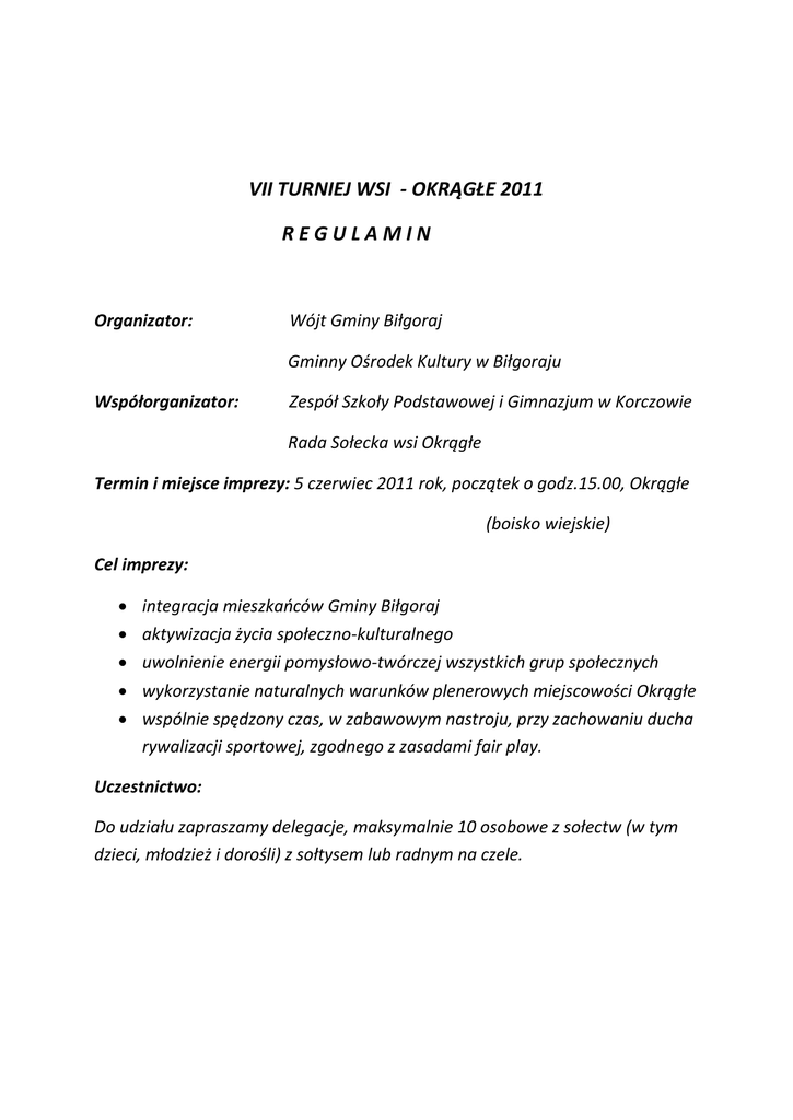 VII TURNIEJ WSI - OKRĄGŁE 2011 REGULAMIN Organizator: Wójt Gminy Biłgoraj Gminny Ośrodek Kultury w Biłgoraju Współorganizator: Zespół Szkoły Podstawowej i Gimnazjum w Korczowie Rada Sołecka wsi Okrągłe Termin i miejsce imprezy: 5 czerwiec 2011 rok, początek o godz.15.00, Okrągłe (boisko wiejskie) Cel imprezy: integracja mieszkaoców Gminy Biłgoraj aktywizacja życia społeczno-kulturalnego uwolnienie energii pomysłowo-twórczej wszystkich grup społecznych wykorzystanie naturalnych warunków plenerowych miejscowości Okrągłe wspólnie spędzony czas, w zabawowym nastroju, przy zachowaniu ducha rywalizacji sportowej, zgodnego z zasadami fair play. Uczestnictwo: Do udziału zapraszamy delegacje, maksymalnie 10 osobowe z sołectw (w tym dzieci, młodzież i dorośli) z sołtysem lub radnym na czele. PROGRAM I. PARADA, KOROWÓD I PREZENTACJA STARTUJĄCYCH DRUŻYN Parada drużyn będzie oceniana. Komisja weźmie pod uwagę pomysł, strój, ogólny wygląd i prezentację korowodu. II. KONKURS KULINARNY Stoisko kulinarne stoisko z potrawami regionalnymi: chleb pieczony domowym sposobem, piróg, bułka drożdżowa, placki, smalec domowy, przetwory z żurawiny, miód, nalewki i inne… Przy okazji stoiska kulinarnego prośba organizatora o przygotowanie dodatkowej tacki z potrawą na poczęstunek dla zaproszonych gości. KONKURSY SPRAWNOŚCIOWE III. Konkurs plastyczny dla Dzieci wspólne malowanie obrazu na zadany temat np. „Moja koleżanka Cyganka” lub „Ubieramy Cygankę” (Organizator zapewnia materiały plastyczne) Konkurencje dla Młodzieży i Dorosłych: IV. Młody Cygan porywa żonę z tłumu widzów (prawdziwe porwanie!) (konkurencja na czas) Cygana obowiązuje strój, kobieta musi byd porwana i zaniesiona w określone miejsce, gdzie na mecie znajduje się krzesełko, na którym ma ją posadzid. V. Cygan kradnie kurę Konkurencja na czas Kura jest umieszczona na wysokości. Zadaniem Cygana jest zdjąd kurę, a następnie dobiec z nią po wyznaczonym torze, żeby w jak najkrótszym czasie przekazad ją Cygance. VI. Cyganka porcjuje kurę Konkurencja na czas Cyganka ma za zadanie w jak najkrótszym czasie poporcjowad kurę i wrzucid do garnka, żeby zatrzed ślady kradzieży Kura ma byd poporcjowana następująco: mają byd odcięte skrzydełka, udka, piersi, szyja, korpus przecięty na pół, odcięty kuper i wszystko ma byd wrzucone do garnka. Potrzebne rekwizyty (deska, nóż, garnek) zawodnicy przywożą ze sobą VII. Cygan oszukuje Konkurencja na czas Cygan coś ukradł Cygance, chowa przy sobie najlepiej jak potrafi, a zadaniem Cyganki jest znaleźd to „coś” w jak najkrótszym czasie. Dodatkowa trudnośd polega na tym, że miesza się pary. Przedmiot nie może byd schowany w bieliźnie! -Wygrywa Cyganka, która w jak najkrótszym czasie znajdzie ukrytą rzecz -Wygrywa Cygan, któremu jak najdłużej uda się ją ukrywad VIII. Rozpoznawanie Cyganki Konkurencja na czas Cyganów ustawiamy w szeregu, zawiązujemy im przepaską oczy, Cyganki ustawiamy naprzeciwko, z tymże zamieniamy miejscami w szeregu. Zadaniem Cygana jest w jak najkrótszym czasie rozpoznad swoją Cygankę. Odwróconą Cygankę rozpoznaje po sylwetce, stroju. Zawodnicy przywożą ze sobą chusteczki do przygotowania przepasek na oczy IX. Popis taneczny – „Cyganka taoczy” Oceniany będzie zarówno taniec jak i strój zawodniczek. Stroje przywożą ze sobą panie startujące w konkurencji X. XI. Cygan śpiewa – „Najpiękniejsze melodie Cygaoske” Oceniany będzie zarówno śpiew jak i strój zawodników. Stroje przywożą ze sobą panowie startujący w konkurencji Konkurencja z wróżbą – „Cyganka prawdę Ci powie…” Konkurencja polega na tym, żeby powróżyd Wójtowi, siedzącemu na scenie. Podchodzi do niego Cyganka i namawia go na wróżbę (ma 3 minuty). Wróży z kart, z ręki, z kuli itp. i mówi przepowiednię dla wójta np. wizja rozwoju wsi, gminy (forma dowolna). Wygrywa najciekawsza, najtrafniejsza i najzabawniejsza prezentacja sceniczna) Postanowienia koocowe Organizator powołuje dwie komisje: Pierwsza komisja ocenia stoiska kulinarne, przewiduje się I, II i III nagrodę oraz wyróżnienia dla pozostałych uczestników Druga komisja ocenia paradę drużyn oraz konkurencje sprawnościowe, przewiduje się nagrody za zajęcie I, II i III miejsca oraz dla pozostałych nagrody za udział Uczestnicy przyjeżdżają własnym transportem Zgłoszenia udziału miejscowości prosimy składad w terminie do 25 maja 2011r. do Gminnego Ośrodka Kultury w Biłgoraju, Tel 84 688 28 53 Organizator zabezpiecza posiłek dla uczestników turnieju Organizator zastrzega sobie prawo interpretacji i dokonywania zmian w regulaminie Serdecznie zapraszamy do wspólnej zabawy!